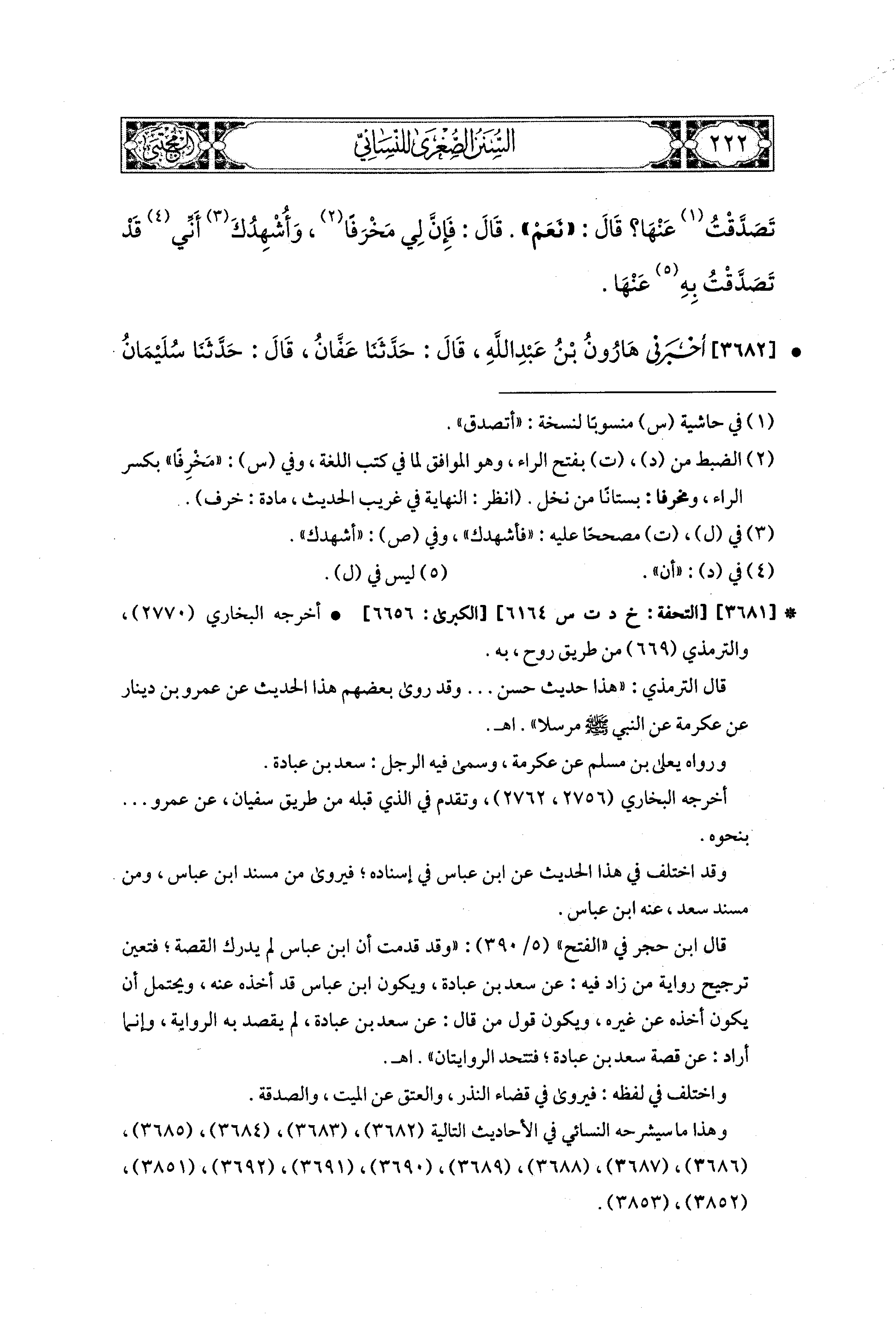 3682- أَخْبَرَني هَارُونُ بْنُ عَبدِ اللهِ، قال: حَدثنا عَفَّانُ، قال: حَدثنا سُلَيمَانُ بْنُ كَثِيرٍ، عَنِ الزُّهْرِيِّ، عَن عُبَيدِ اللهِ بْنِ عَبدِ اللهِ، عَنِ ابنِ عَبَّاسٍ، عَن سَعْدِ بْنِ عُبَادَةَ؛ أَنَّهُ أَتَى النَّبيَّ صَلى الله عَليه وسَلم فَقَالَ: إِنَّ أُمِّي مَاتَتْ وَعَلَيْهَا نَذْرٌ، أَفَيُجْزِئُ عَنْهَا أَنْ أُعْتِقَ عَنْهَا؟ قَالَ: أَعْتِقْ عَن أُمِّكَ.