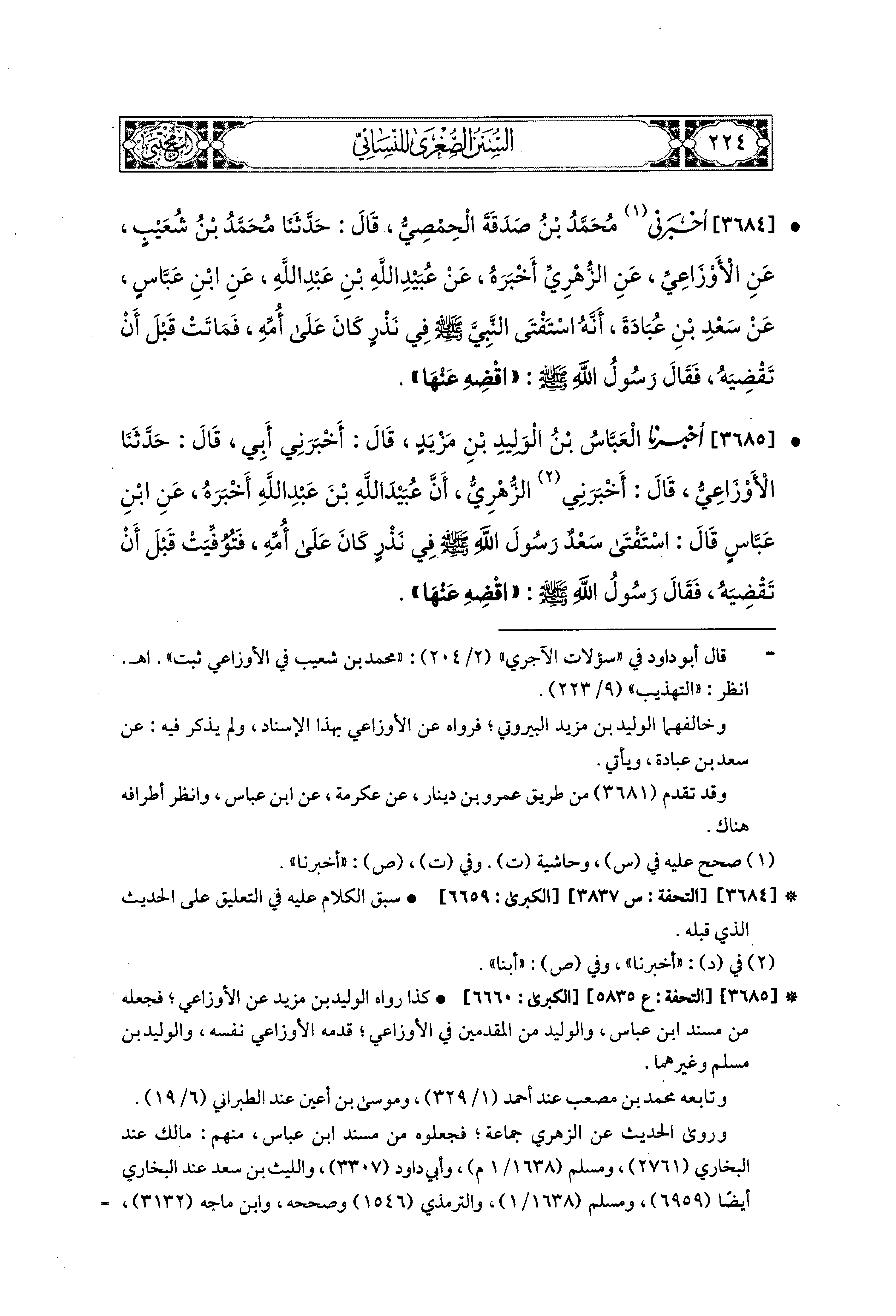 3684- أَخبَرَني مُحَمد بْنُ صَدَقَةَ الحِمْصِيُّ، قال: حَدثنا مُحَمدُ بْنُ شُعَيبٍ، عَنِ الأَوْزَاعِيِّ، عَنِ الزُّهْرِيِّ، أَخْبَرَهُ، عَن عُبَيدِ اللهِ بْنِ عَبدِ اللهِ، عَنِ ابنِ عَبَّاسٍ، عَن سَعْدِ بْنِ عُبَادَةَ؛ أَنَّهُ اسْتَفْتَى النَّبيَّ صَلى الله عَليه وسَلم فِي نَذْرٍ كَانَ عَلَى أُمِّهِ، فَمَاتَتْ قَبْلَ أَنْ تَقْضِيَهُ؟ فَقَالَ رَسُولُ اللهِ صَلى الله عَليه وسَلم: اقْضِهِ عَنْهَا.
