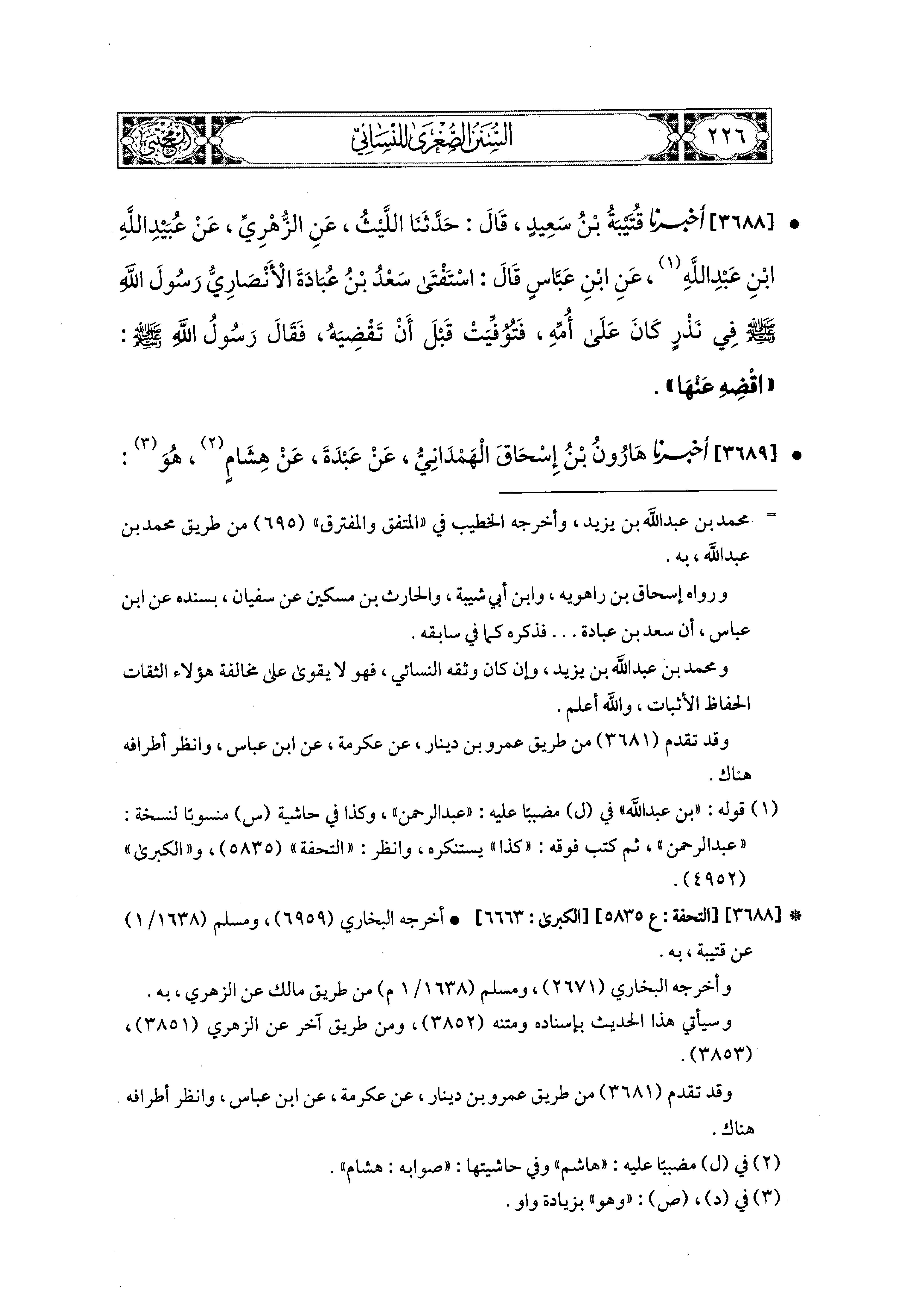 3688- أَخبَرَنا قُتَيبَةُ بْنُ سَعيدٍ، قال: حَدثنا اللَّيْثُ، عَنِ الزُّهْرِيِّ، عَن عُبَيدِ اللهِ بْنِ عَبدِ اللهِ، عَنِ ابنِ عَبَّاسٍ، قَالَ: اسْتَفْتَى سَعْدُ بْنُ عُبَادَةَ الأَنصَارِيُّ رَسُولَ اللهِ صَلى الله عَليه وسَلم فِي نَذْرٍ كَانَ عَلَى أُمِّهِ، فَتُوُفِّيَتْ قَبْلَ أَنْ تَقْضِيَهُ، فَقَالَ رَسُولُ اللهِ صَلى الله عَليه وسَلم: اقْضِهِ عَنْهَا.