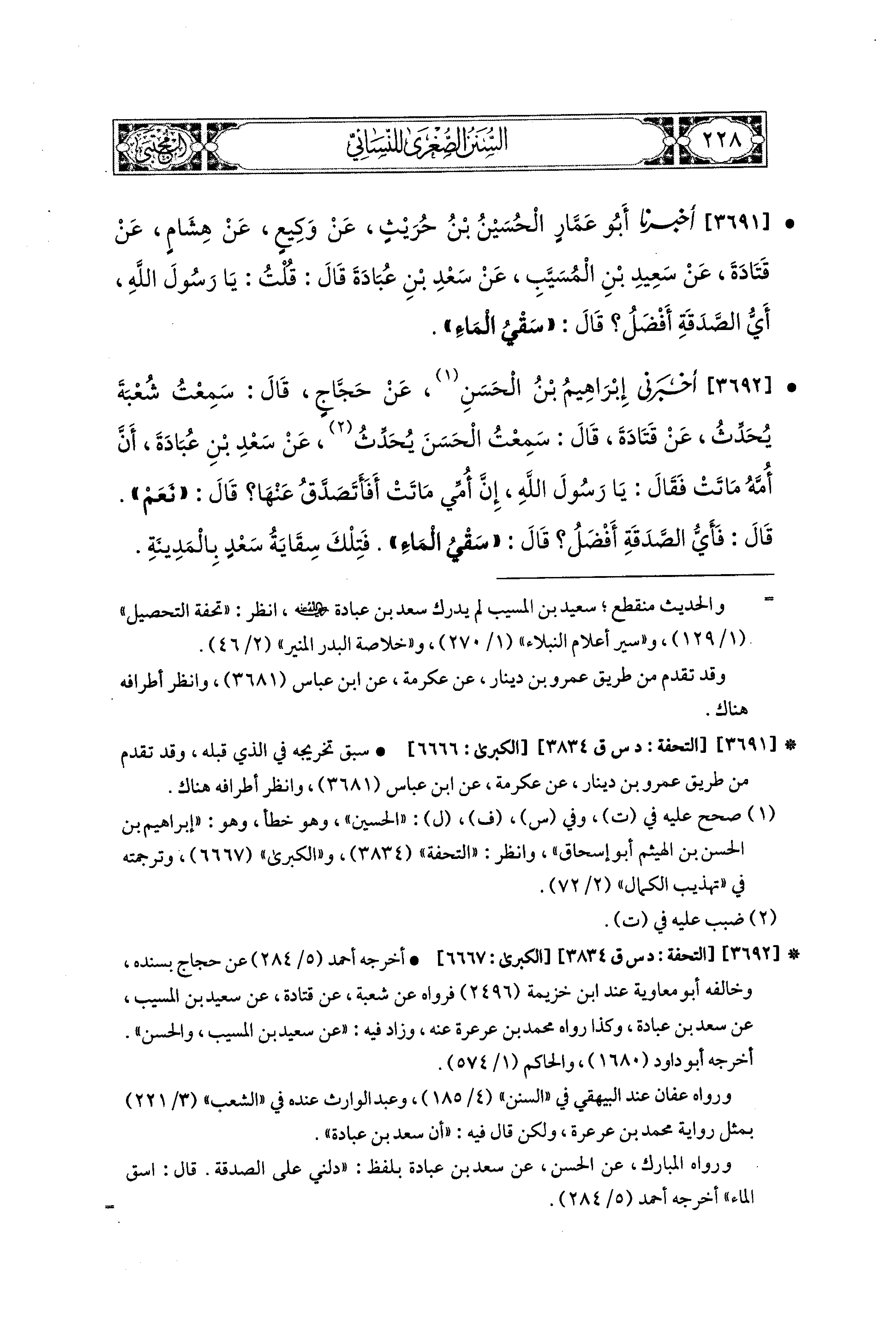 3692- أَخْبَرَني إِبراهِيمُ بْنُ الحَسَنِ، عَن حَجَّاجٍ، قَالَ: سَمِعْتُ شُعْبَةَ، يُحَدِّثُ عَن قَتَادَةَ، قَالَ: سَمِعْتُ الحَسَنَ، يُحَدِّثُ، عَن سَعْدِ بْنِ عُبَادَةَ؛ أَنَّ أُمَّهُ مَاتَتْ، فَقَالَ: يَا رَسُولَ اللهِ، إِنَّ أُمِّي مَاتَتْ، أَفَأَتَصَدَّقُ عَنْهَا؟ قَالَ: نَعَمْ، قَالَ: فَأَيُّ الصَّدَقَةِ أَفْضَلُ؟ قَالَ: سَقْيُ المَاءِ، فَتِلْكَ سِقَايَةُ سَعْدٍ بِالمَدِينَةِ.