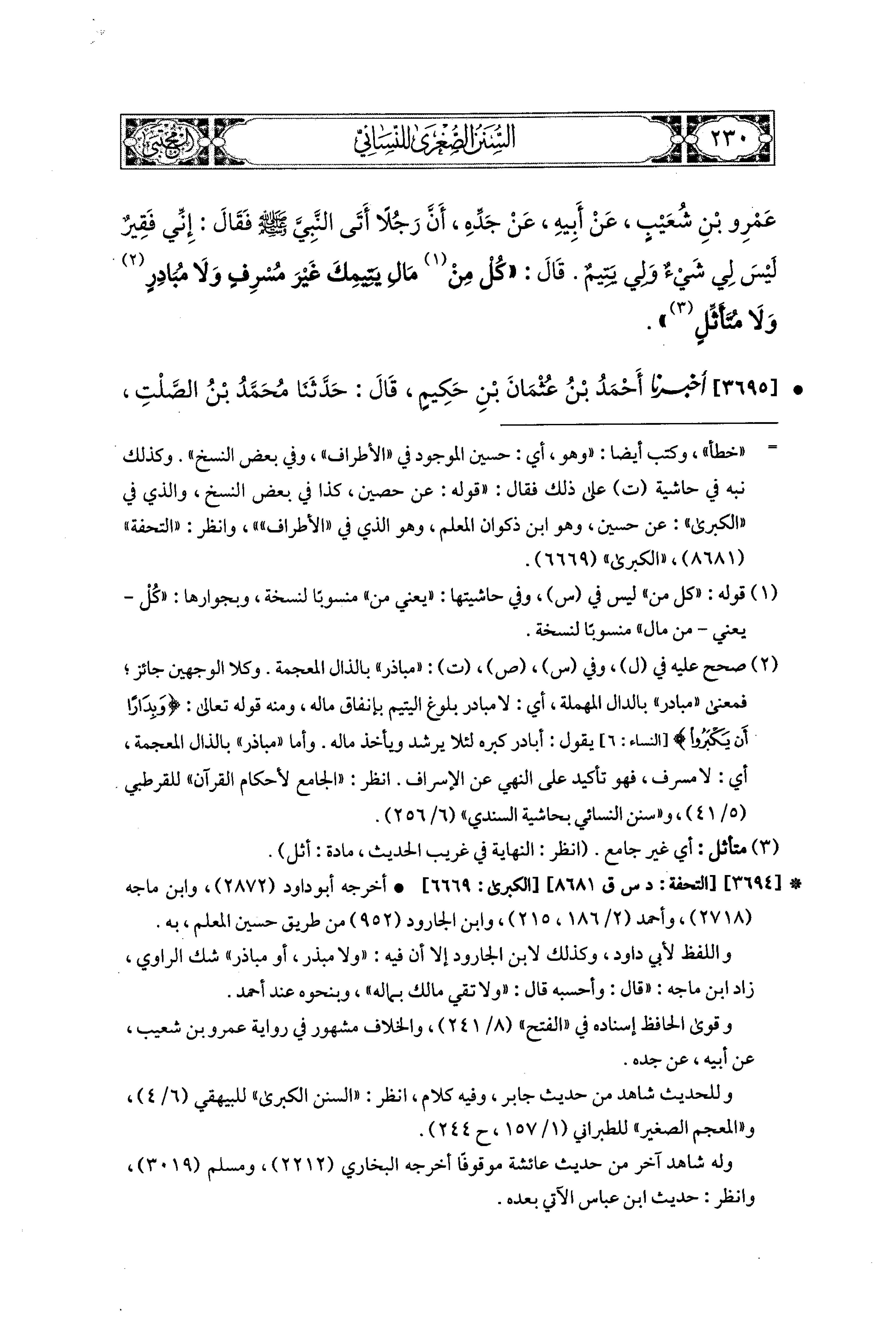 3695- أَخبَرَنا أَحْمَدُ بْنُ عُثمَانَ بْنِ حَكِيمٍ، قَالَ حَدَّثَنَا مُحَمدُ بْنُ الصَّلْتِ، قال: حَدثنا أَبو كُدَيْنَةَ، عَن عَطَاءٍ، وَهُوَ ابْنُ السَّائِبِ، عَن سَعيدِ بْنِ جُبَيْرٍ، عَنِ ابنِ عَبَّاسٍ، قَالَ: لَمَّا نَزَلَتْ هَذِهِ الآيَةُ {وَلاَ تَقْرَبُوا مَالَ اليَتِيمِ إِلاَّ بِالَّتِي هِيَ أَحْسَنُ} وَ {إِنَّ الَّذِينَ يَأْكُلُونَ أَمْوَالَ اليَتَامَى ظُلْمًا}، قَالَ: اجْتَنَبَ النَّاسُ مَالَ اليَتِيمِ وَطَعَامَهُ، فَشَقَّ ذَلِكَ عَلَى المُسْلِمينَ، فَشَكَوْا ذَلِكَ إِلَى النَّبيِّ صَلى الله عَليه وسَلم، فَأَنْزَلَ اللهُ: {وَيَسْأَلُونَكَ عَنِ اليَتَامَى قُلْ إِصْلاَحٌ لَهُمْ خَيْرٌ}، إِلَى قَوْلِهِ، {لأَعْنَتَكُمْ}.
