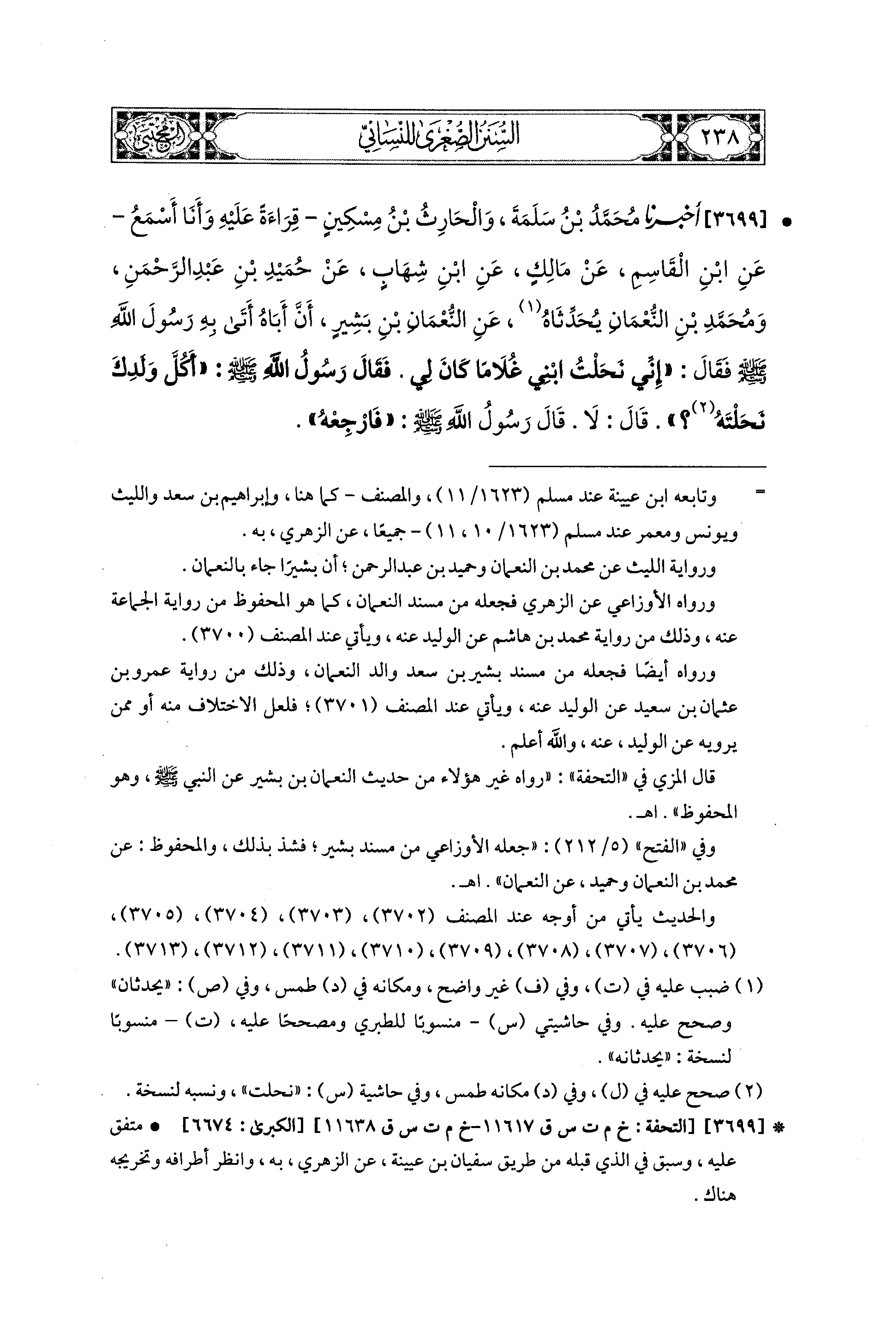3699- أَخبَرَنا مُحَمد بْنُ سَلَمَةَ، وَالحَارِثُ بْنُ مِسْكِينٍ، قِرَاءَةً عَلَيْهِ وَأَنَا أَسْمَعُ، عَنِ ابنِ القَاسِمِ، عَن مَالِكٍ، عَنِ ابنِ شِهَابٍ، عَن حُمَيْدِ بْنِ عَبدِ الرَّحمَنِ، وَمُحَمدِ بْنِ النُّعْمَانِ، يُحَدِّثَاهُ، عَنِ النُّعْمَانِ بْنِ بَشِيرِ؛ أَنَّ أَبَاهُ أَتَى بِهِ رَسُولَ اللهِ صَلى الله عَليه وسَلم، فَقَالَ: إِنِّي نَحَلْتُ ابْني غُلاَمًا كَانَ لِي، فَقَالَ رَسُولُ اللهِ صَلى الله عَليه وسَلم: أَكُلَّ وَلَدِكَ نَحَلْتَهُ؟ قَالَ: لاَ، قَالَ رَسُولُ اللهِ صَلى الله عَليه وسَلم: فَارْجِعْهُ.