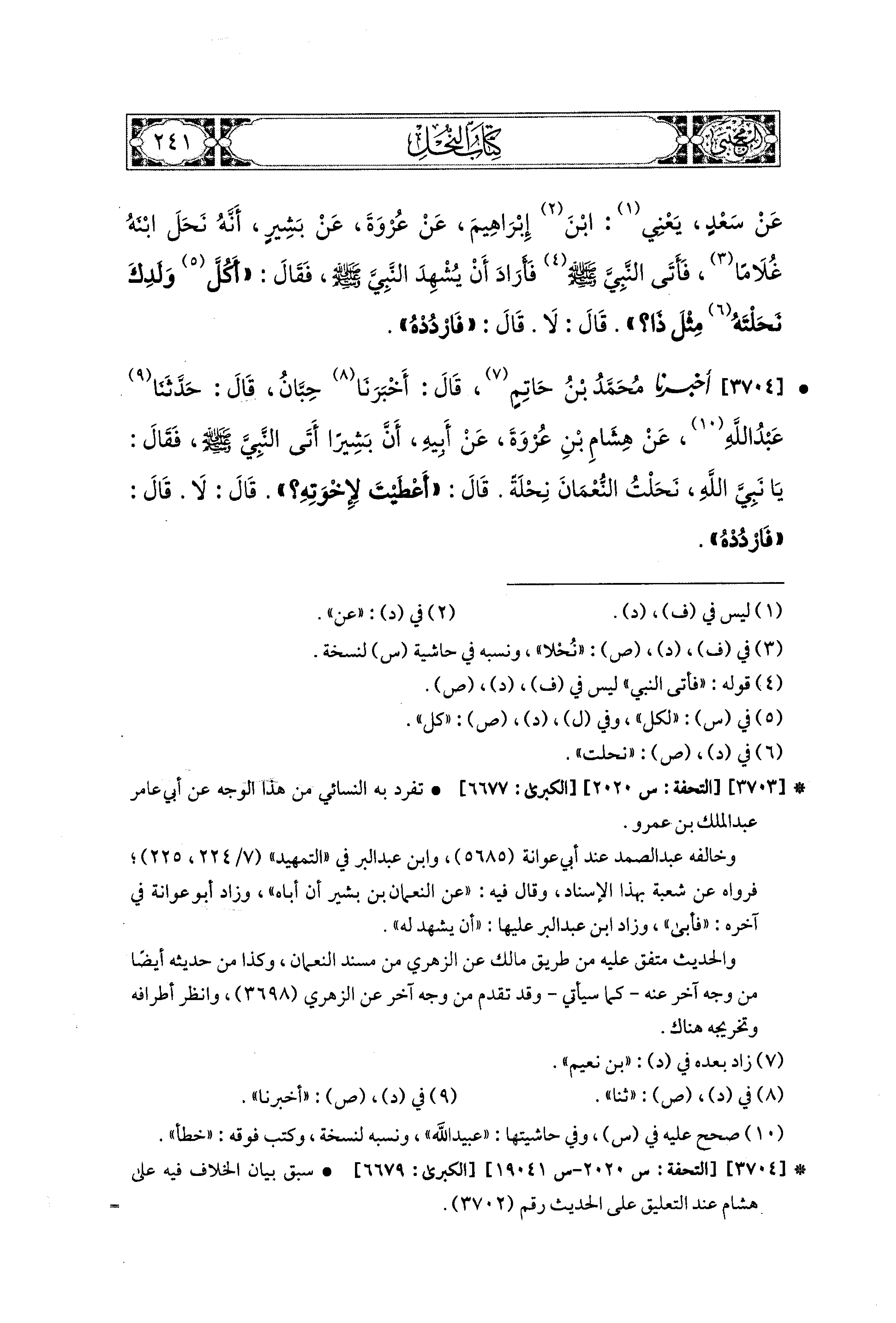 3704- أَخبَرَنا مُحَمد بْنُ حَاتِمٍ، قال: أَخبَرَنا حِبَّانُ، قال: حَدثنا عَبدُ اللهِ، عَن هِشَامِ بْنِ عُرْوَةَ، عَن أَبِيهِ؛ أَنَّ بَشِيرًا، أَتَى النَّبيَّ صَلى الله عَليه وسَلم، فَقَالَ: يَا نَبِيَّ اللهِ، نَحَلْتُ النُّعْمَانَ نِحْلَةً، قَالَ: أَعْطَيْتَ لإِخْوَتِهِ؟ قَالَ: لاَ، قَالَ: فَارْدُدْهُ.