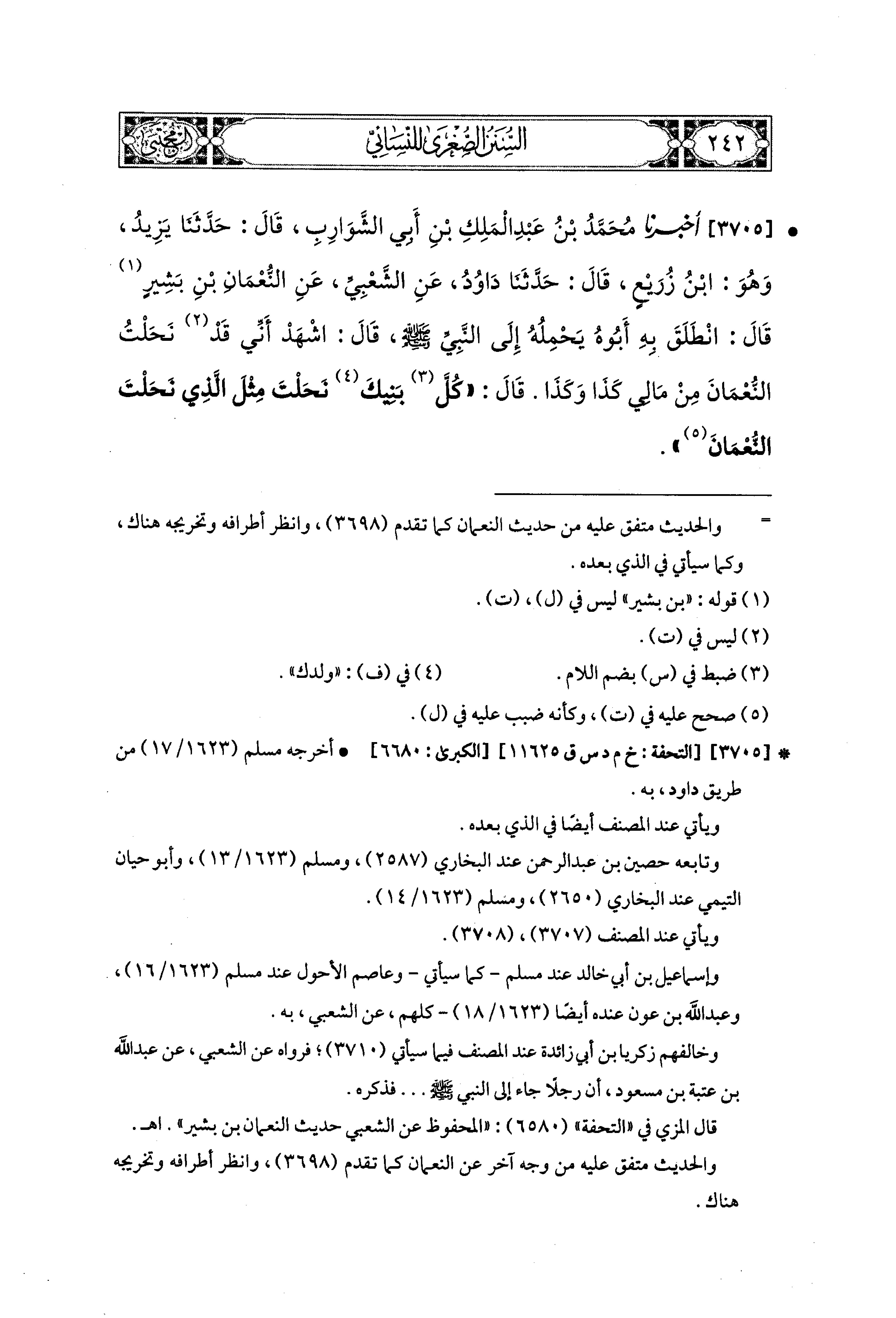3705- أَخبَرَنا مُحَمد بْنُ عَبدِ المَلِكِ بْنِ أَبِي الشَّوَارِبِ، قال: حَدثنا يَزِيدُ، وَهُوَ ابْنُ زُرَيْعٍ، قال: حَدثنا دَاوُدُ، عَنِ الشَّعْبِيِّ، عَنِ النُّعْمَانِ بن بشير، قَالَ: انْطَلَقَ بِهِ أَبوهُ يَحْمِلُهُ إِلَى النَّبيِّ صَلى الله عَليه وسَلم قَالَ: اشْهَدْ أَنِّي قَدْ نَحَلْتُ النُّعْمَانَ مِنْ مَالِي كَذَا وَكَذَا، قَالَ: كُلَّ بَنيكَ نَحَلْتَ مِثْلَ الَّذِي نَحَلْتَ النُّعْمَانَ؟.