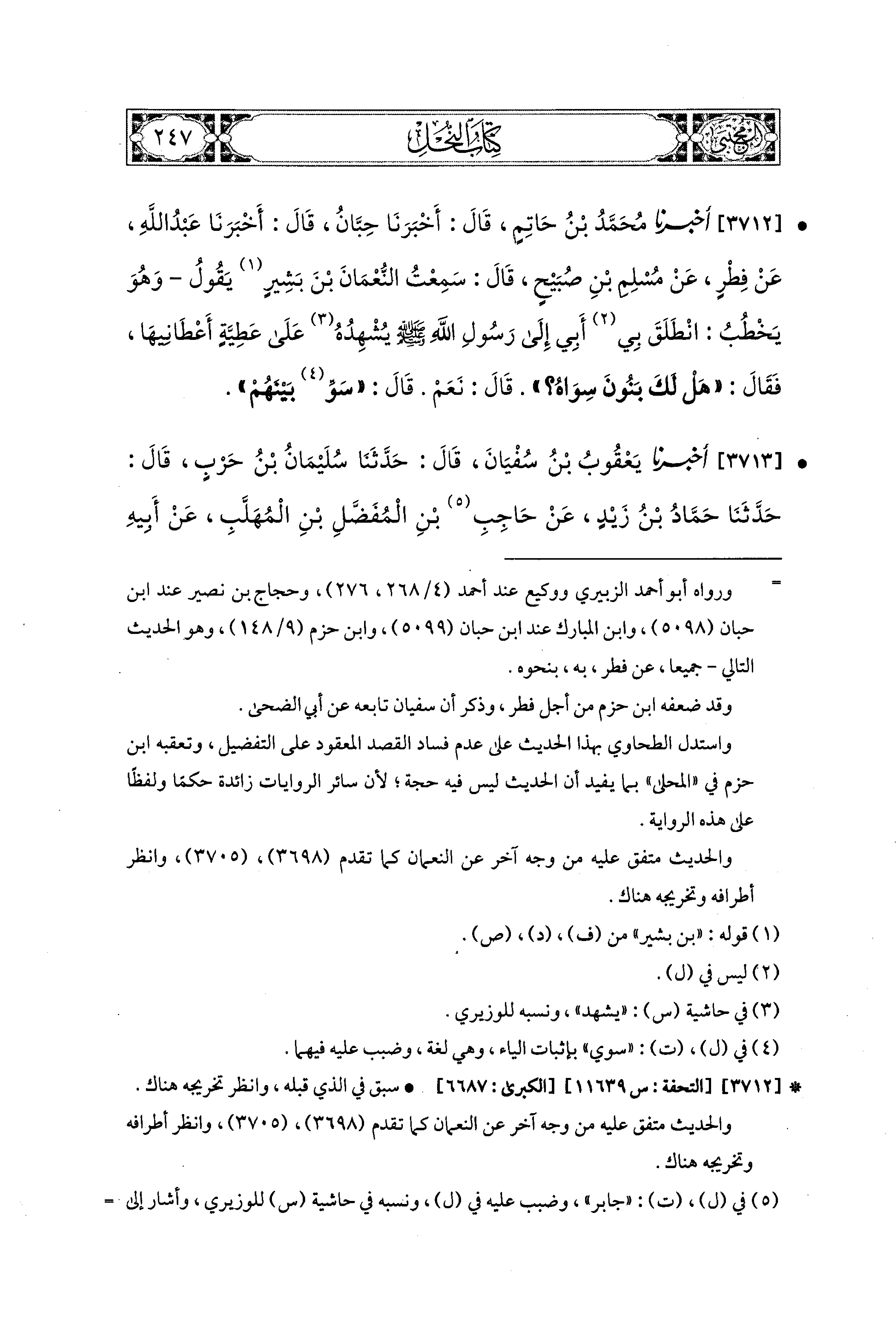 3712- أَخبَرَنا مُحَمد بْنُ حَاتِمٍ، قَالَ: أَخبَرنا حِبَّانُ، قَالَ: أَخبَرنا عَبدُ اللهِ، عَن فِطْرٍ، عَن مُسْلِمِ بْنِ صُبَيْحٍ، قَالَ: سَمِعْتُ النُّعْمَانَ بْنَ بَشِيرٍ، يَقُولُ وَهُوَ يَخْطُبُ: انْطَلَقَ بِي أَبِي إِلَى رَسُولِ اللهِ صَلى الله عَليه وسَلم يُشْهِدُهُ عَلَى عَطِيَّةٍ أَعْطَانيهَا، فَقَالَ: هَلْ لَكَ بَنُونَ سِوَاهُ؟ قَالَ: نَعَمْ، قَالَ: سَوِّ بَيْنَهُمْ.