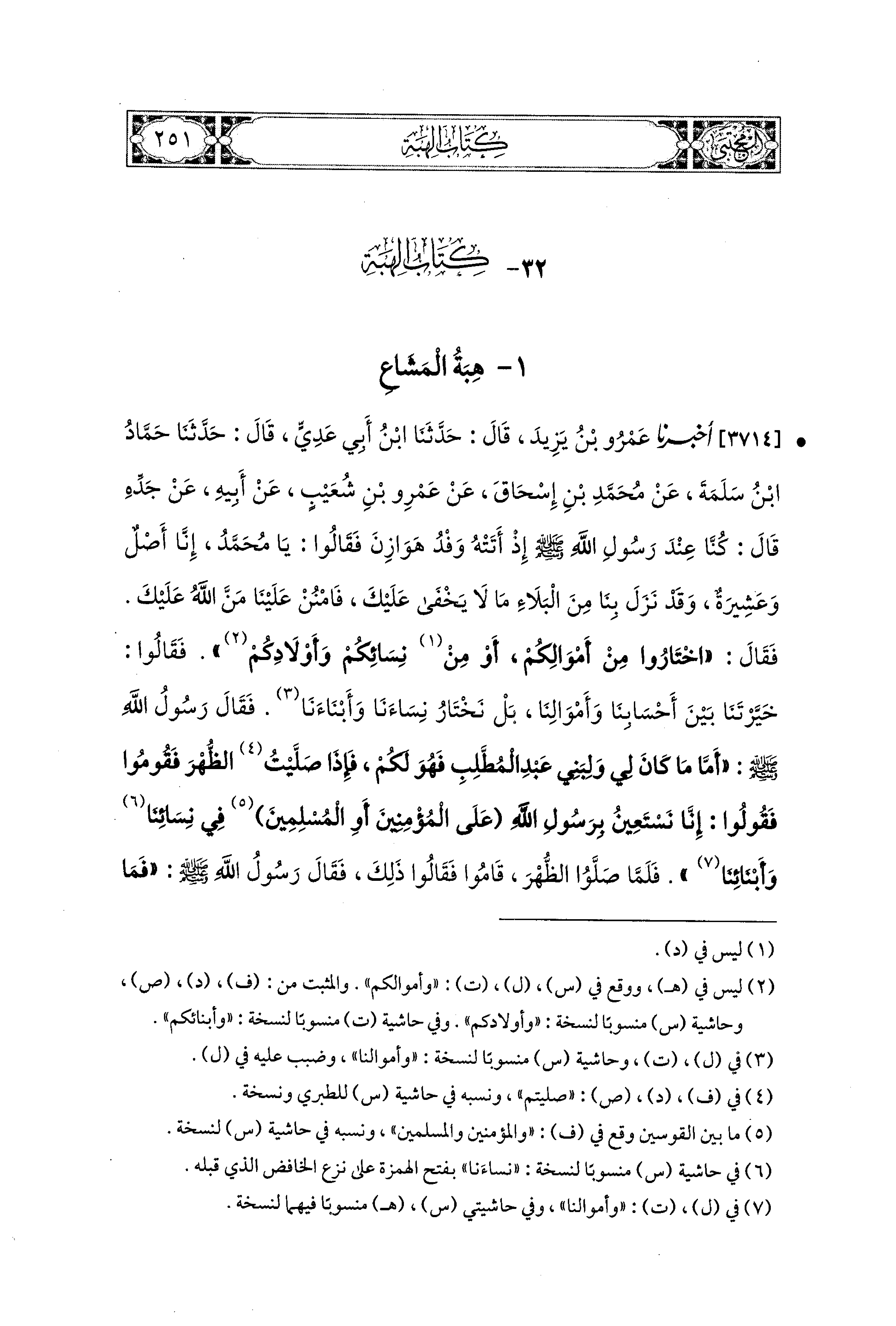 3714 - أَخبَرَنا عَمْرُو بْنُ يَزِيدَ، قال: حَدثنا ابْنُ أَبِي عَدِيٍّ، قال: حَدثنا حَمَّادُ بْنُ سَلَمَةَ، عَن مُحَمدِ بْنِ إِسحَاقَ، عَن عَمْرِو بْنِ شُعَيبٍ، عَن أَبِيهِ، عَن جَدِّهِ، قَالَ: كُنَّا عِنْدَ رَسُولِ اللهِ صَلى الله عَليه وسَلم إِذْ أَتَتْهُ وَفْدُ هَوَازِنَ، فَقَالُوا: يَا مُحَمدُ، إِنَّا أَصْلٌ وَعَشِيرَةٌ، وَقَدْ نَزَلَ بِنَا مِنَ البَلاَءِ مَا لاَ يَخْفَى عَلَيْكَ، فَامْنُنْ عَلَيْنَا مَنَّ اللهُ عَلَيْكَ، فَقَالَ: اخْتَارُوا مِنْ أَمْوَالِكُمْ، أَوْ مِنْ نِسَائِكُمْ وَأَبْنَائِكُمْ (1)، فَقَالُوا: قَدْ خَيَّرْتَنَا بَيْنَ أَحْسَابِنَا وَأَمْوَالِنَا بَلْ نَخْتَارُ نِسَاءَنَا وَأَبْنَاءَنَا، فَقَالَ رَسُولُ اللهِ صَلى الله عَليه وسَلم: أَمَّا مَا كَانَ لِي وَلِبَني عَبدِ المُطَّلِبِ فَهُوَ لَكُمْ، فَإِذَا صَلَّيْتُ الظُّهْرَ فَقُومُوا، فَقُولُوا: إِنَّا نَسْتَعِينُ بِرَسُولِ اللهِ عَلَى المُؤْمِنينَ أَوِ المُسْلِمينَ فِي نِسَائِنَا وَأَبْنَائِنَا فَلَمَّا صَلَّوْا الظُّهْرَ قَامُوا فَقَالُوا ذَلِكَ، فَقَالَ رَسُولُ اللهِ صَلى الله عَليه وسَلم: فَمَا كَانَ لِي وَلِبَني عَبدِ المُطَّلِبِ فَهُوَ لَكُمْ، فَقَالَ المُهَاجِرُونَ: وَمَا كَانَ لَنَا فَهُوَ لِرَسُولِ اللهِ صَلى الله عَليه وسَلم،