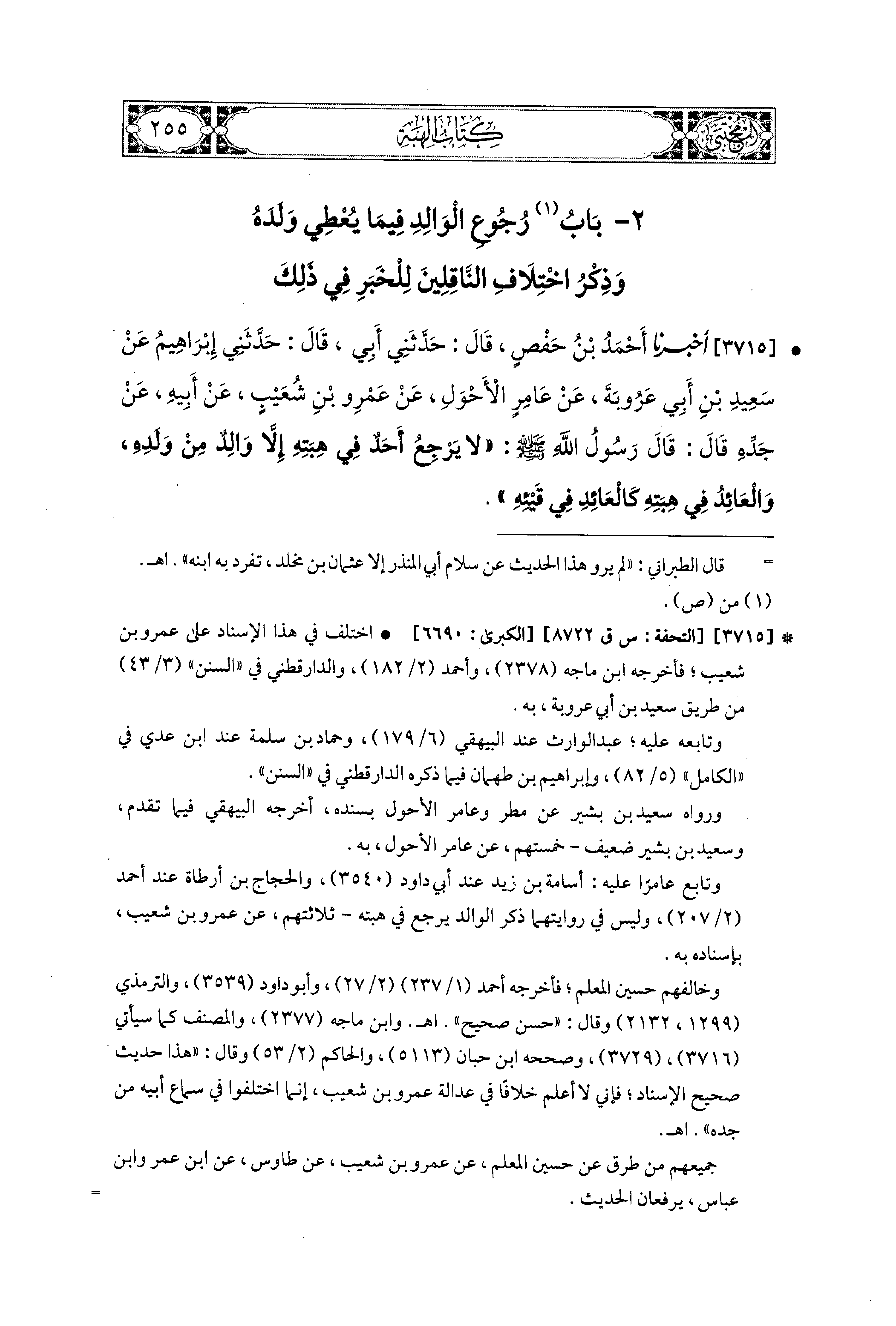 3715- أَخبَرَنا أَحْمَدُ بْنُ حَفْصٍ، قَالَ: حَدَّثَني أَبِي، قَالَ: حَدَّثَني إِبراهِيمُ، عَن سَعيدِ بْنِ أَبِي عَرُوبَةَ، عَن عَامِرٍ الأَحْوَلِ، عَن عَمْرِو بْنِ شُعَيبٍ، عَن أَبِيهِ، عَن جَدِّهِ، قَالَ: قَالَ رَسُولُ اللهِ صَلى الله عَليه وسَلم: لاَ يَرْجِعُ أَحَدٌ فِي هِبَتِهِ إِلاَّ وَالِدٌ مِنْ وَلَدِهِ، وَالعَائِدُ فِي هِبَتِهِ كَالعَائِدِ فِي قَيْئِهِ.
