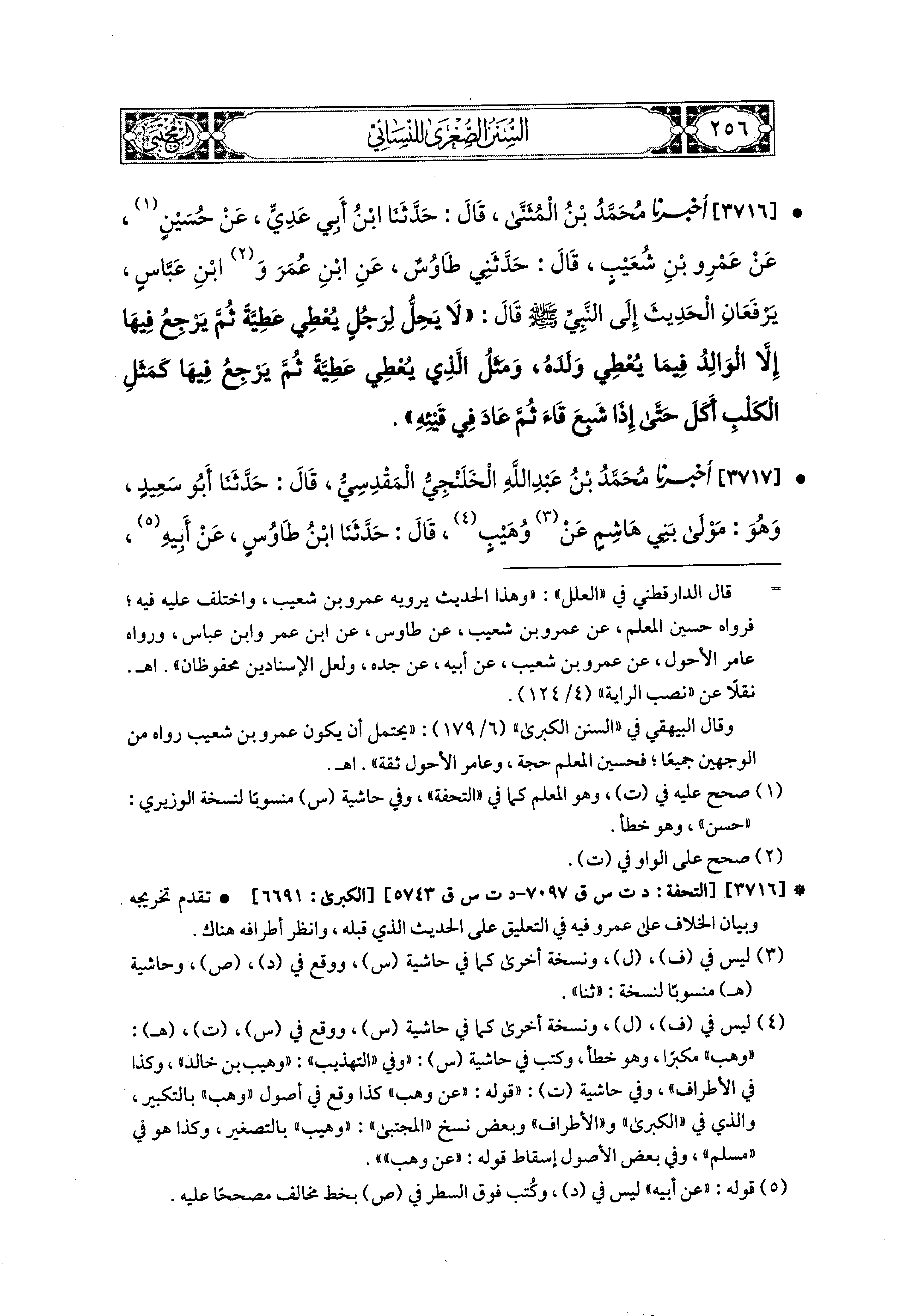 3716- أَخبَرَنا مُحَمد بْنُ المُثَنَّى، قال: حَدثنا ابْنُ أَبِي عَدِيٍّ، عَن حُسَيْنٍ، عَن عَمْرِو بْنِ شُعَيبٍ، قَالَ: حَدَّثَني طَاوُوسٌ، عَنِ ابنِ عُمَرَ، وَابْنِ عَبَّاسٍ، يَرْفَعَانِ الحَدِيثَ إِلَى النَّبيِّ صَلى الله عَليه وسَلم قَالَ: لاَ يَحِلُّ لِرَجُلٍ يُعْطِي عَطِيَّةً ثُمَّ يَرْجِعُ فِيهَا إِلاَّ الوَالِدَ فِيمَا يُعْطِي وَلَدَهُ، وَمَثَلُ الَّذِي يُعْطِي عَطِيَّةً ثُمَّ يَرْجِعُ فِيهَا كَمَثَلِ الكَلْبِ أَكَلَ حَتَّى إِذَا شَبِعَ قَاءَ ثُمَّ عَادَ فِي قَيْئِهِ.