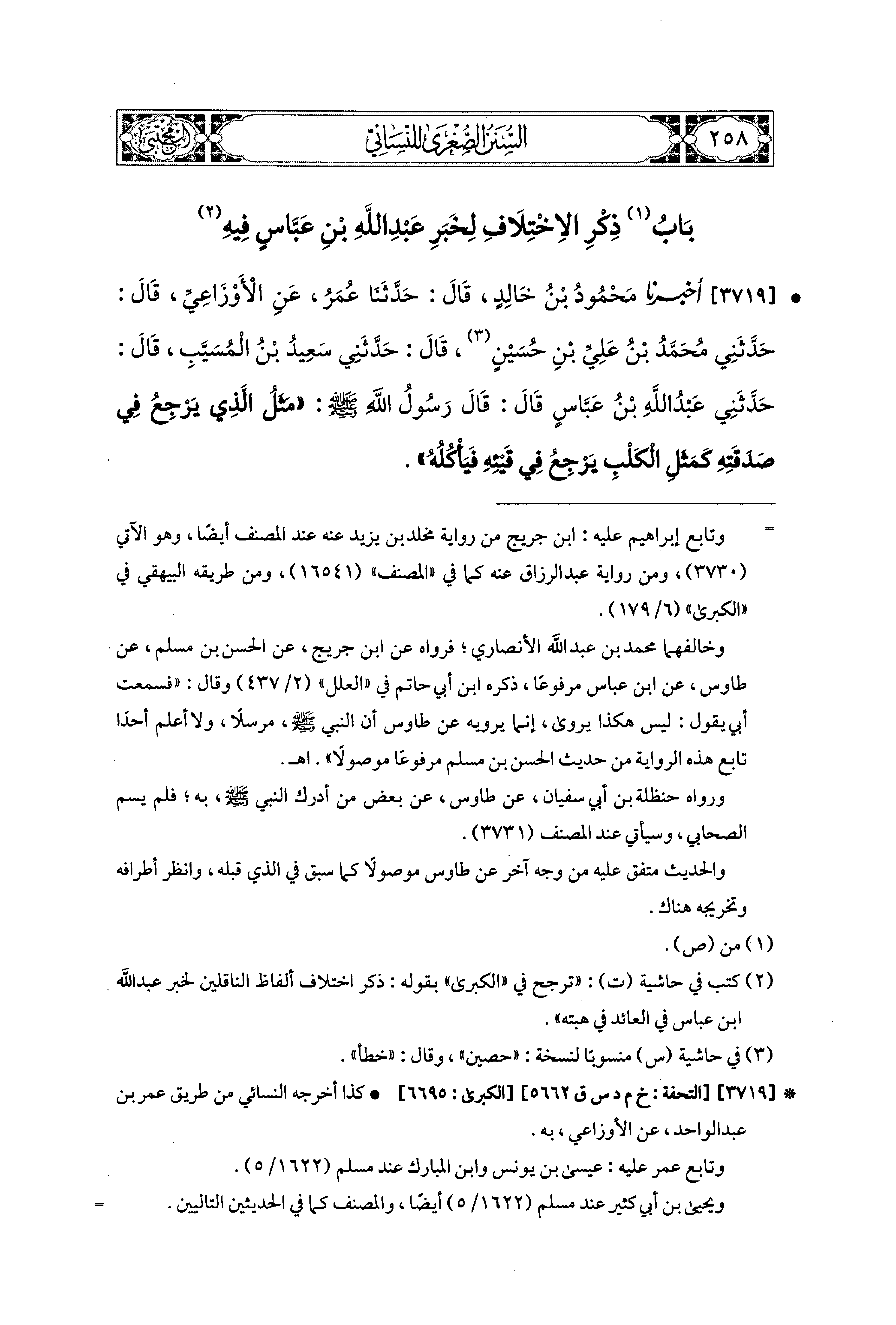 3719- أَخبَرَنا مَحْمُودُ بْنُ خَالِدٍ، قال: حَدثنا عُمَرُ، عَنِ الأَوْزَاعِيِّ، قَالَ: حَدَّثَني مُحَمدُ بْنُ عَلِيِّ بْنِ حُسَيْنٍ، قَالَ: حَدَّثَني سَعيدُ بْنُ المُسَيَّبِ، قَالَ: حَدَّثَني عَبدُ اللهِ بْنُ عَبَّاسٍ، قَالَ: قَالَ رَسُولُ اللهِ صَلى الله عَليه وسَلم: مَثَلُ الَّذِي يَرْجِعُ فِي صَدَقَتِهِ كَمَثَلِ الكَلْبِ يَرْجِعُ فِي قَيْئِهِ فَيَأْكُلُهُ.