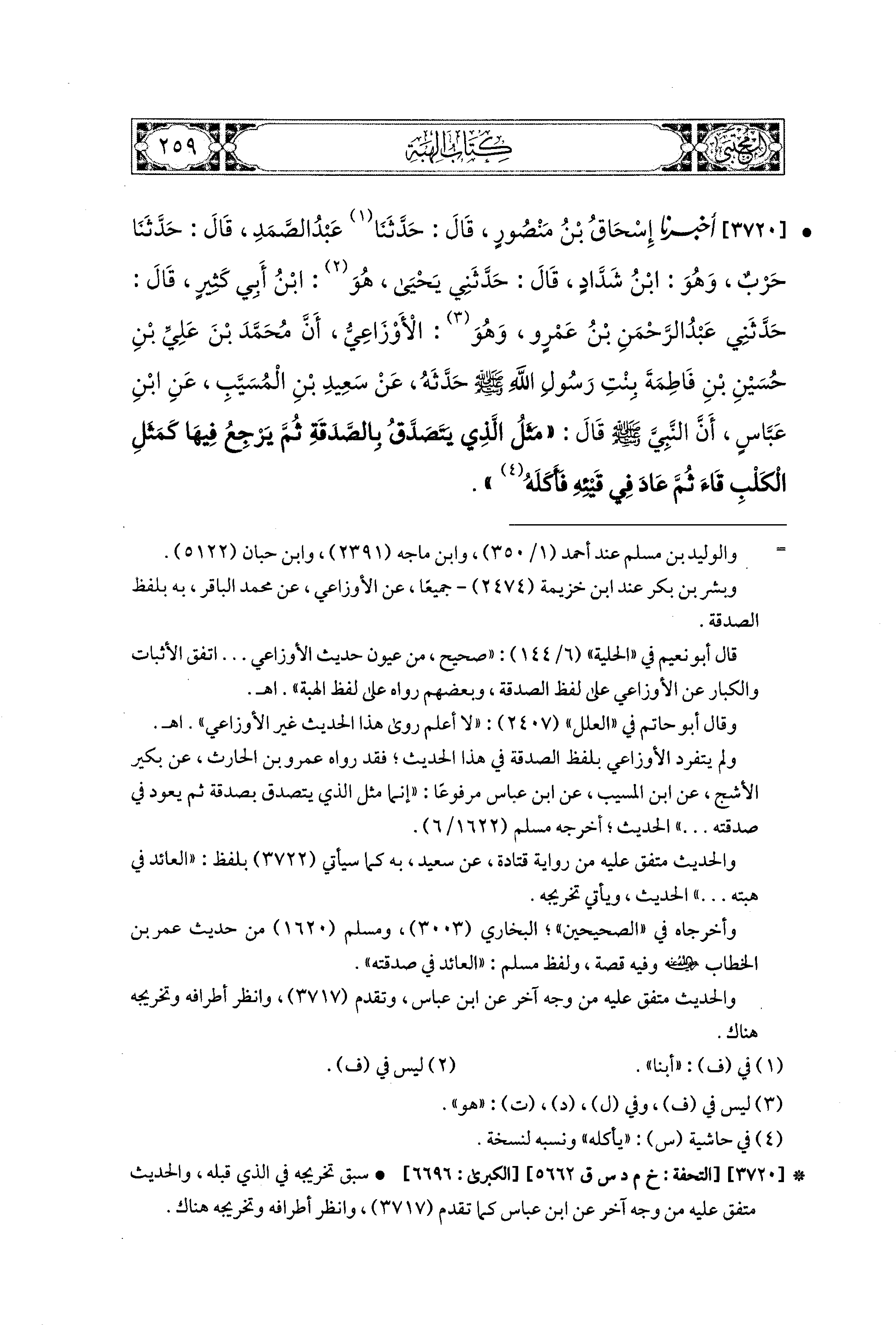 3720- أَخبَرَنا إِسحَاقُ بْنُ مَنْصُورٍ، قال: حَدثنا عَبدُ الصَّمَدِ، قال: حَدثنا حَرْبٌ، وَهُوَ ابْنُ شَدَّادٍ، قَالَ: حَدَّثَني يَحيَى هُوَ ابْنُ أَبِي كَثِيرٍ، قَالَ: حَدَّثَني عَبدُ الرَّحمَنِ بْنُ عَمْرٍو، هُوَ الأَوْزَاعِيُّ، أَنَّ مُحَمدَ بْنَ عَلِيِّ بْنِ حُسَينِ بْنِ فَاطِمَةَ بِنْتِ رَسِولِ اللهِ صَلى الله عَليه وسَلم حَدَّثَهُ عَن سَعيدِ بْنِ المُسَيَّبِ، عَنِ ابنِ عَبَّاسٍ، أَنَّ النَّبيَّ صَلى الله عَليه وسَلم قَالَ: مَثَلُ الَّذِي يَتَصَدَّقُ بِالصَّدَقَةِ ثُمَّ يَرْجِعُ فِيهَا، كَمَثَلِ الكَلْبِ قَاءَ ثُمَّ عَادَ فِي قَيْئِهِ فَأَكَلَهُ.