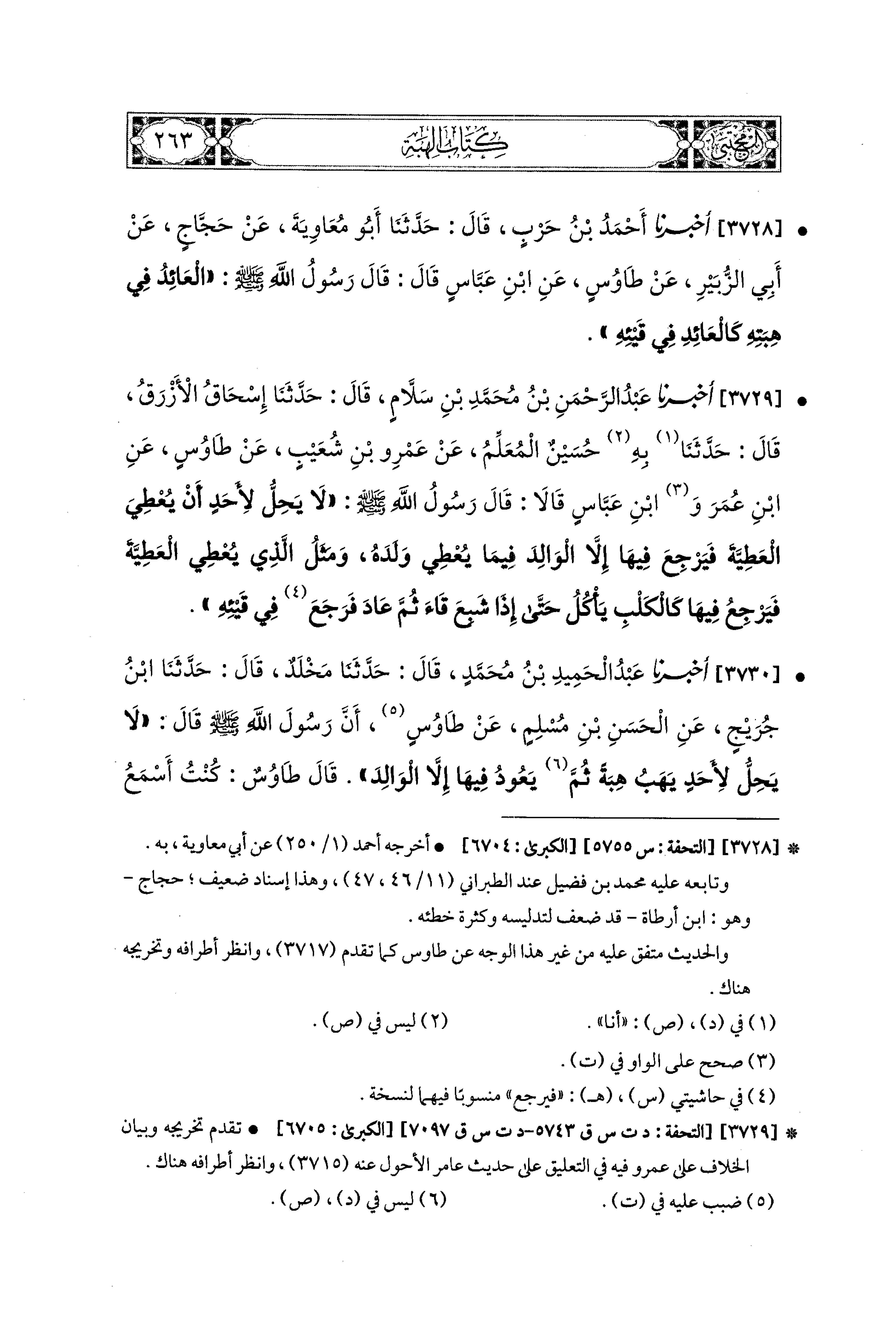 3730- أَخبَرَنا عَبدُ الحَميدِ بْنُ مُحَمدٍ، قال: حَدثنا مَخْلَدٌ، قال: حَدثنا ابْنُ جُرَيْجٍ، عَنِ الحَسَنِ بْنِ مُسْلِمٍ، عَن طَاوُوسٍ، أَنَّ رَسُولَ اللهِ صَلى الله عَليه وسَلم قَالَ: لاَ يَحِلُّ لأَحَدٍ يَهَبُ هِبَةً ثُمَّ يَعُودُ فِيهَا إِلاَّ الوَالِدَ، قَالَ طَاوُوسٌ: كُنْتُ أَسْمَعُ الصِّبْيَانَ يَقُولُونَ: يَا عَائِدًا فِي قَيْئِهِ، وَلَمْ أَشْعُرْ أَنَّ رَسُولَ اللهِ صَلى الله عَليه وسَلم ضَرَبَ ذَلِكَ مَثَلاً، حَتَّى بَلَغَنَا أَنَّهُ كَانَ يَقُولُ، مَثَلُ الَّذِي يَهَبُ الهِبَةَ ثُمَّ يَعُودُ فِيهَا، وَذَكَرَ كَلِمَةً مَعْنَاهَا، كَمَثَلِ الكَلْبِ يَأْكُلُ قَيْئَهُ.