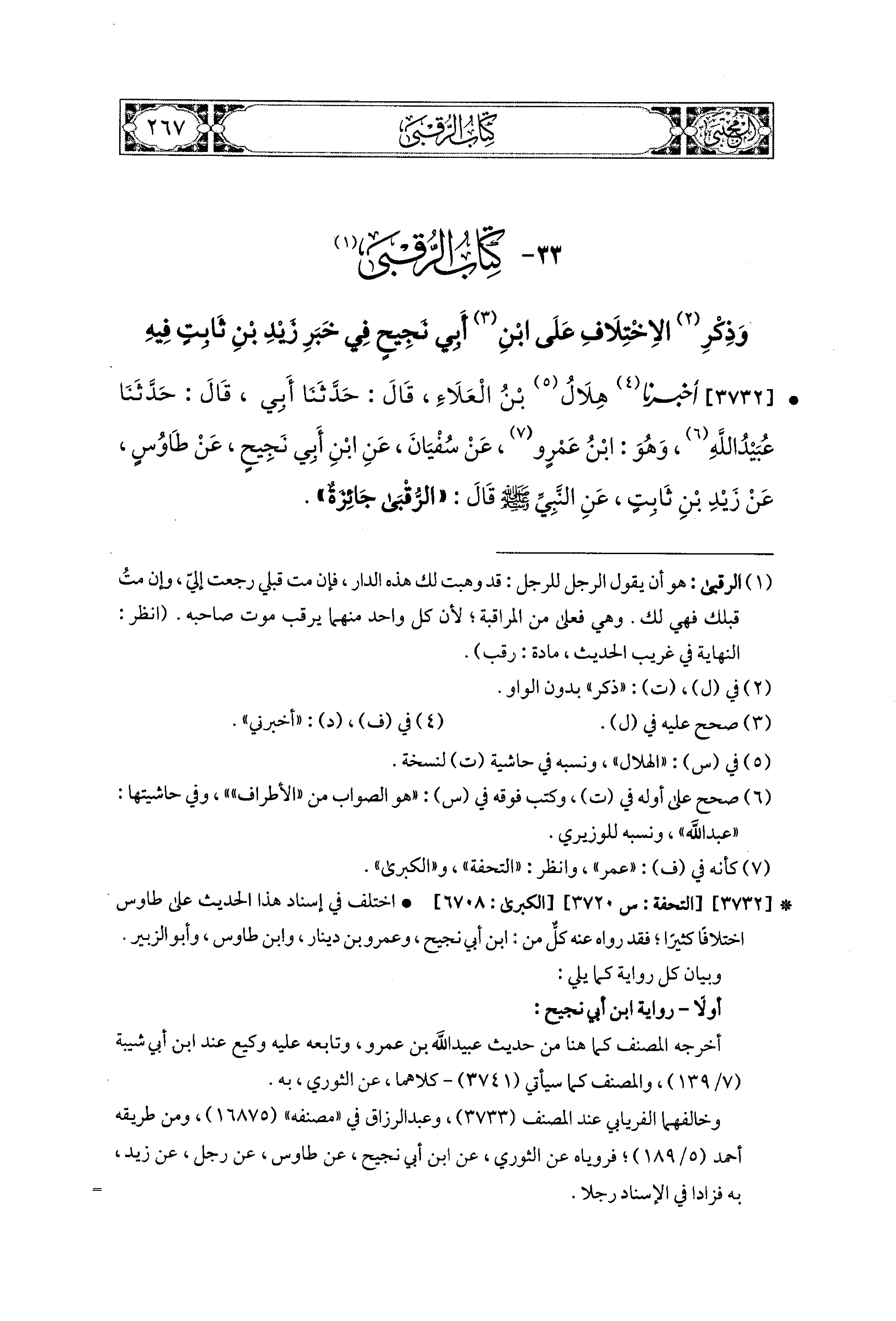 3732 - أَخبَرَنا هِلاَلُ بْنُ العَلاَءِ، قال: حَدثنا أَبِي، قال: حَدثنا عُبَيدُ اللهِ، وَهُوَ ابْنُ عَمْرٍو، عَن سُفْيَانَ، عَنِ ابنِ أَبِي نَجِيحٍ، عَن طَاوُوسٍ، عَن زَيْدِ بْنِ ثَابِتٍ، عَنِ النَّبيِّ صَلى الله عَليه وسَلم قَالَ: الرُّقْبَى جَائِزَةٌ.