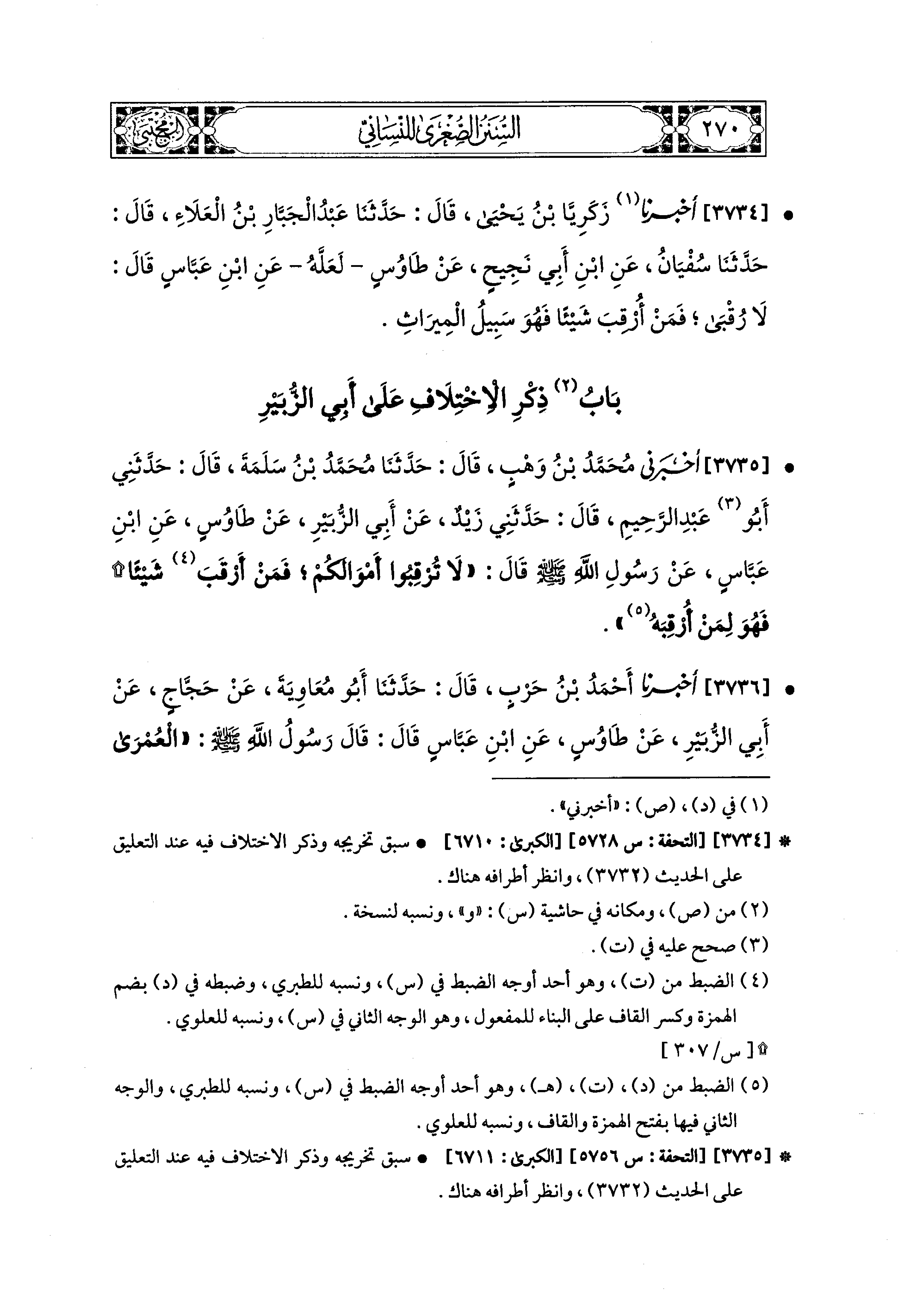 3734- أَخبَرَنا زَكَرِيَّا بْنُ يَحيَى، قال: حَدثنا عَبدُ الجَبَّارِ بْنُ العَلاَءِ، قال: حَدثنا سُفْيَانُ، عَنِ ابنِ أَبِي نَجِيحٍ، عَن طَاوُوسٍ، لَعَلَّهُ، عَنِ ابنِ عَبَّاسٍ، قَالَ: لاَ رُقْبَى، فَمَنْ أُرْقِبَ شَيْئًا فَهُوَ سَبِيلُ الميرَاثِ.