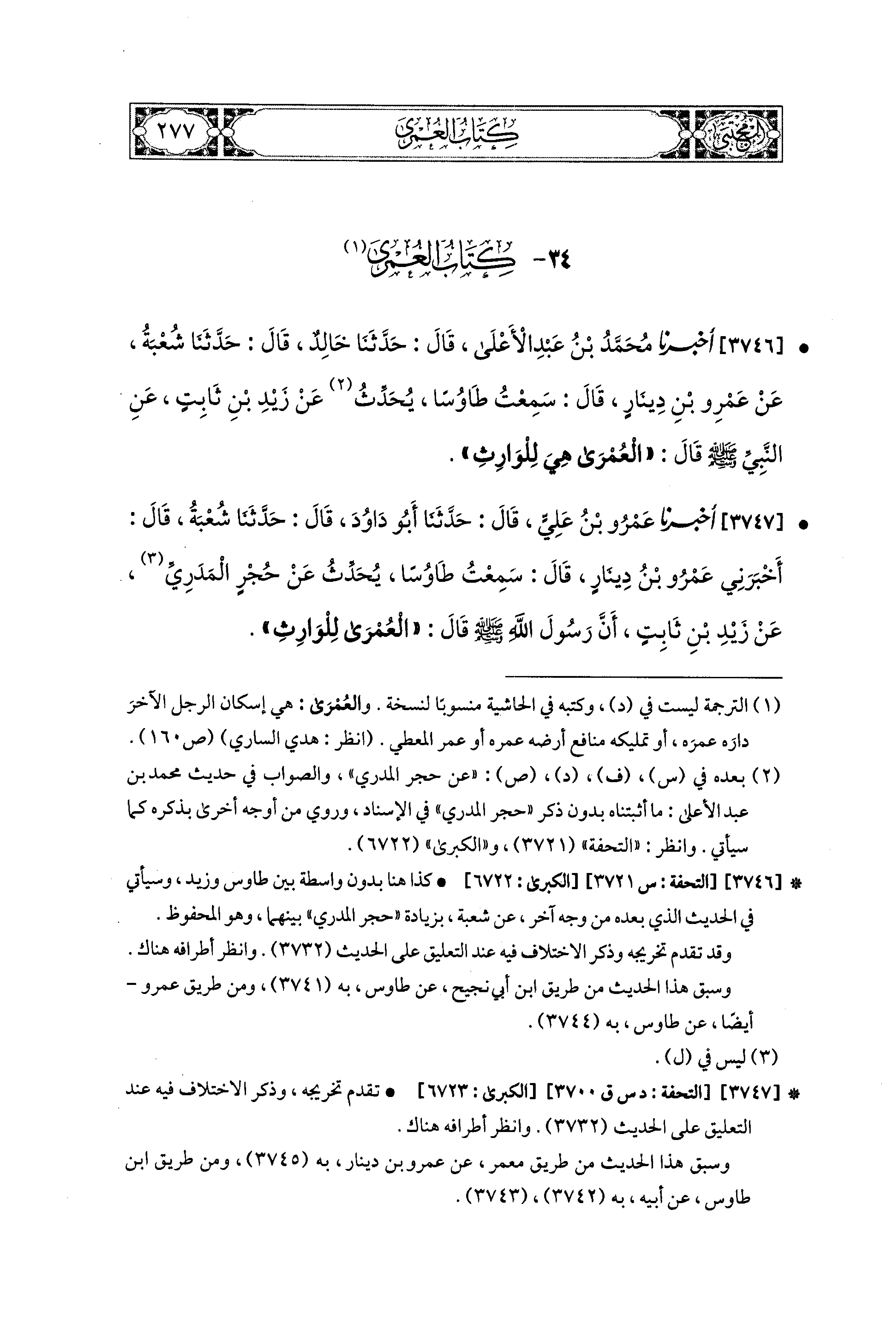 3747- أَخبَرَنا عَمْرُو بْنُ عَلِيٍّ، قال: حَدثنا أَبو دَاوُدَ، قال: حَدثنا شُعْبَةُ، قَالَ: أَخْبَرَني عَمْرُو بْنُ دِينَارٍ، قَالَ: سَمِعْتُ طَاوُوسًا، يُحَدِّثُ، عَن حُجْرٍ المَدَرِيِّ، عَن زَيْدِ بْنِ ثَابِتٍ، أَنَّ رَسُولَ اللهِ صَلى الله عَليه وسَلم قَالَ: العُمْرَى لِلْوَارِثِ.