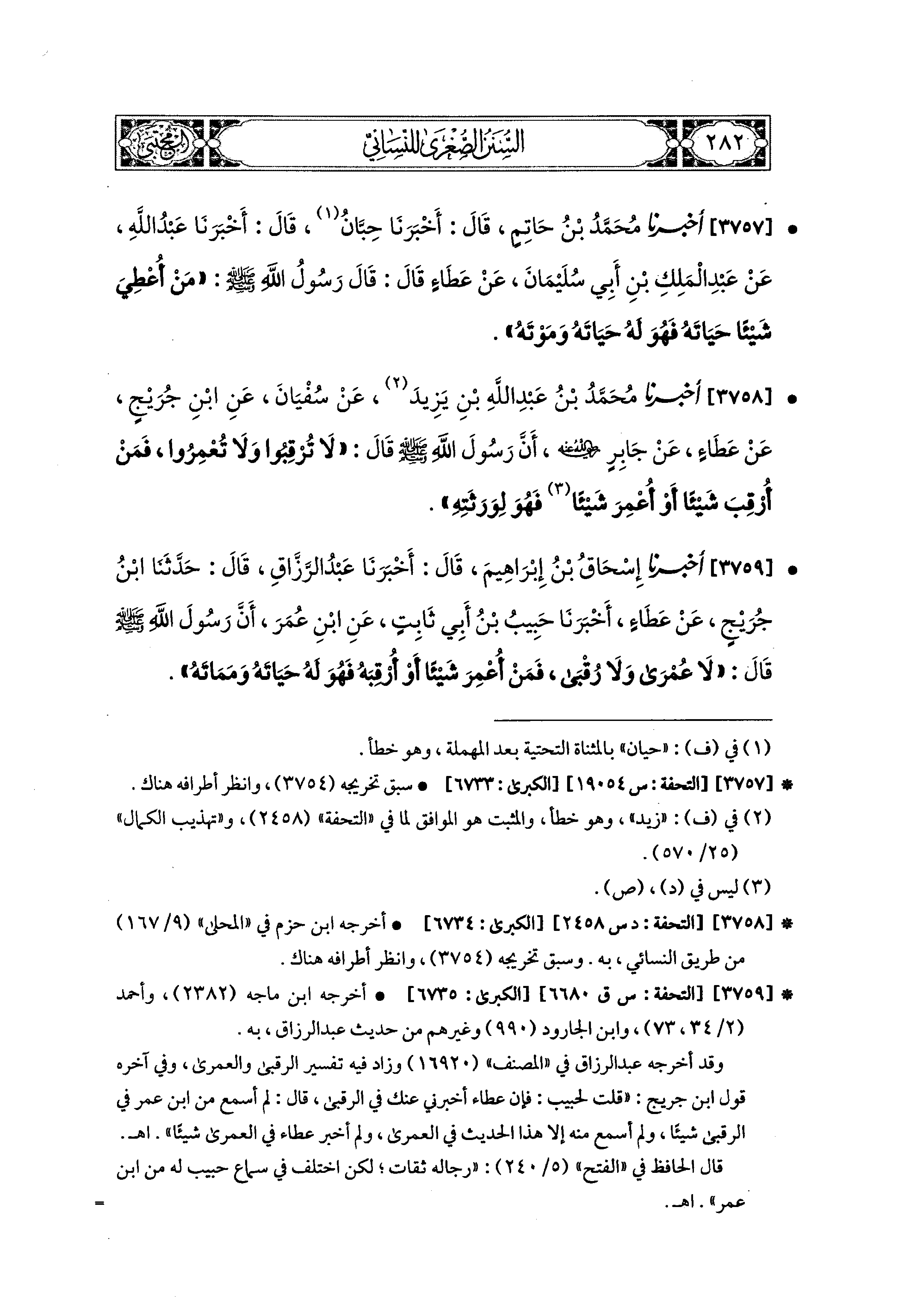 3759- أَخبَرَنا إِسحَاقُ بْنُ إِبراهِيمَ، قَالَ: أَخبَرنا عَبدُ الرَّزَّاقِ، قَالَ: حدثنا ابْنُ جُرَيْجٍ، عَن عَطَاءٍ، أَخبَرنا حَبِيبُ بْنُ أَبِي ثَابِتٍ، عَنِ ابنِ عُمَرَ، أَنَّ رَسُولَ اللهِ صَلى الله عَليه وسَلم قَالَ: لاَ عُمْرَى وَلاَ رُقْبَى، فَمَنْ أُعْمِرَ شَيْئًا، أَوْ أُرْقِبَهُ فَهُوَ لَهُ حَيَاتَهُ وَمَمَاتَهُ.