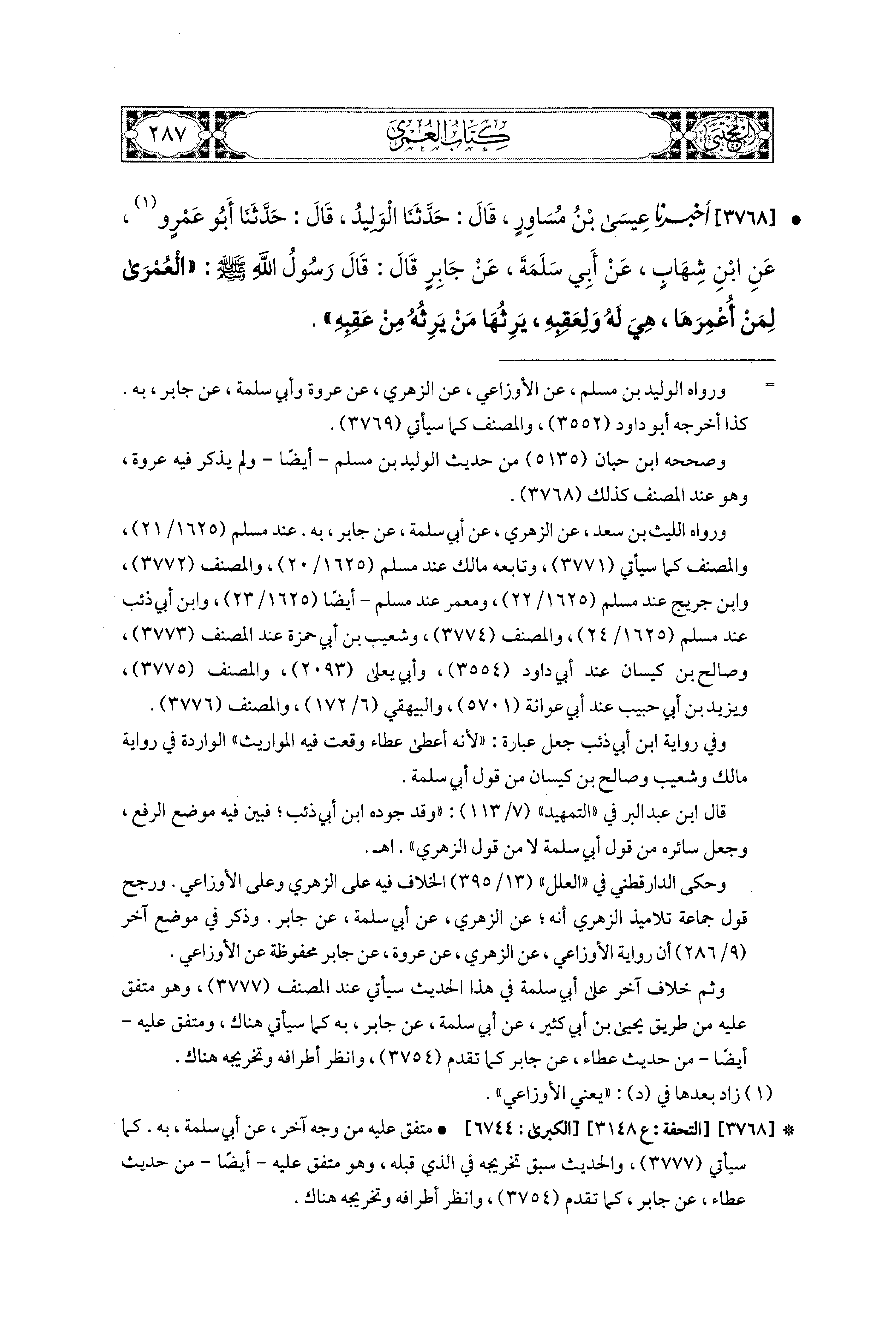 3768- أَخبَرَنا عِيسَى بْنُ مُسَاوِرٍ، قال: حَدثنا الوَلِيدُ، قال: حَدثنا أَبو عَمْرٍو، عَنِ ابنِ شِهَابٍ، عَن أَبِي سَلَمَةَ، عَن جَابِرٍ، قَالَ: قَالَ رَسُولُ اللهِ صَلى الله عَليه وسَلم: العُمْرَى لِمَنْ أُعْمِرَهَا هِيَ لَهُ وَلِعَقِبِهِ، يَرِثُهَا مَنْ يَرِثُهُ مِنْ عَقِبِهِ.