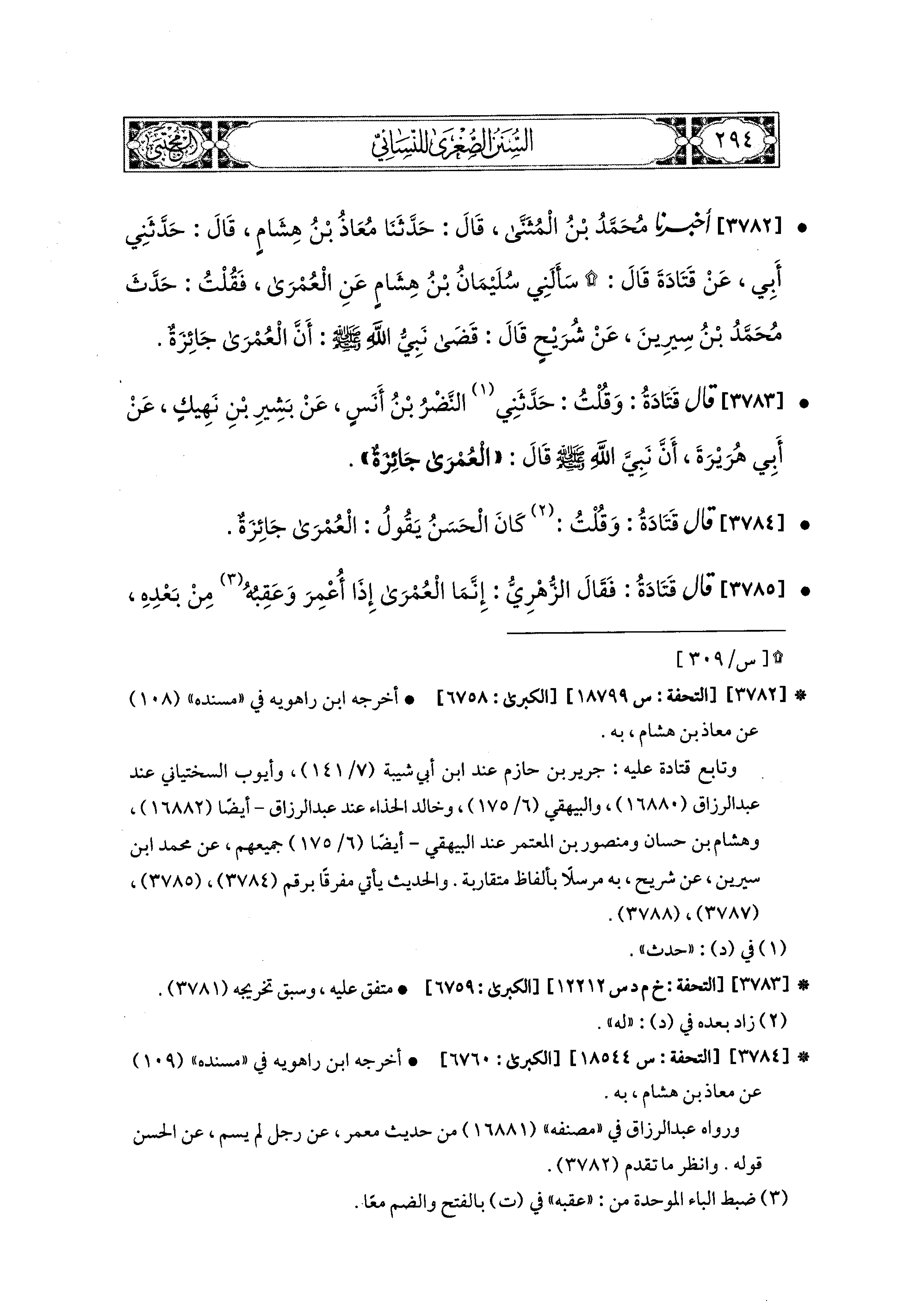 3782- أَخبَرَنا مُحَمد بْنُ المُثَنَّى، قال: حَدثنا مُعَاذُ بْنُ هِشَامٍ، قَالَ: حَدَّثَني أَبِي، عَن قَتَادَةَ، قَالَ: سَأَلَني سُلَيمَانُ بْنُ هِشَامٍ عَنِ العُمْرَى؟ فَقُلْتُ: حَدَّثَ مُحَمدُ بْنُ سِيرِينَ، عَن شُرَيْحٍ، قَالَ: قَضَى نَبِيُّ اللهِ صَلى الله عَليه وسَلم، أَنَّ العُمْرَى جَائِزَةٌ.