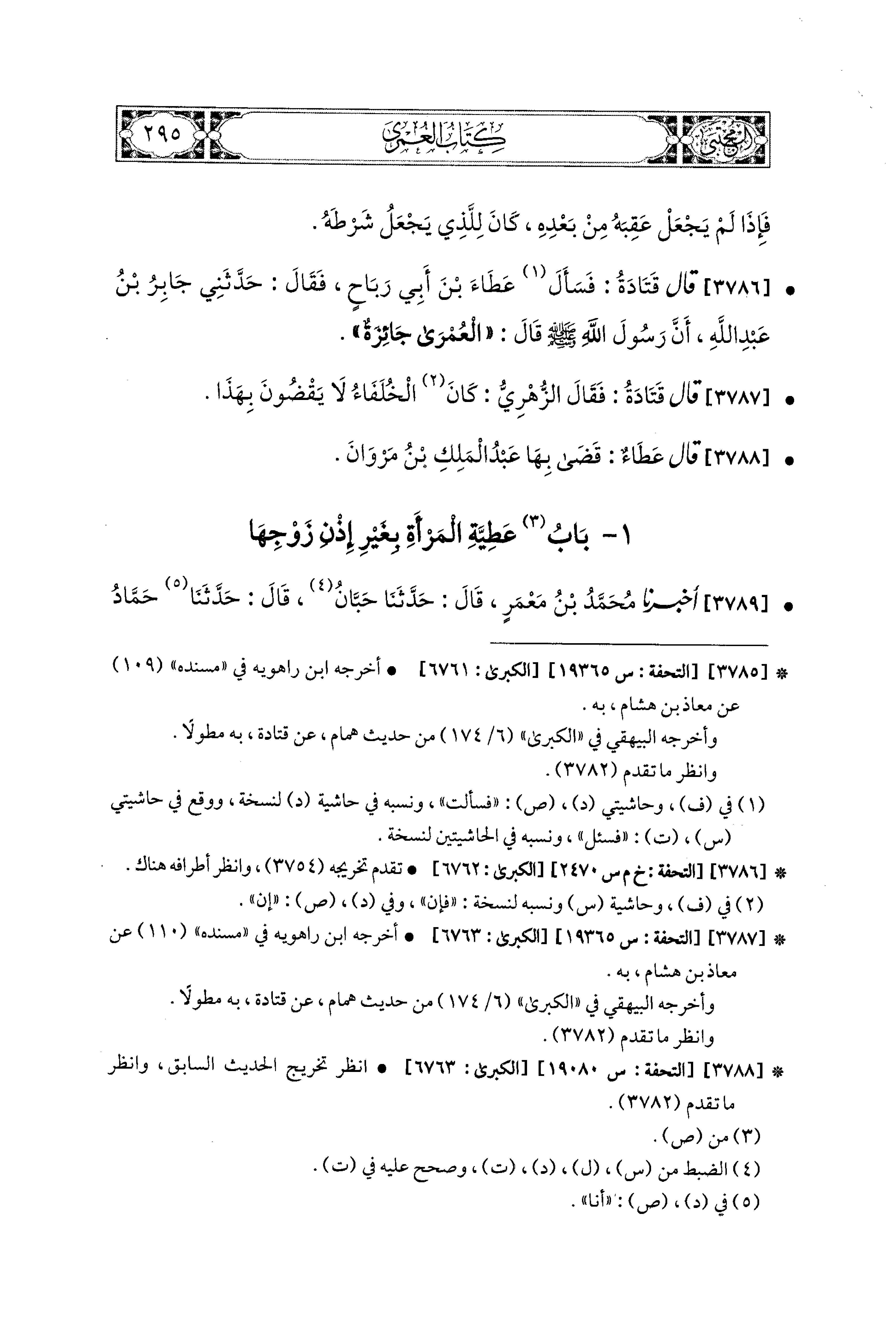 3786- قَالَ قَتَادَةُ: فَسُئِلَ عَطَاءُ بْنُ أَبِي رَبَاحٍ، فَقَالَ: حَدَّثَني جَابِرُ بْنُ عَبدِ اللهِ، أَنَّ رَسُولَ اللهِ صَلى الله عَليه وسَلم قَالَ: العُمْرَى جَائِزَةٌ.