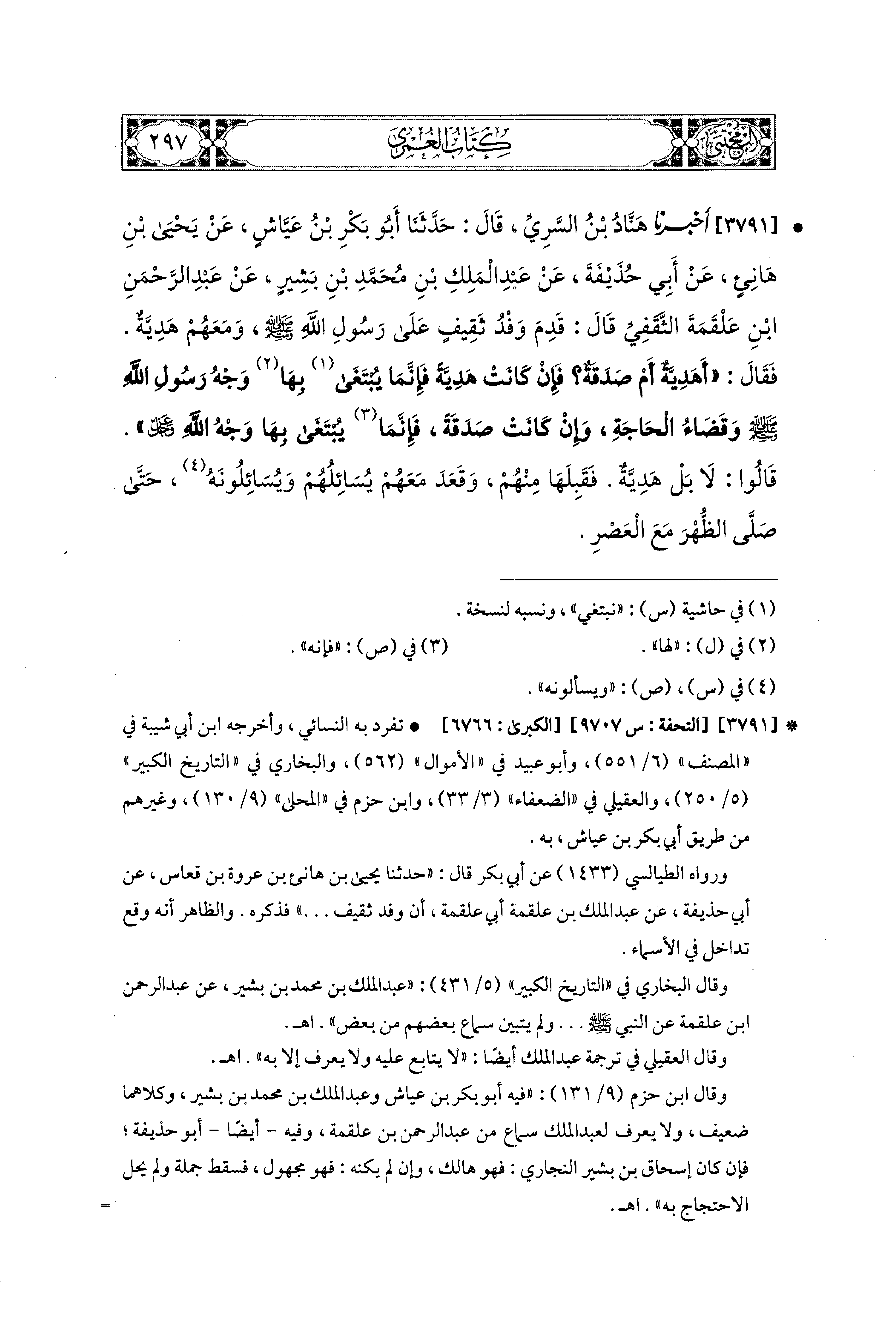 3791 - أَخبَرَنا هَنَّادُ بْنُ السَّرِيِّ، قال: حَدثنا أَبو بَكْرِ بْنُ عَيَّاشٍ، عَن يَحيَى بْنِ هَانِئٍ, عَن أَبِي حُذَيفَةَ، عَن عَبدِ المَلِكِ بْنِ مُحَمدِ بْنِ نُسَيْرٍ (1)، عَن عَبدِ الرَّحمَنِ بْنِ عَلْقَمَةَ الثَّقَفِّيِّ، قَالَ: قَدِمَ وَفْدُ ثَقِيفٍ عَلَى رَسُولِ اللهِ صَلى الله عَليه وسَلم وَمَعَهُمْ هَدِيَّةٌ، فَقَالَ: أَهَدِيَّةٌ أَمْ صَدَقَةٌ؟ فَإِنْ كَانَتْ هَدِيَّةٌ فَإِنَّمَا يُبْتَغَى بِهَا وَجْهُ رَسُولِ اللهِ صَلى الله عَليه وسَلم وَقَضَاءُ الحَاجَةِ، وَإِنْ كَانَتْ صَدَقَةٌ فَإِنَّمَا يُبْتَغَى بِهَا وَجْهُ اللهِ عَزَّ وَجَلَّ، قَالُوا: لاَ بَلْ هَدِيَّةٌ، فَقَبِلَهَا مِنْهُمْ وَقَعَدَ مَعَهُمْ يُسَائِلُهُمْ وَيُسَائِلُونَهُ حَتَّى صَلَّى الظُّهْرَ مَعَ العَصْرِ.