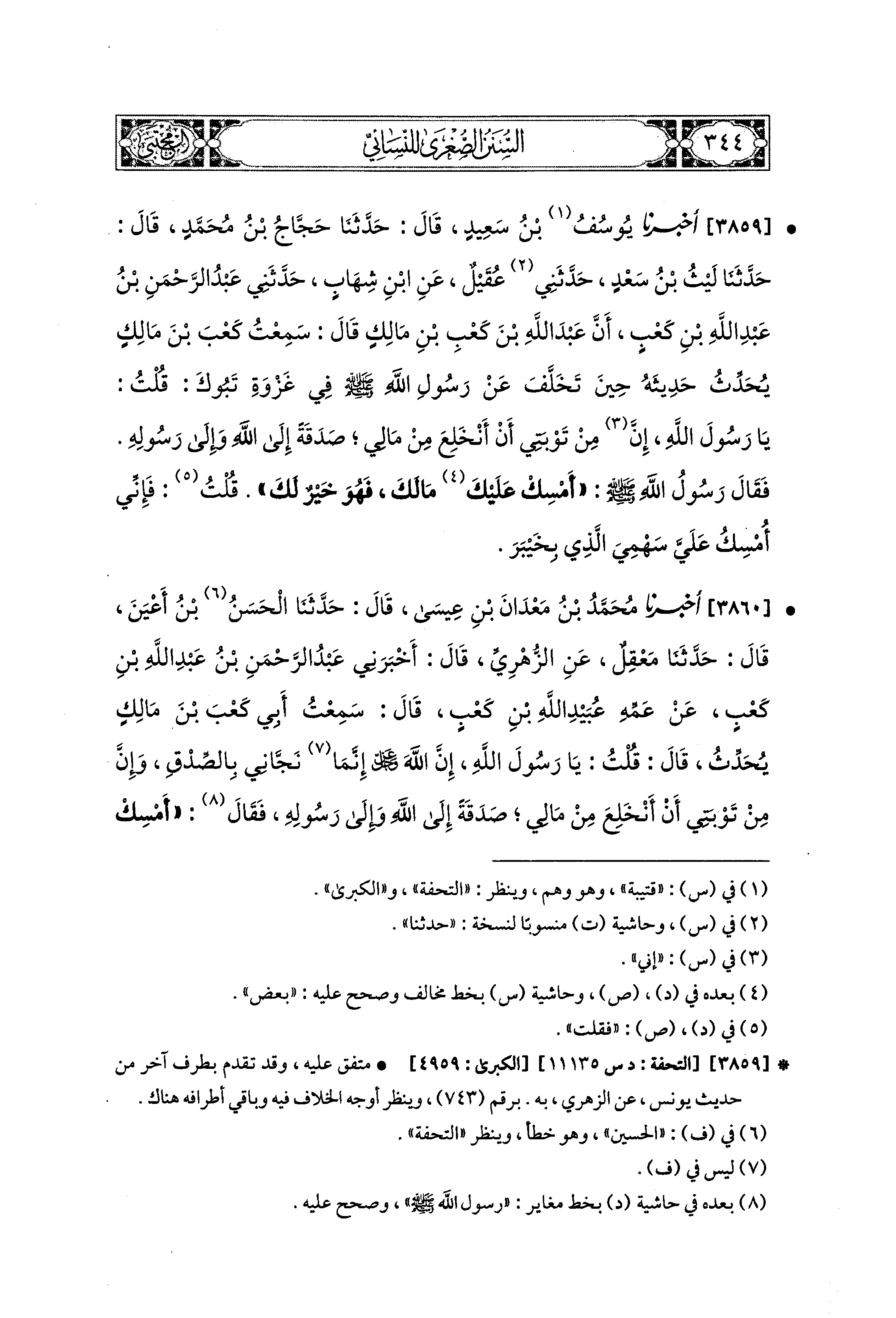 3859- أَخبَرَنا يُوسُفُ بْنُ سَعيدٍ، قال: حَدثنا حَجَّاجُ بْنُ مُحَمدٍ، قال: حَدثنا لَيْثُ بْنُ سَعْدٍ، حَدَّثَني عُقَيْلٌ، عَنِ ابنِ شِهَابٍ، حَدَّثَني عَبدُ الرَّحمَنِ بْنُ عَبدِ اللهِ بْنِ كَعْبٍ، أَنَّ عَبدَ اللهِ بْنَ كَعْبِ بْنِ مَالِكٍ، قَالَ: سَمِعْتُ كَعْبَ بْنَ مَالِكٍ، يُحَدِّثُ حَدِيثَهُ حِينَ تَخَلَّفَ عَن رَسُولِ اللهِ صَلى الله عَليه وسَلم فِي غَزْوَةِ تَبُوكَ، قُلْتُ: يَا رَسُولَ اللهِ، إِنَّ مِنْ تَوْبَتِي أَنْ أَنْخَلِعَ مِنْ مَالِي صَدَقَةً إِلَى اللهِ وَإِلَى رَسُولِهِ، فَقَالَ رَسُولُ اللهِ صَلى الله عَليه وسَلم: أَمْسِكْ عَلَيْكَ مَالَكَ فَهُوَ خَيْرٌ لَكَ، قُلْتُ: فَإِنِّي أُمْسِكُ عَلَيَّ سَهْمي الَّذِي بِخَيْبَرَ.