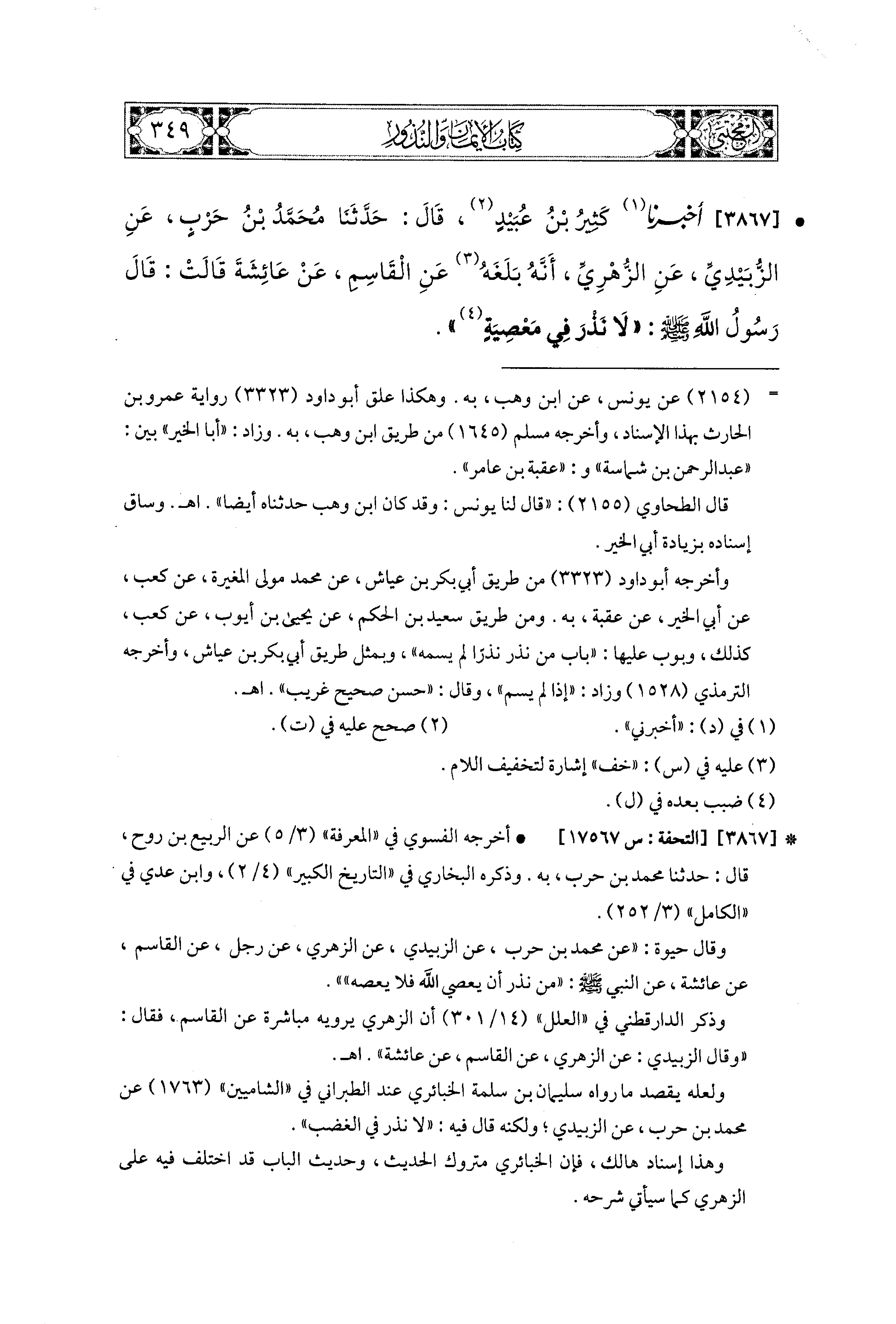 3867- أَخبَرَنا كَثِيرُ بْنُ عُبَيدٍ، قال: حَدثنا مُحَمدُ بْنُ حَرْبٍ، عَنِ الزُّبَيْدِيِّ، عَنِ الزُّهْرِيِّ، أَنَّهُ بَلَغَهُ عَنِ القَاسِمِ، عَن عَائِشَةَ، قَالَتْ: قَالَ رَسُولُ اللهِ صَلى الله عَليه وسَلم: لاَ نَذْرَ فِي مَعْصِيَةٍ.