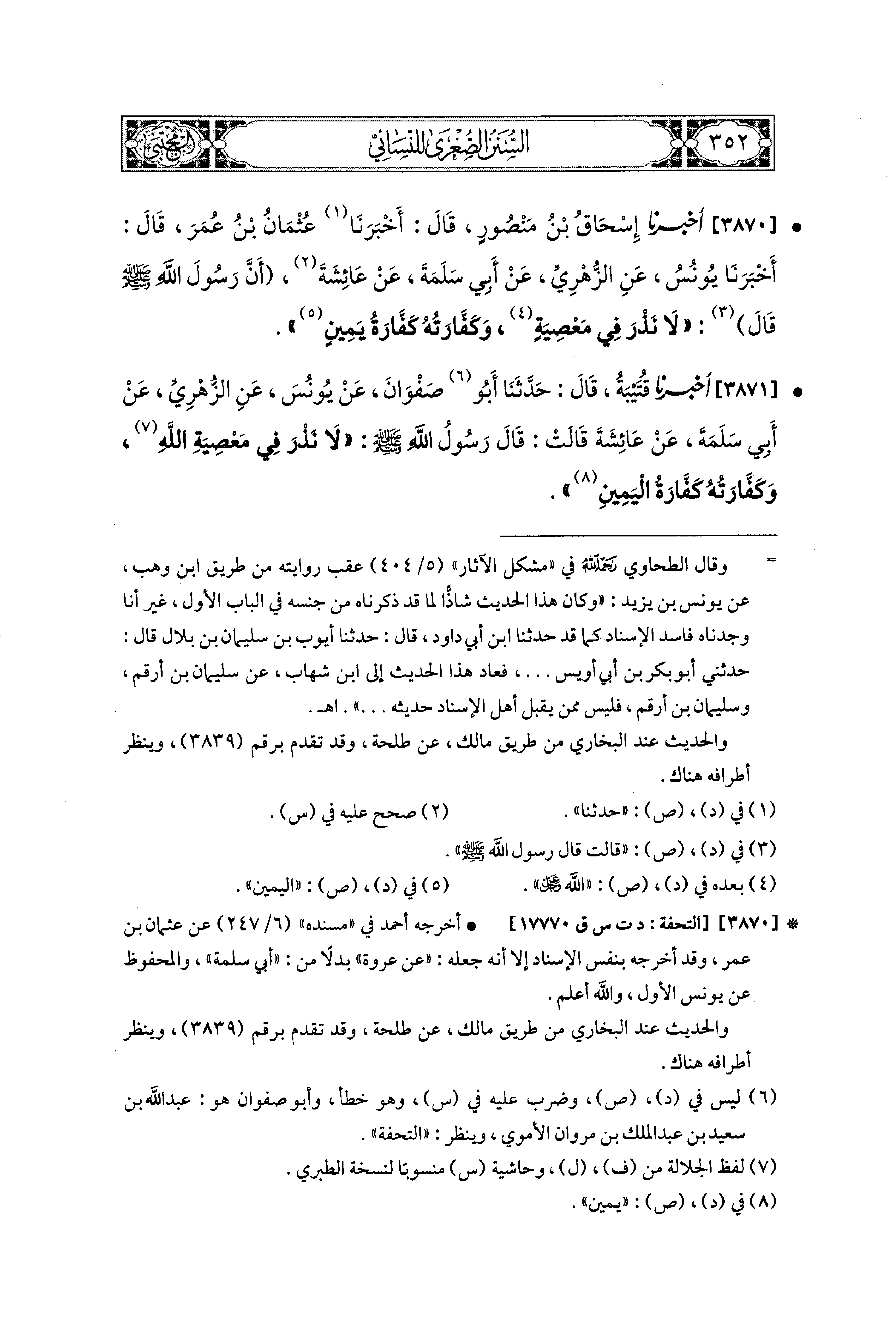 3871- أَخبَرَنا قُتَيبَةُ، قال: حَدثنا أَبو صَفْوَانَ، عَن يُونُسَ، عَنِ الزُّهْرِيِّ، عَن أَبِي سَلَمَةَ، عَن عَائِشَةَ، قَالَتْ: قَالَ رَسُولُ اللهِ صَلى الله عَليه وسَلم: لاَ نَذْرَ فِي مَعْصِيَةٍ الله، وَكَفَّارَتُهُ كَفَّارَةُ اليَمينِ.