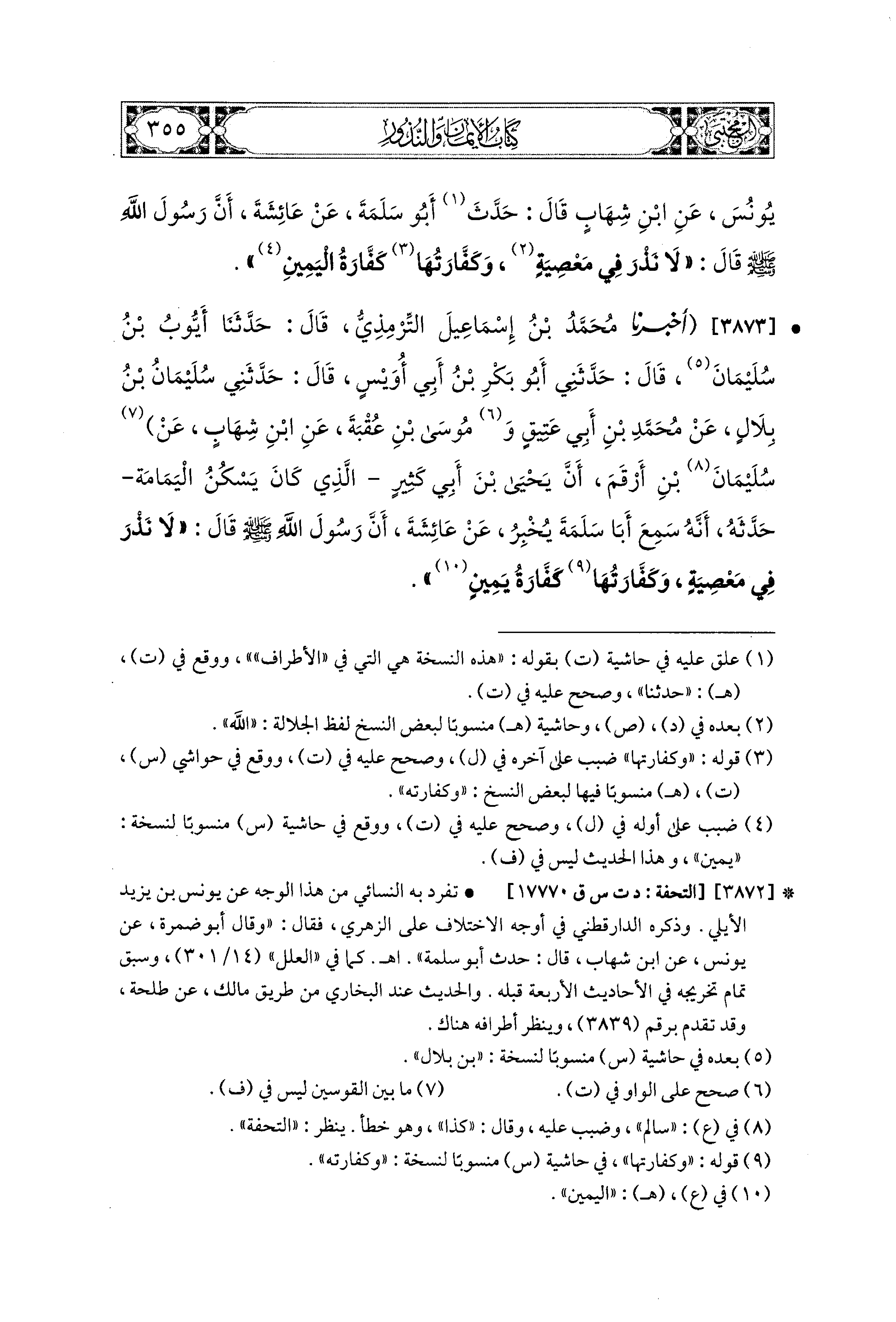 3873- أَخبَرَنا مُحَمد بْنُ إِسماعِيلَ التِّرْمِذِيُّ، قال: حَدثنا أَيُّوبُ بْنُ سُلَيمَانَ، قَالَ: حَدَّثَني أَبو بَكْرِ بْنُ أَبِي أُوَيْسٍ، قَالَ: حَدَّثَني سُلَيمَانُ بْنُ بِلاَلٍ، عَن مُحَمدِ بْنِ أَبِي عَتِيقٍ، وَمُوسَى بْنِ عُقْبَةَ، عَنِ ابنِ شِهَابٍ، عَن سُلَيمَانَ بْنِ أَرْقَمَ، أَنَّ يَحيَى بْنَ أَبِي كَثِيرٍ، الَّذِي كَانَ يَسْكُنُ اليَمَامَةَ حَدَّثَهُ، أَنَّهُ سَمِعَ أَبَا سَلَمَةَ، يُخْبِرُ عَن عَائِشَةَ، أَنَّ رَسُولَ اللهِ صَلى الله عَليه وسَلم قَالَ: لاَ نَذْرَ فِي مَعْصِيَةٍ، وَكَفَّارَتُهَا كَفَّارَةُ يَمينٍ.