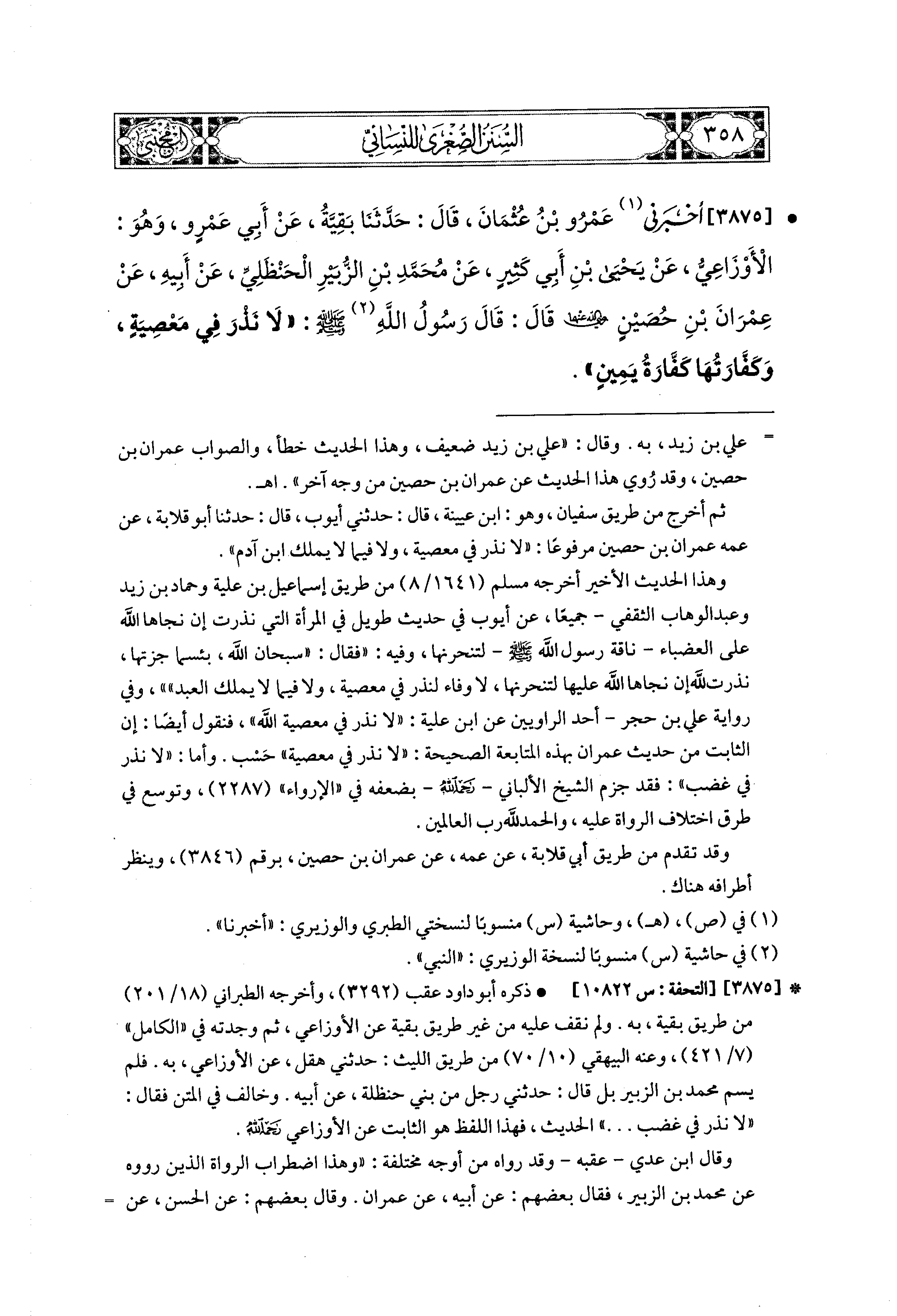 3875- أَخْبَرَني عَمْرُو بْنُ عُثمَانَ، قال: حَدثنا بَقِيَّةُ، عَن أَبِي عَمْرٍو، وَهُوَ الأَوْزَاعِيُّ، عَن يَحيَى بْنِ أَبِي كَثِيرٍ، عَن مُحَمدِ بْنِ الزُّبَيْرِ الحَنْظَلِيِّ، عَن أَبِيهِ، عَن عِمْرَانَ بْنِ حُصَيْنٍ، رَضِيَ اللهُ عَنْهُمَا، قَالَ: قَالَ رَسُولُ اللهِ صَلى الله عَليه وسَلم: لاَ نَذْرَ فِي مَعْصِيَةٍ، وَكَفَّارَتُهَا كَفَّارَةُ يَمينٍ.