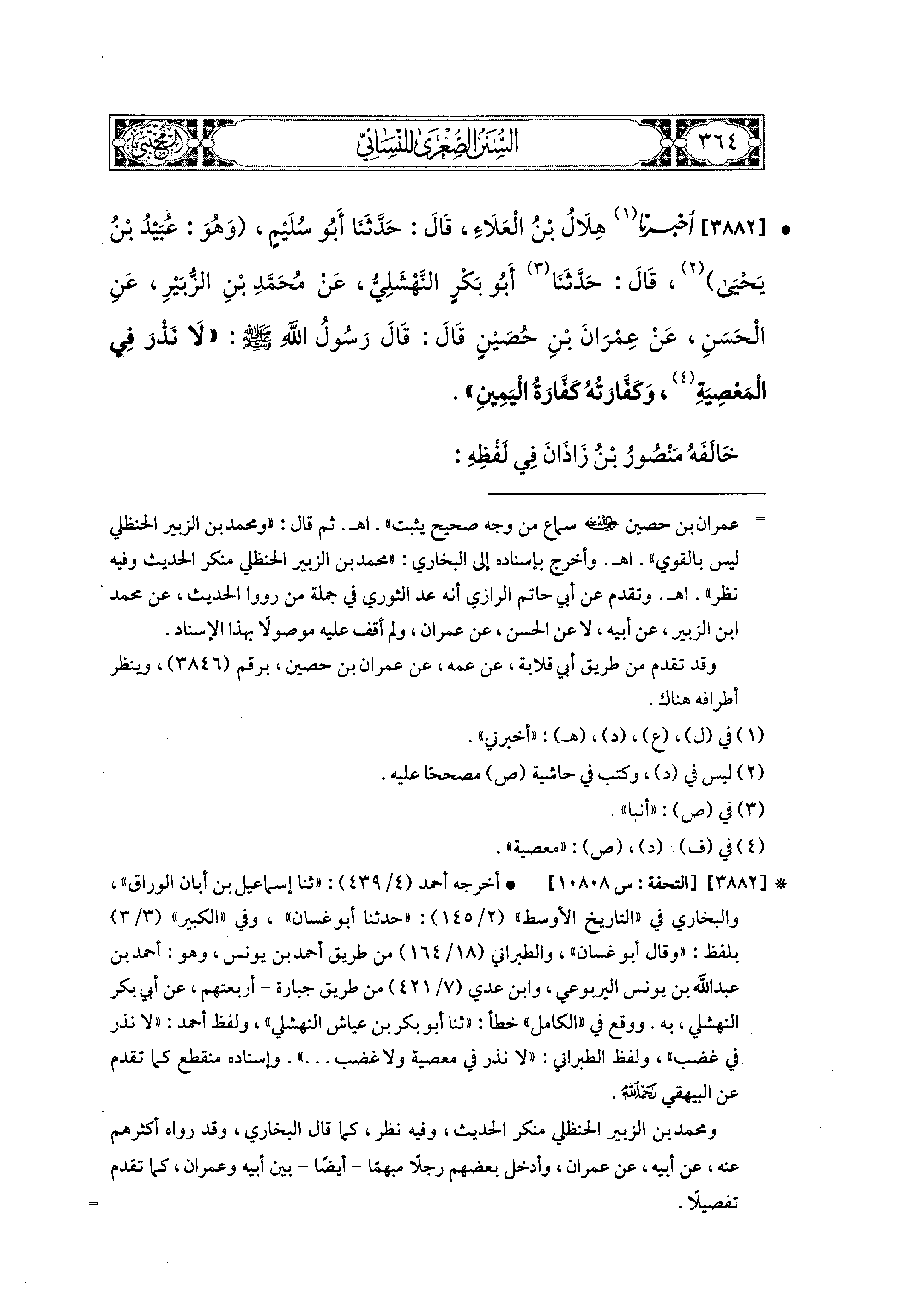 3882- أَخبَرَنا هِلاَلُ بْنُ العَلاَءِ، قال: حَدثنا أَبو سُلَيْمٍ، وَهُوَ عُبَيدُ بْنُ يَحيَى، قال: حَدثنا أَبو بَكْرٍ النَّهْشَلِيُّ، عَن مُحَمدِ بْنِ الزُّبَيْرِ، عَنِ الحَسَنِ، عَن عِمْرَانَ بْنِ حُصَيْنٍ، قَالَ: قَالَ رَسُولُ اللهِ صَلى الله عَليه وسَلم: لاَ نَذْرَ فِي المَعْصِيَةِ، وَكَفَّارَتُهُ كَفَّارَةُ اليَمينِ.