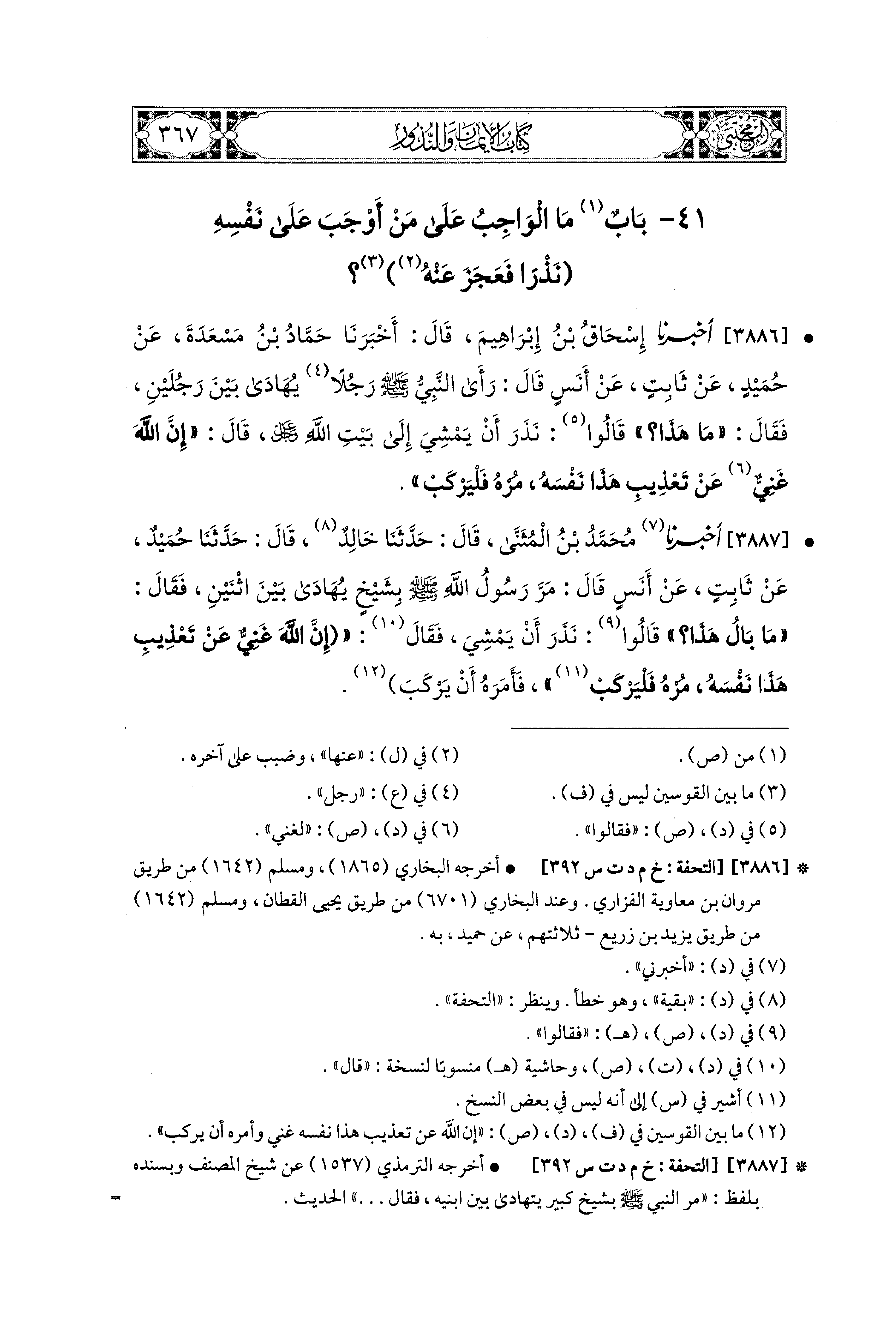 3887- أَخبَرَنا مُحَمد بْنُ المُثَنَّى، قال: حَدثنا خَالِدٌ، قال: حَدثنا حُمَيْدٌ، عَن ثَابِتٍ، عَن أَنَسٍ، قَالَ: مَرَّ رَسُولُ اللهِ صَلى الله عَليه وسَلم بِشَيْخٍ يُهَادَى بَيْنَ اثْنَيْنِ، فَقَالَ: مَا بَالُ هَذَا؟ قَالُوا: نَذَرَ أَنْ يَمْشِيَ، قَالَ: إِنَّ اللهَ غَنيٌّ عَن تَعْذِيبِ هَذَا نَفْسَهُ، مُرْهُ فَلْيَرْكَبْ فَأَمَرَهُ أَنْ يَرْكَبَ.
