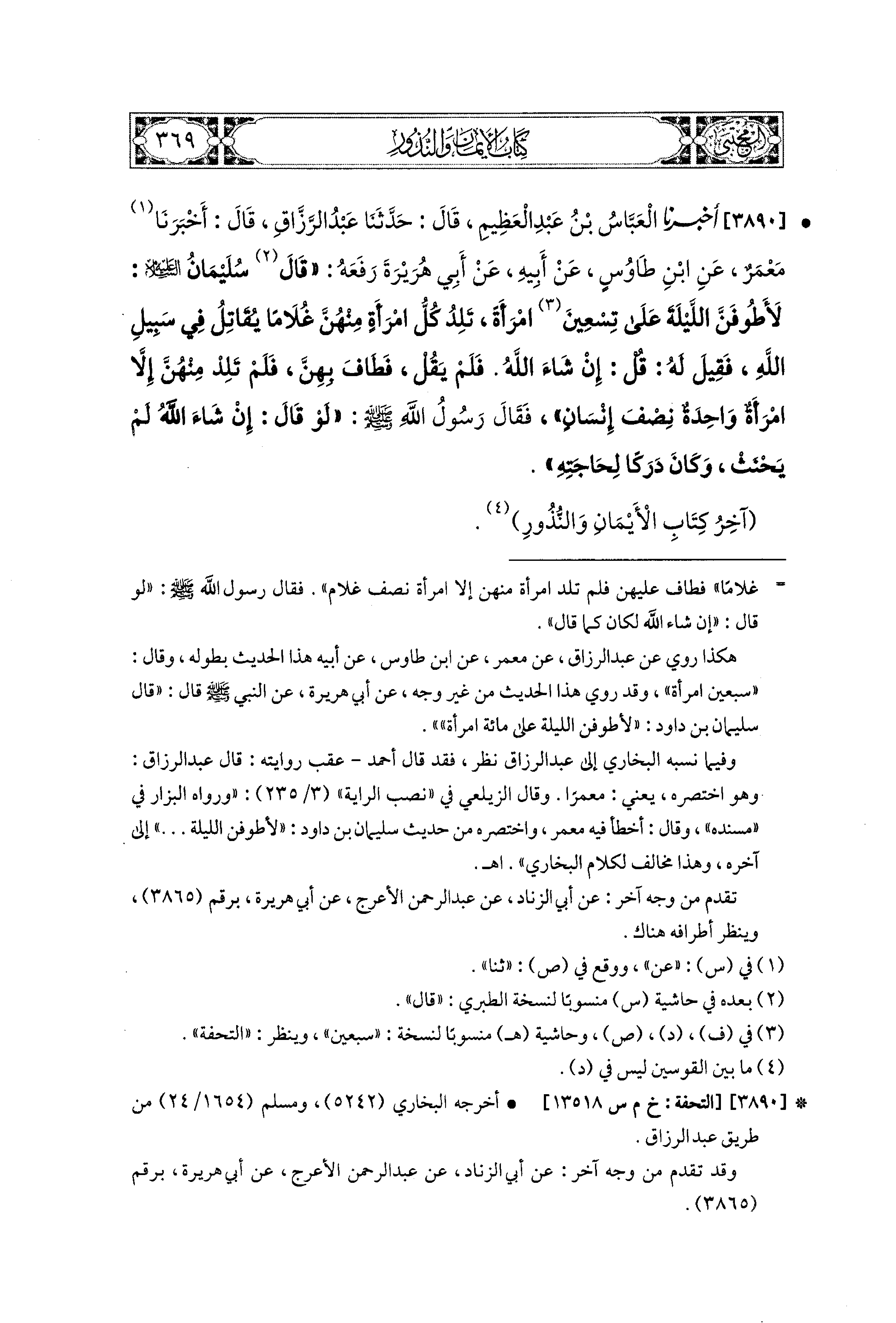3890- أَخبَرَنا العَبَّاسُ بْنُ عَبدِ العَظِيمِ، قال: حَدثنا عَبدُ الرَّزَّاقِ، قَالَ: أَخبَرنا مَعْمَرٌ، عَنِ ابنِ طَاوُوسٍ، عَن أَبِيهِ، عَن أَبِي هُرَيرَةَ، رَفَعَهُ: قَالَ سُلَيمَانُ عليه السلام: لأَطُوفَنَّ اللَّيلَةَ عَلَى تِسْعِينَ امْرَأَةً تَلِدُ كُلُّ امْرَأَةٍ مِنْهُنَّ غُلاَمًا يُقَاتِلُ فِي سَبِيلِ اللهِ، فَقِيلَ لَهُ: قُلْ: إِنْ شَاءَ اللهُ، فَلَمْ يَقُلْ، فَطَافَ بِهِنَّ، فَلَمْ تَلِدْ مِنْهُنَّ إِلاَّ امْرَأَةٌ وَاحِدَةٌ نِصْفَ إِنْسَانٍ، فَقَالَ رَسُولُ اللهِ صَلى الله عَليه وسَلم: لَوْ قَالَ: إِنْ شَاءَ اللهُ لَمْ يَحْنَثْ وَكَانَ دَرَكًا لِحَاجَتِهِ.