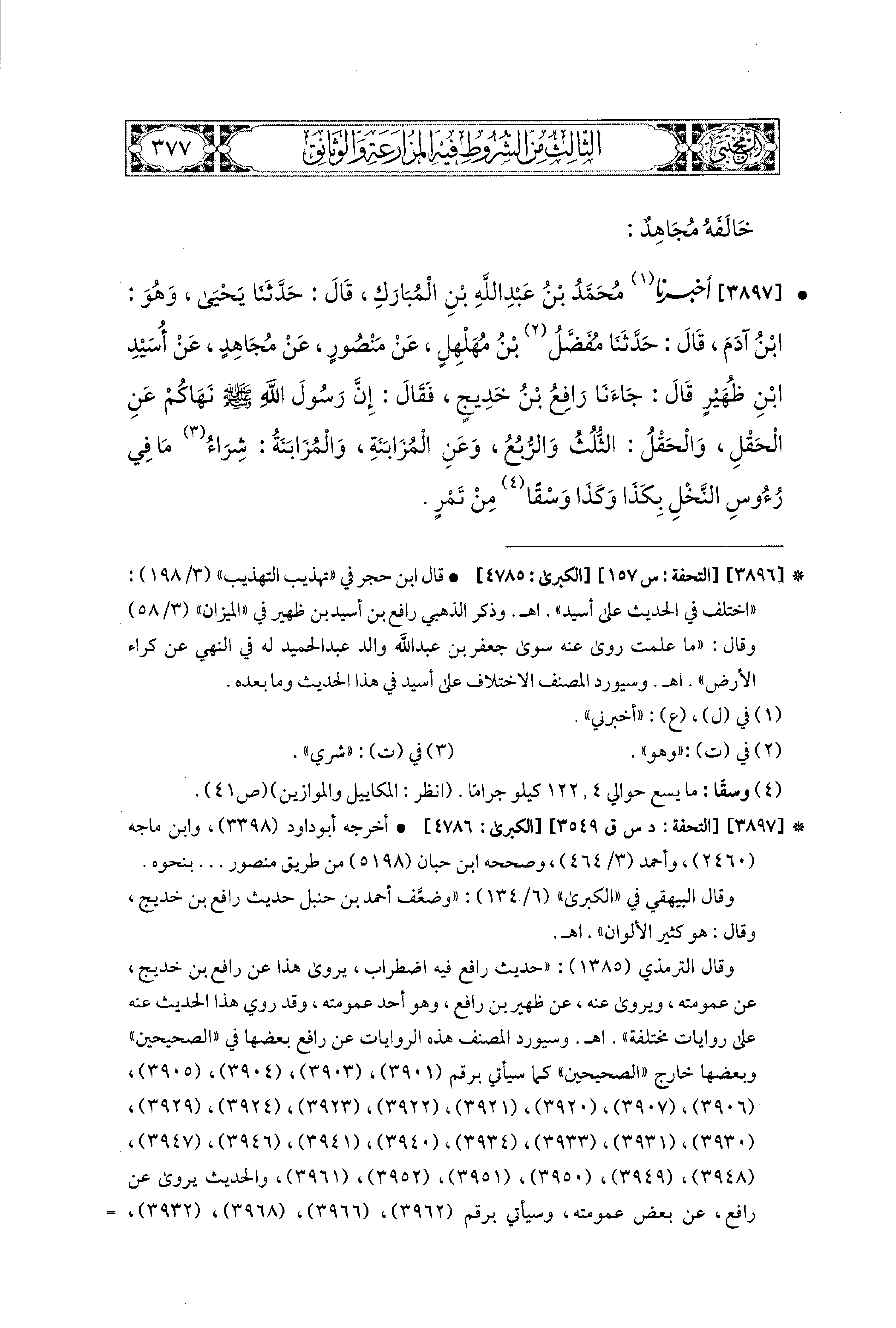 3897- أَخبَرَنا مُحَمد بْنُ عَبدِ اللهِ بْنِ المُبَارَكِ، قال: حَدثنا يَحيَى، وَهُوَ ابْنُ آدَمَ، قال: حَدثنا مُفَضَّلٌ، وَهُوَ ابْنُ مُهَلْهَلٍ، عَن مَنْصُورٍ، عَن مُجَاهِدٍ، عَن أُسَيْدِ بْنِ ظُهَيْرٍ، قَالَ: جَاءَنَا رَافِعُ بْنُ خَدِيجٍ، فَقَالَ: إِنَّ رَسُولَ اللهِ صَلى الله عَليه وسَلم، نَهَاكُمْ عَنِ الحَقْلِ، وَالحَقْلُ الثُّلُثُ وَالرُّبُعُ، وَعَنِ المُزَابَنَةِ.
