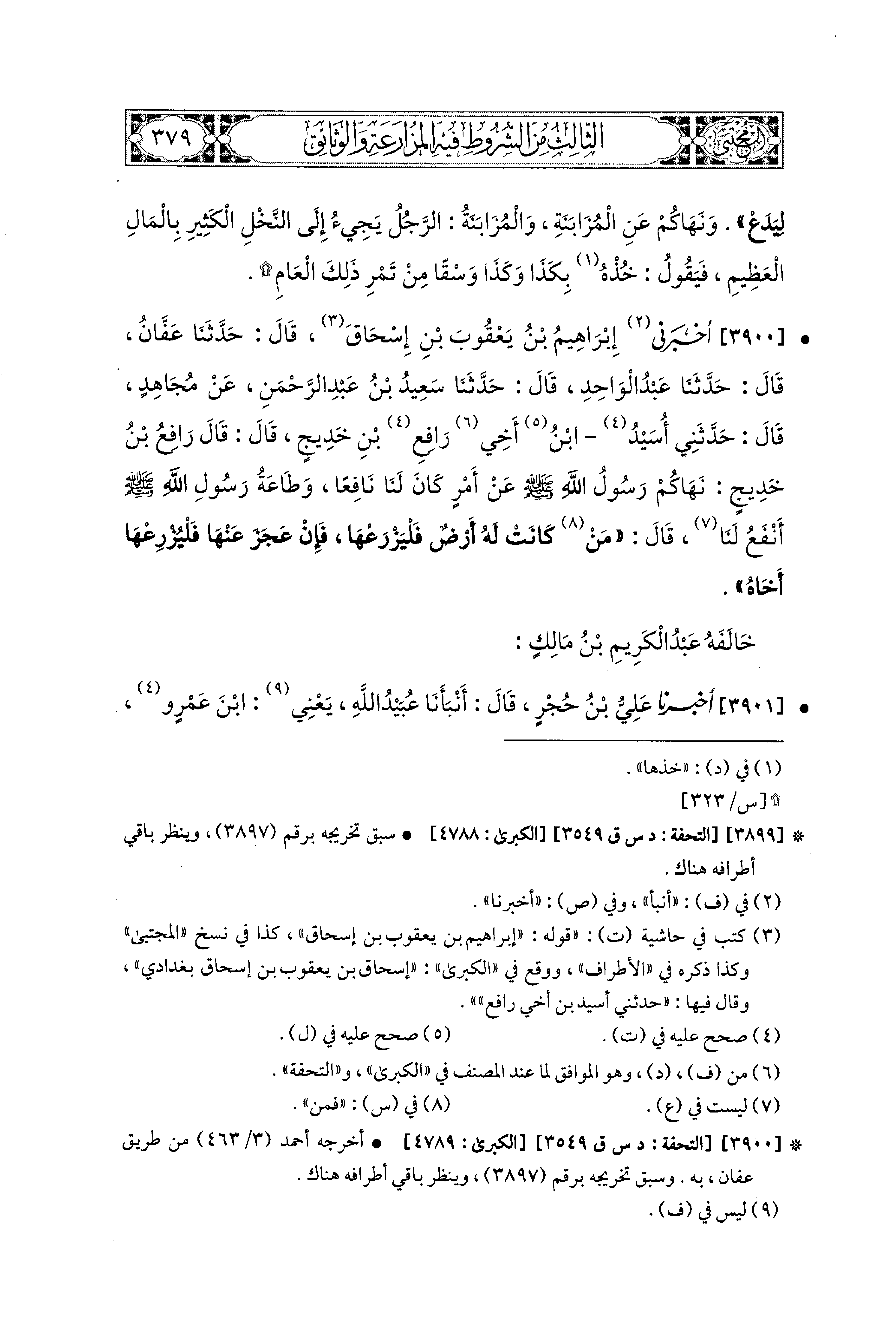 3900- أَخْبَرَني إِسحَاقُ (1) بْنُ يَعْقُوبَ بْنِ إِسحَاقَ البَغْدَادِيُّ أَبو مُحَمدٍ، قال: حَدثنا عَفَّانُ، قال: حَدثنا عَبدُ الوَاحِدِ، قال: حَدثنا سَعيدُ بْنُ عَبدِ الرَّحمَنِ، عَن مُجَاهِدٍ، قَالَ: حَدَّثَني أُسَيْدُ ابْنُ أَخِي رَافِعِ بْنِ خَدِيجٍ، قَالَ: قَالَ رَافِعُ بْنُ خَدِيجٍ: نَهَاكُمْ رَسُولُ اللهِ صَلى الله عَليه وسَلم عَن أَمْرٍ كَانَ لَنَا نَافِعًا، وَطَاعَةُ رَسُولِ اللهِ صَلى الله عَليه وسَلم أَنْفَعُ لَنَا، قَالَ: مَنْ كَانَتْ لَهُ أَرْضٌ فَلْيَزْرَعْهَا، فَإِنْ عَجَزَ عَنْهَا فَلْيُزْرِعْهَا أَخَاهُ.
