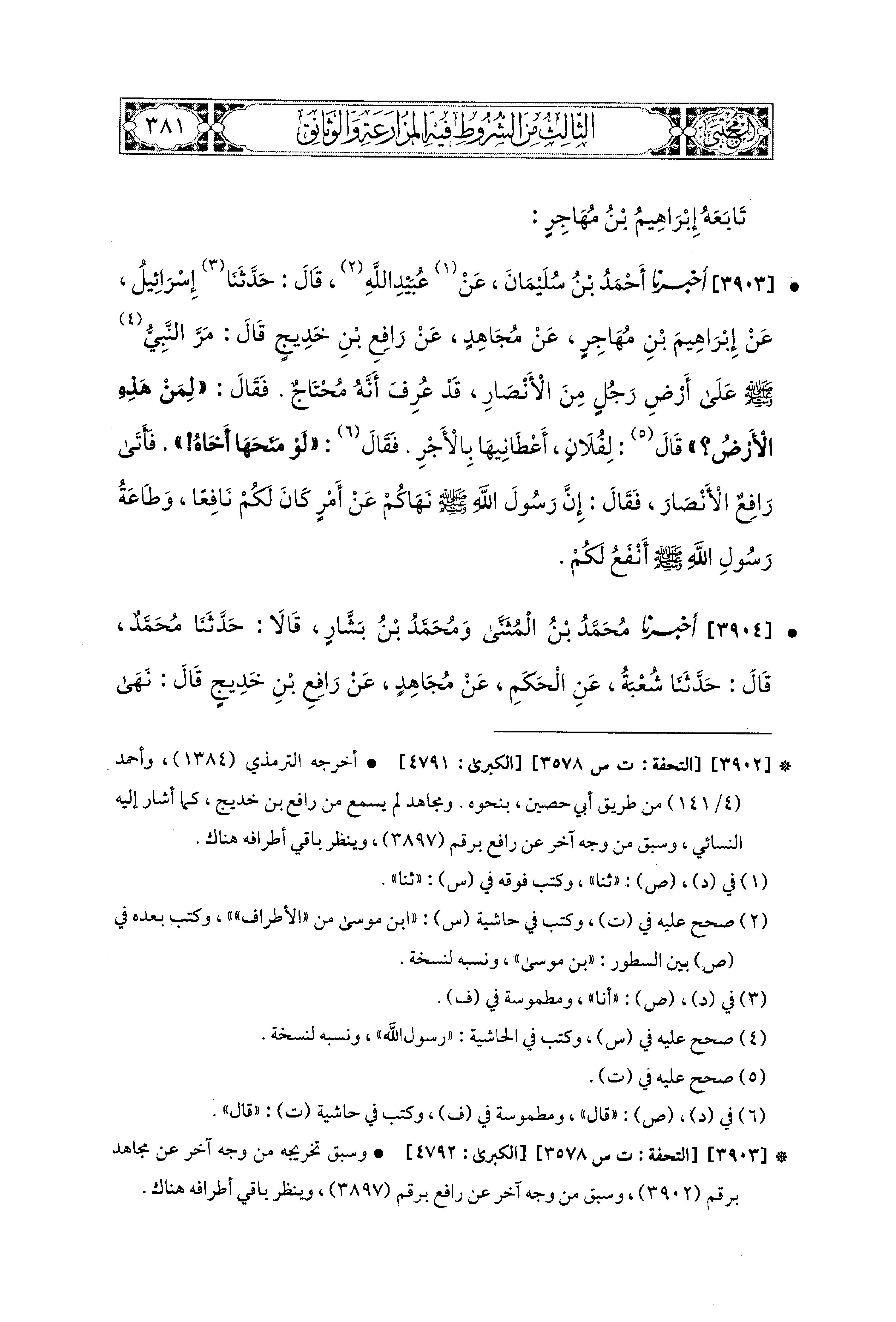3903- أَخبَرَنا أَحْمَدُ بْنُ سُلَيمَانَ، عَن عُبَيدِ اللهِ، قال: حَدثنا إِسْرَائِيلُ، عَن إِبراهِيمَ بْنِ مُهَاجِرٍ، عَن مُجَاهِدٍ، عَن رَافِعِ بْنِ خَدِيجٍ، قَالَ: مَرَّ النَّبيُّ صَلى الله عَليه وسَلم عَلَى أَرْضِ رَجُلٍ مِنَ الأَنصَارِ قَدْ عَرَفَ أَنَّهُ مُحْتَاجٌ، فَقَالَ: لِمَنْ هَذِهِ الأَرضُ؟ قَالَ: لِفُلاَنٍ، أَعْطَانيهَا بِالأَجْرِ، فَقَالَ: لَوْ مَنَحَهَا أَخَاهُ فَأَتَى رَافِعٌ الأَنصَارَ، فَقَالَ: إِنَّ رَسُولَ اللهِ صَلى الله عَليه وسَلم، نَهَاكُمْ عَن أَمْرٍ كَانَ لَكُمْ نَافِعًا، وَطَاعَةُ رَسُولِ اللهِ صَلى الله عَليه وسَلم أَنْفَعُ لَكُمْ.