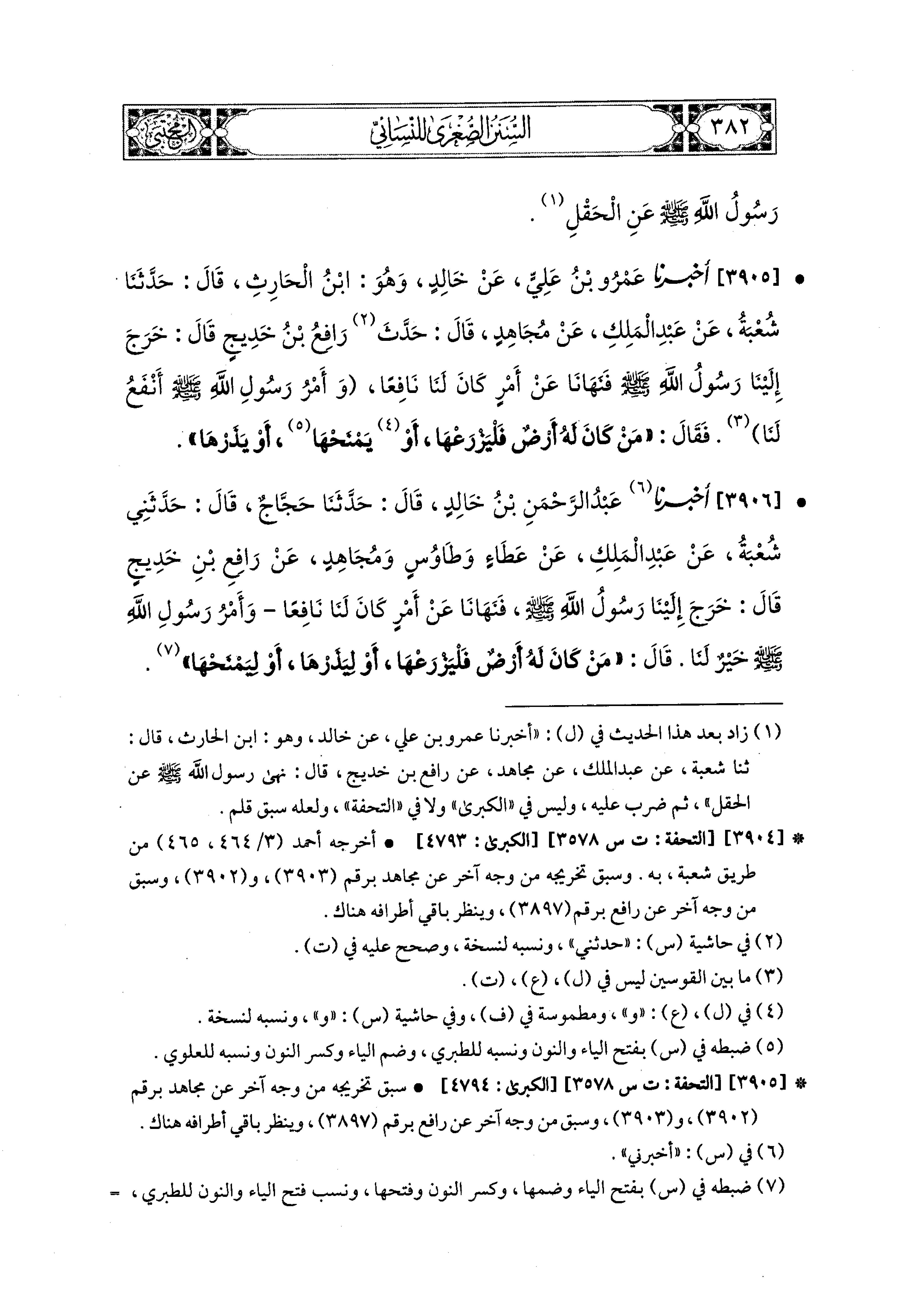 3905- أَخبَرَنا عَمْرُو بْنُ عَلِيٍّ، عَن خَالِدٍ، وَهُوَ ابْنُ الحَارِثِ، قال: حَدثنا شُعْبَةُ، عَن عَبدِ المَلِكِ، عَن مُجَاهِدٍ، قَالَ: حَدَّثَ رَافِعُ بْنُ خَدِيجٍ، قَالَ: خَرَجَ إِلَيْنَا رَسُولُ اللهِ صَلى الله عَليه وسَلم فَنَهَانَا عَن أَمْرٍ كَانَ لَنَا نَافِعًا (1)، فَقَالَ: مَنْ كَانَ لَهُ أَرْضٌ فَلْيَزْرَعْهَا، أَوْ يَمْنَحْهَا، أَوْ يَذَرْهَا.