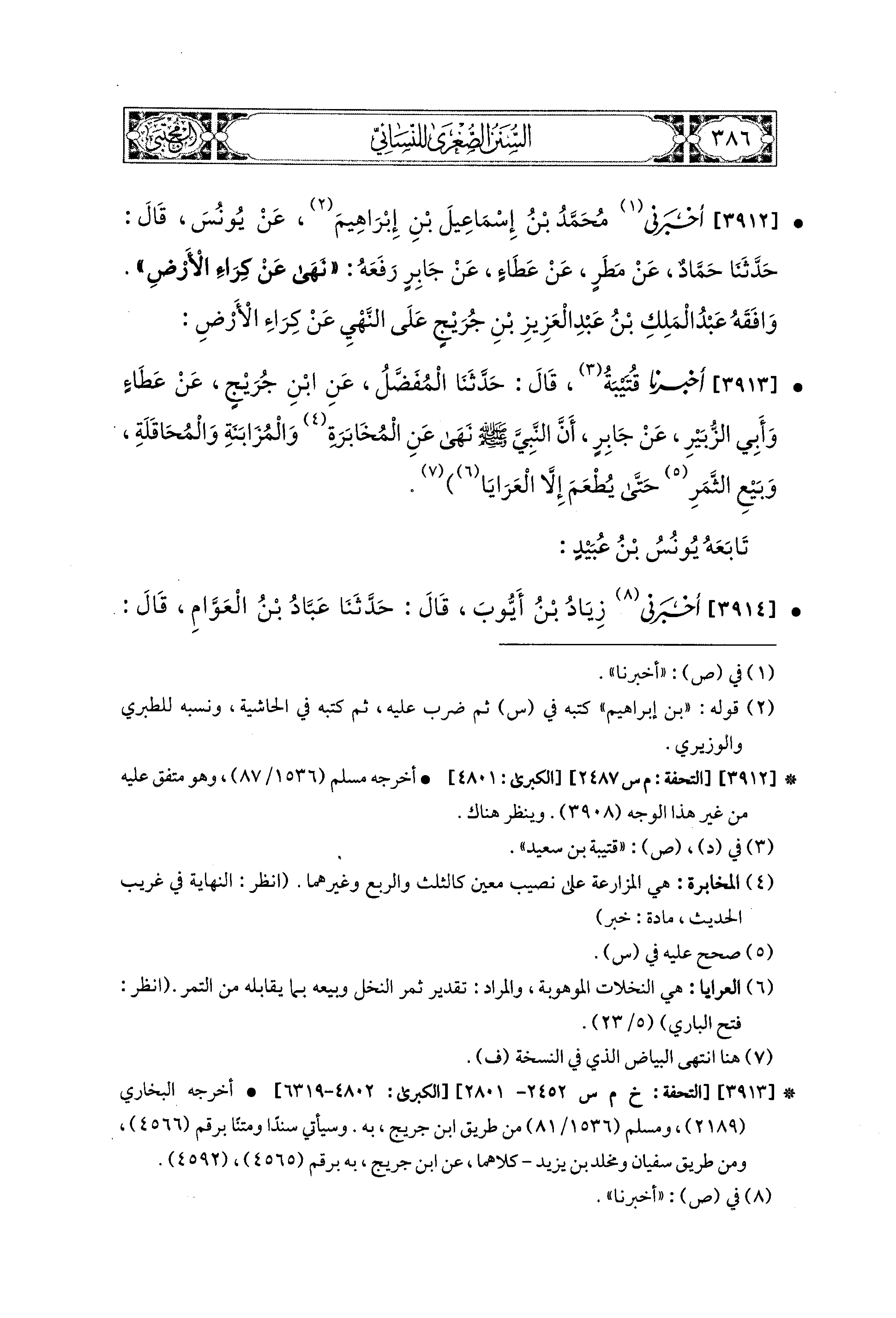 3914- أَخْبَرَني زِيَادُ بْنُ أَيُّوبَ، قال: حَدثنا عَبَّادُ بْنُ العَوَّامِ، قال: حَدثنا سُفْيَانُ بْنُ حُسَيْنٍ، قال: حَدثنا يُونُسُ بْنُ عُبَيدٍ، عَن عَطَاءٍ، عَن جَابِرٍ، أَنَّ النَّبيَّ صَلى الله عَليه وسَلم نَهَى عَنِ المُحَاقَلَةِ، وَالمُزَابَنَةِ، وَالمُخَابَرَةِ، وَعَنِ الثُّنْيَا إِلاَّ أَنْ تُعْلَمَ.