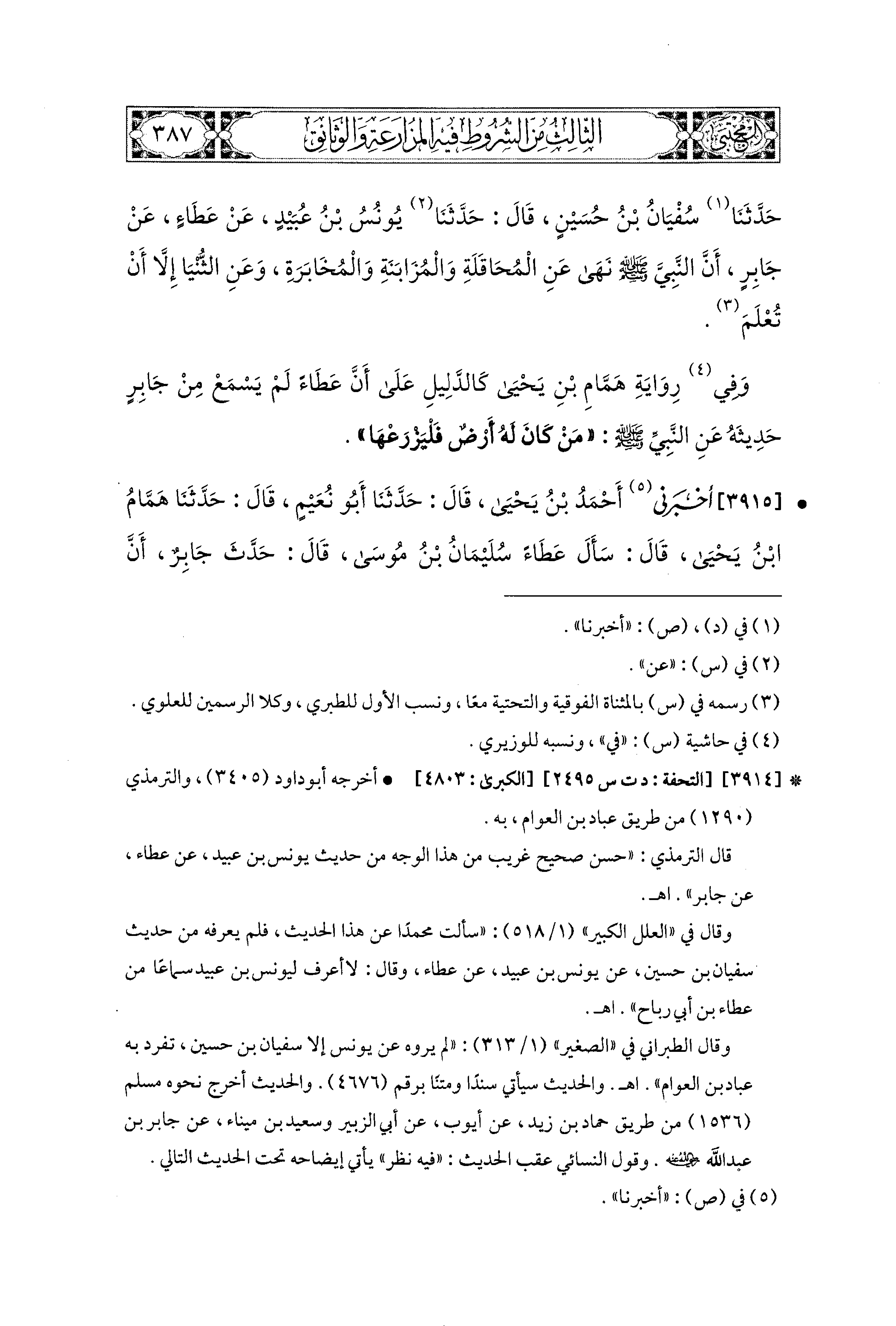 3915- أَخْبَرَني أَحْمَدُ بْنُ يَحيَى، قال: حَدثنا أَبو نُعَيْمٍ، قال: حَدثنا هَمَّامُ بْنُ يَحيَى، قَالَ: سَأَلَ عَطَاءٌ سُلَيمَانَ بْنَ مُوسَى، قَالَ: حَدَّثَ جَابِرٌ، أَنَّ رَسُولَ اللهِ صَلى الله عَليه وسَلم قَالَ: مَنْ كَانَتْ لَهُ أَرْضٌ فَلْيَزْرَعْهَا، أَوْ لِيُزْرِعْهَا أَخَاهُ، وَلاَ يُكْرِيهَا أَخَاهُ.