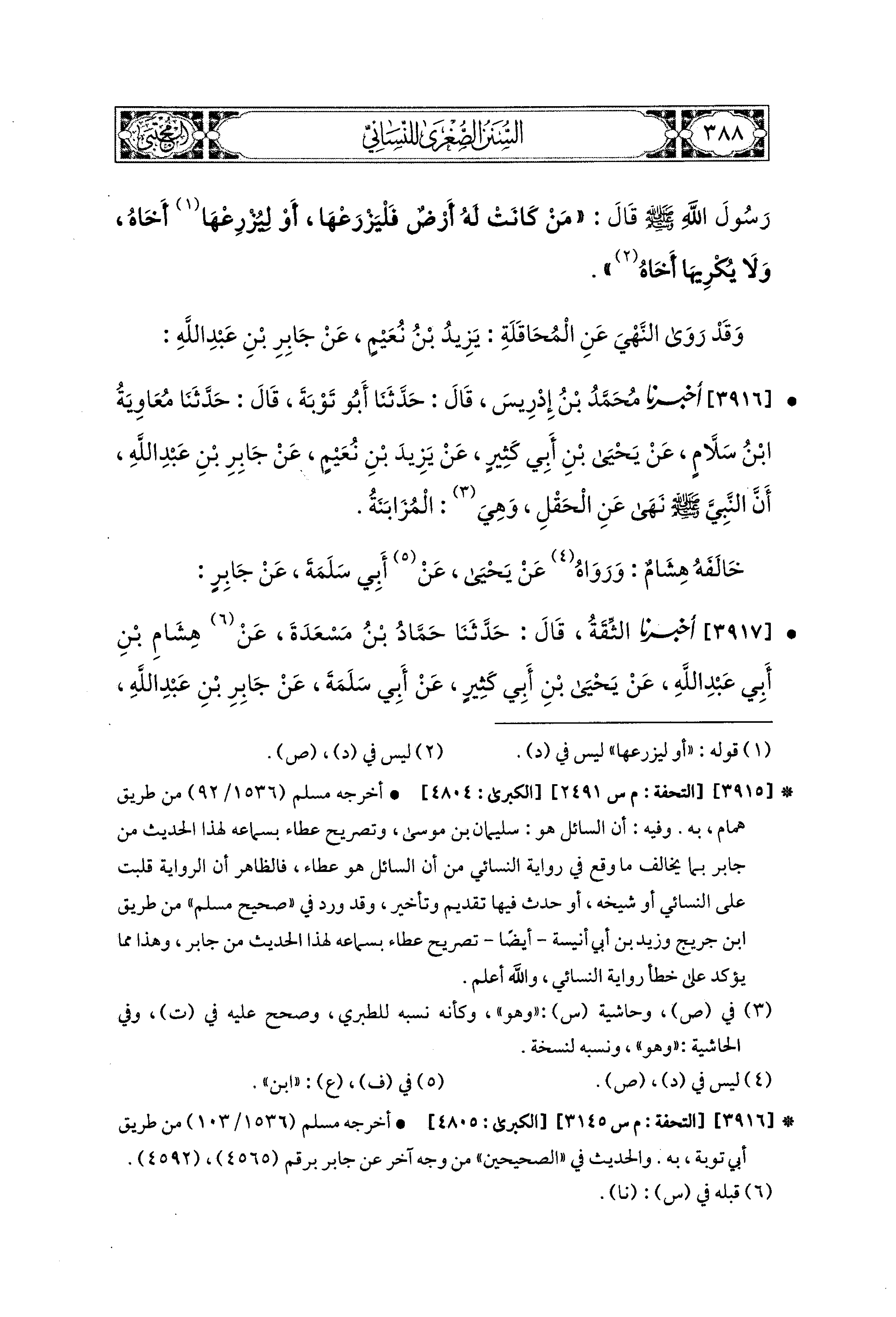 3916- أَخبَرَنا مُحَمد بْنُ إِدْرِيسَ، قال: حَدثنا أَبو تَوْبَةَ، قال: حَدثنا مُعَاوِيَةُ بْنُ سَلاَّمٍ، عَن يَحيَى بْنِ أَبِي كَثِيرٍ، عَن يَزِيدَ بْنِ نُعَيْمٍ، عَن جَابِرِ بْنِ عَبدِ اللهِ، أَنَّ النَّبيَّ صَلى الله عَليه وسَلم، نَهَى عَنِ الحَقْلِ، وَهِيَ المُزَابَنَةُ.