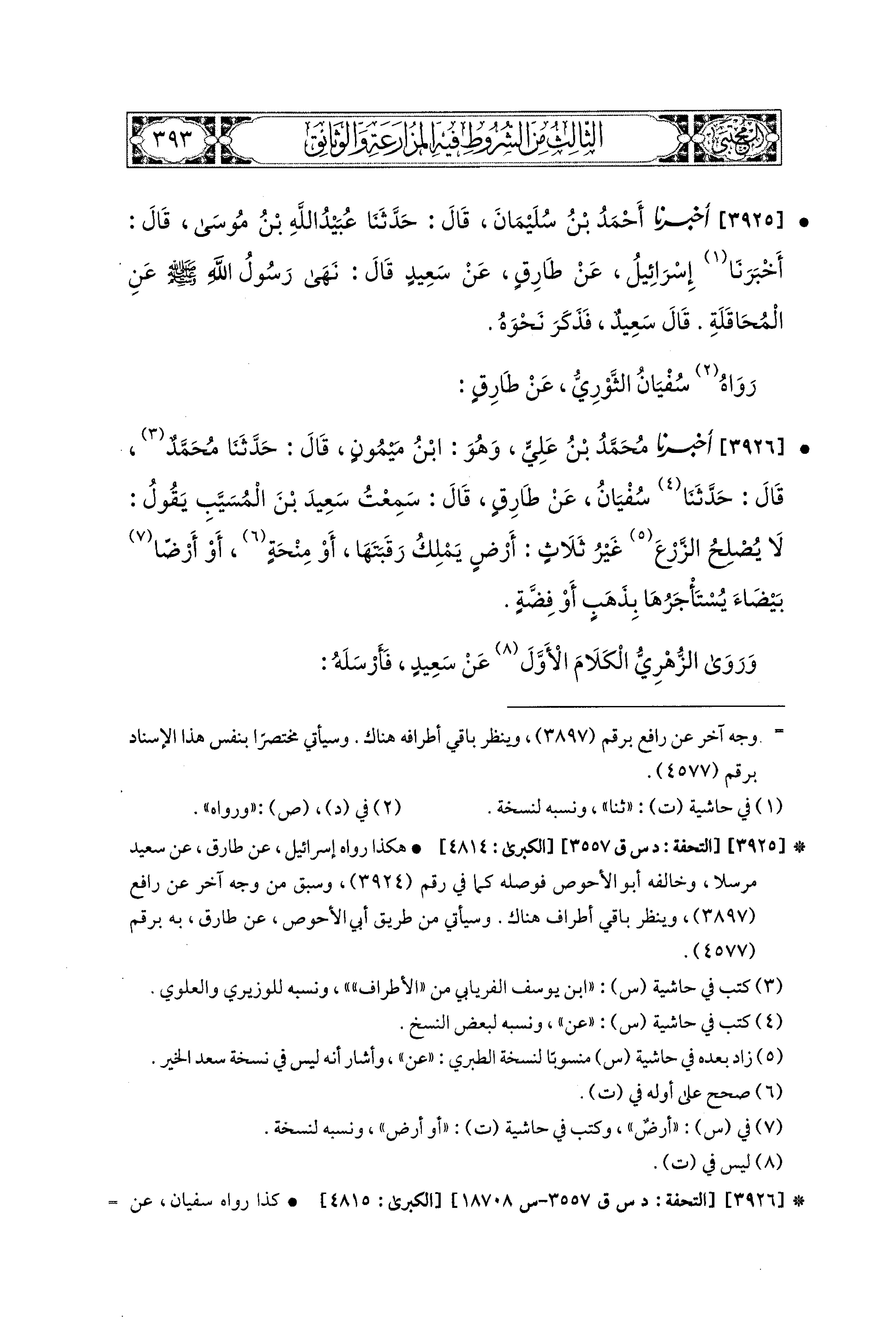 3925- أَخبَرَنا أَحْمَدُ بْنُ سُلَيمَانَ، قال: حَدثنا عُبَيدُ اللهِ بْنُ مُوسَى، قَالَ: أَخبَرنا إِسْرَائِيلُ، عَن طَارِقٍ، عَن سَعيدٍ قَالَ: نَهَى رَسُولُ اللهِ صَلى الله عَليه وسَلم عَنِ المُحَاقَلَةِ، قَالَ سَعيدٌ: فَذَكَرَ نَحْوَهُ .