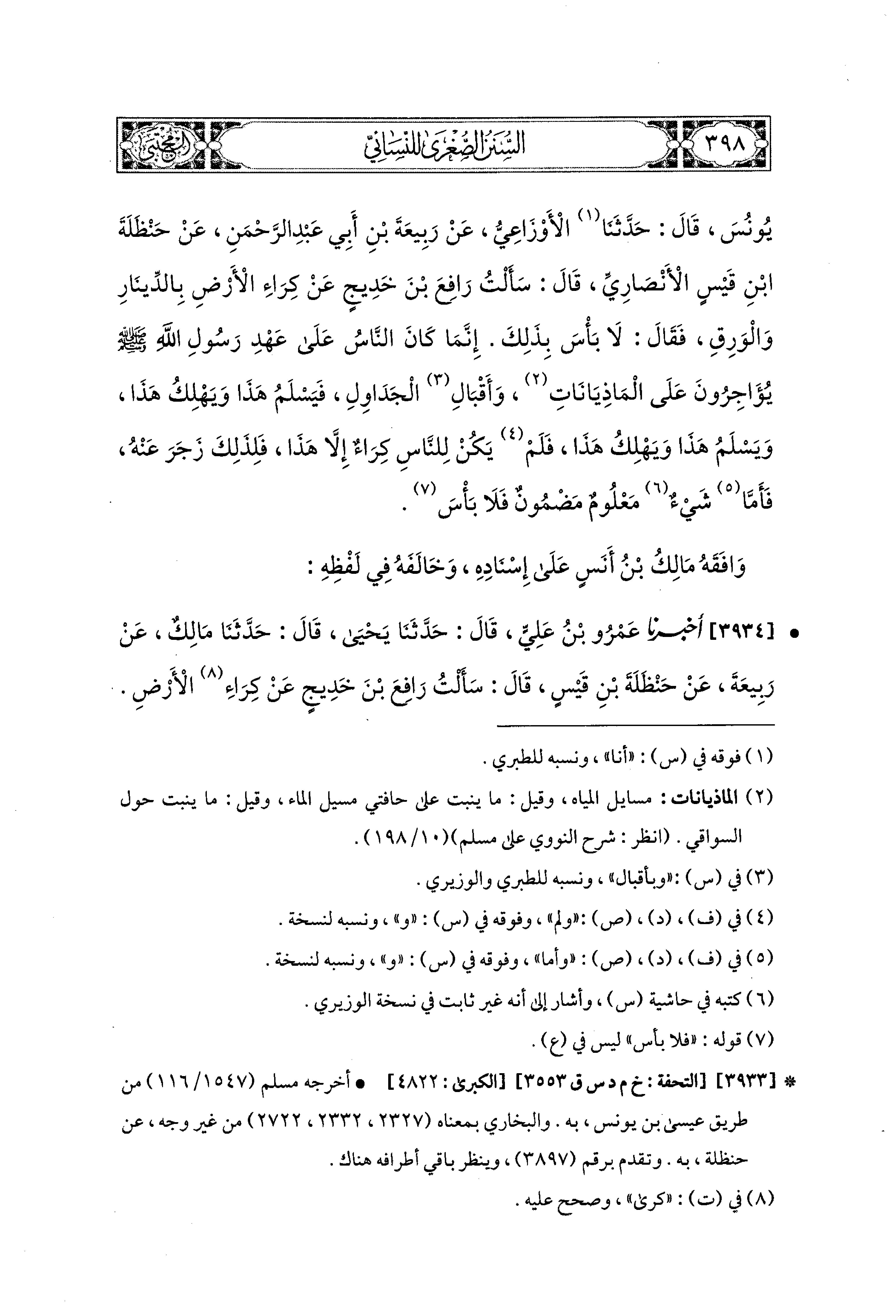 3934- أَخبَرَنا عَمْرُو بْنُ عَلِيٍّ، قال: حَدثنا يَحيَى، قال: حَدثنا مَالِكٌ، عَن رَبِيعَةَ، عَن حَنْظَلَةَ بْنِ قَيْسٍ، قَالَ: سَأَلْتُ رَافِعَ بْنَ خَدِيجٍ عَن كِرَاءِ الأَرضِ، فَقَالَ: نَهَى رَسُولُ اللهِ صَلى الله عَليه وسَلم عَن كِرَاءِ الأَرضِ.