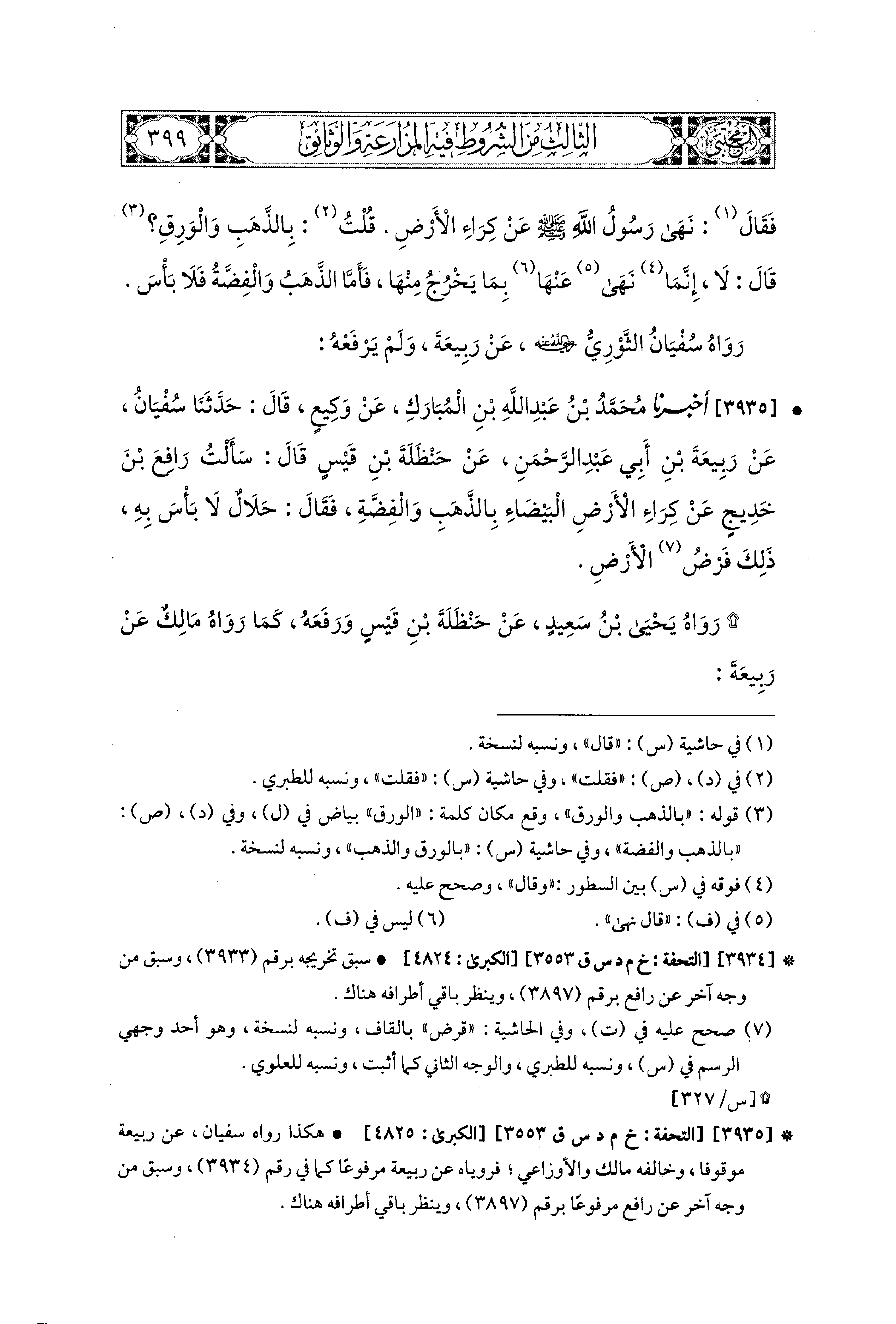3935- أَخبَرَنا مُحَمد بْنُ عَبدِ اللهِ بْنِ المُبَارَكِ، عَن وَكِيعٍ، قال: حَدثنا سُفْيَانُ، عَن رَبِيعَةَ بْنِ أَبِي عَبدِ الرَّحمَنِ، عَن حَنْظَلَةَ بْنِ قَيْسٍ، قَالَ: سَأَلْتُ رَافِعَ بْنَ خَدِيجٍ عَن كِرَاءِ الأَرضِ البَيْضَاءِ بِالذَّهَبِ وَالفِضَّةِ؟ فَقَالَ: حَلاَلٌ، لاَ بَأْسَ بِهِ، ذَلِكَ فَرْضُ الأَرضِ.