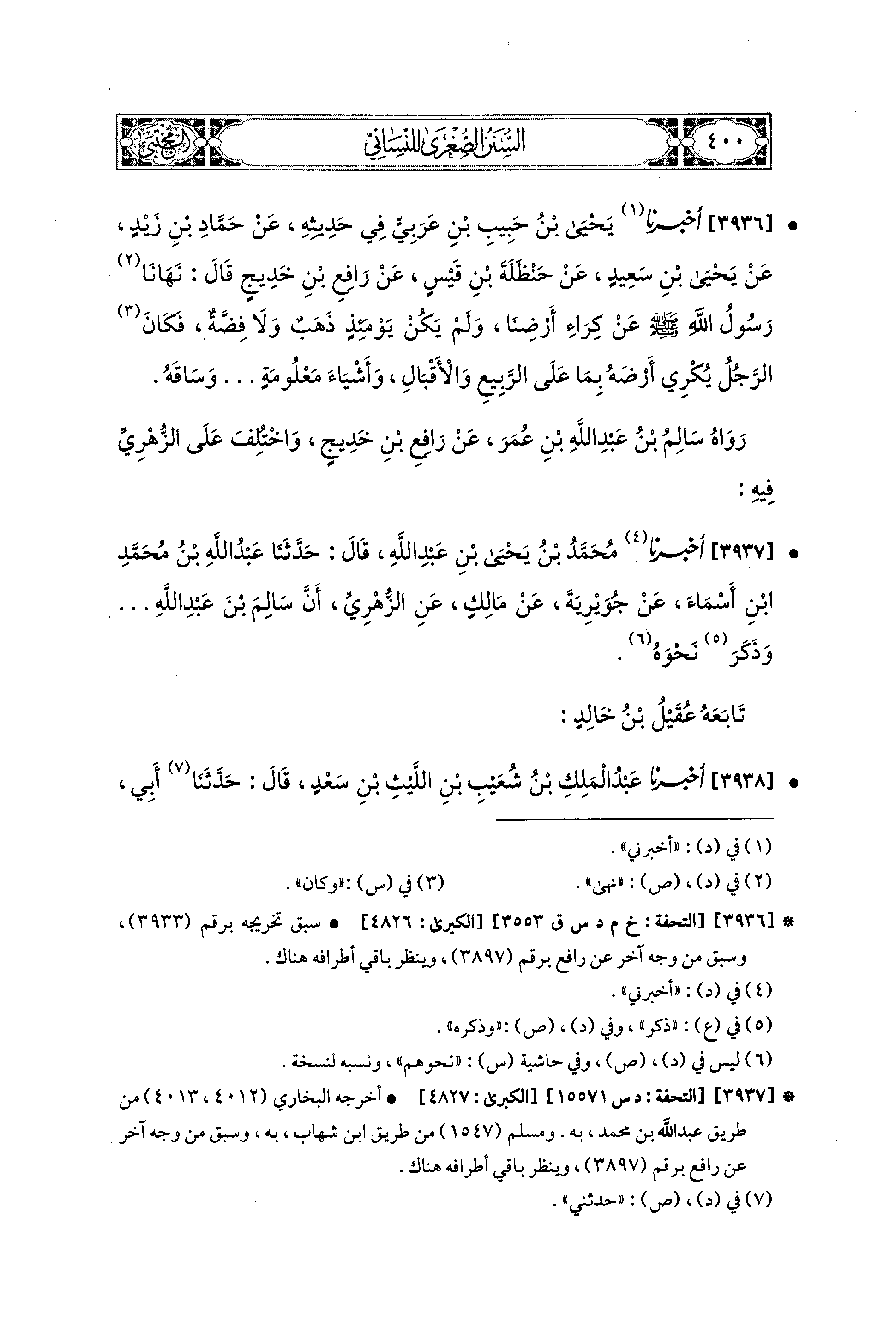 3936- أَخبَرَنا يَحيَى بْنُ حَبِيبِ بْنِ عَرَبِيٍّ فِي حَدِيثِهِ، عَن حَمَّادِ بْنِ زَيْدٍ، عَن يَحيَى بْنِ سَعيدٍ، عَن حَنْظَلَةَ بْنِ قَيْسٍ، عَن رَافِعِ بْنِ خَدِيجٍ قَالَ: نَهَانَا رَسُولُ اللهِ صَلى الله عَليه وسَلم عَن كِرَاءِ أَرْضِنَا، وَلَمْ يَكُنْ يَوْمَئِذٍ ذَهَبٌ وَلاَ فِضَّةٌ، فَكَانَ الرَّجُلُ يُكْرِي أَرْضَهُ، بِمَا عَلَى الرَّبِيعِ وَالأَقْبَالِ، وَأَشْيَاءَ مَعْلُومَةٍ ...وَسَاقَهُ.
