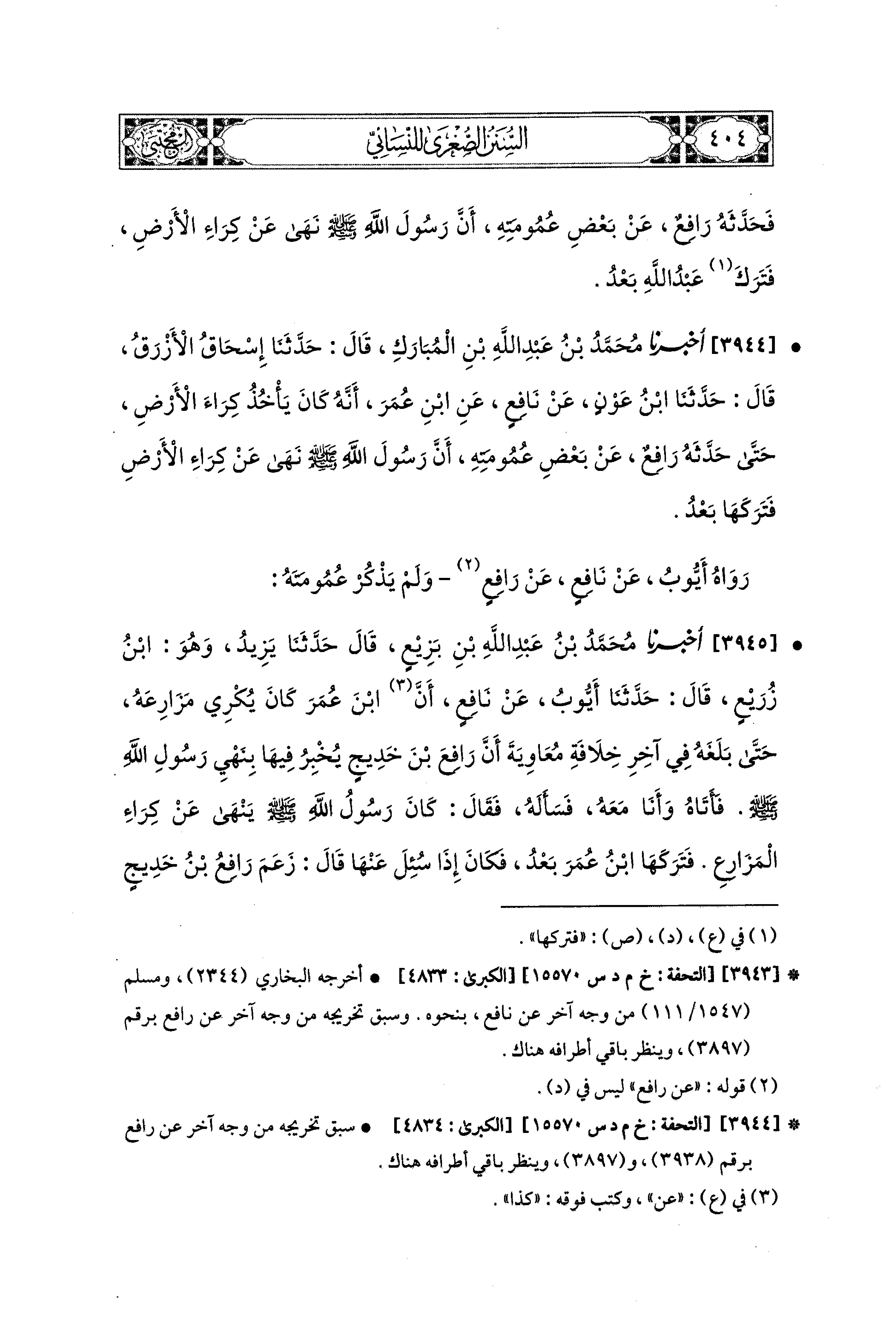 3944- أَخبَرَنا مُحَمد بْنُ عَبدِ اللهِ بْنِ المُبَارَكِ، قال: حَدثنا إِسحَاقُ الأَزْرَقُ، قال: حَدثنا ابْنُ عَوْنٍ، عَن نَافِعٍ، عَنِ ابنِ عُمَرَ أَنَّهُ كَانَ يَأْخُذُ كِرَاءَ الأَرضِ، حَتَّى حَدَّثَهُ رَافِعٌ، عَن بَعْضِ عُمُومَتِهِ، أَنَّ رَسُولَ اللهِ صَلى الله عَليه وسَلم نَهَى عَن كِرَاءِ الأَرضِ، فَتَرَكَهَا بَعْدُ.