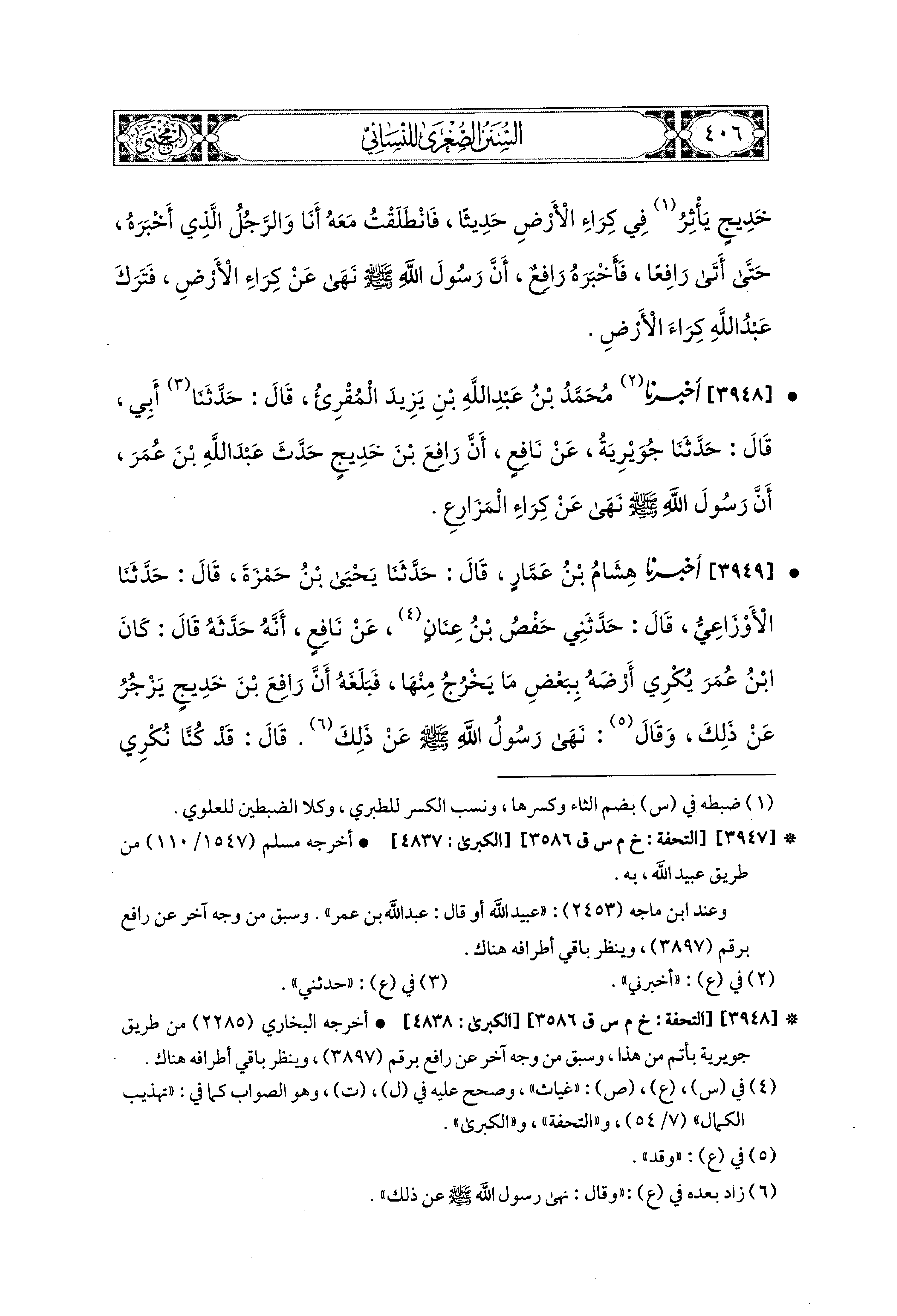 3948- أَخبَرَنا مُحَمد بْنُ عَبدِ اللهِ بْنِ يَزِيدَ المُقْرِئُ، قال: حَدثنا أَبِي، قال: حَدثنا جُوَيْرِيَةُ، عَن نَافِعٍ، أَنَّ رَافِعَ بْنَ خَدِيجٍ حَدَّثَ عَبدَ اللهِ بْنَ عُمَرَ أَنَّ رَسُولَ اللهِ صَلى الله عَليه وسَلم، نَهَى عَن كِرَاءِ المَزَارِعِ.