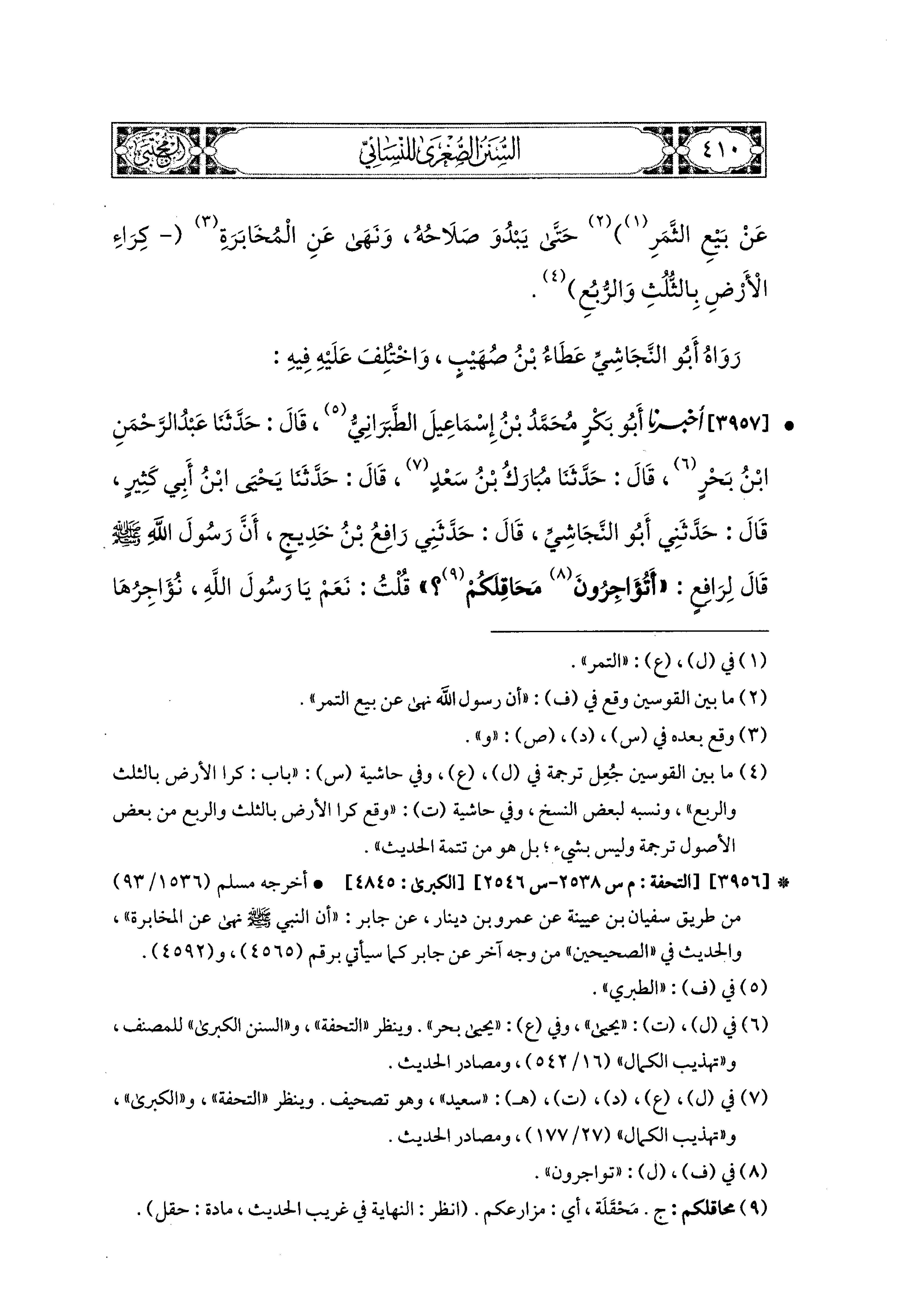 3957- أَخبَرَنا أَبو بَكْرٍ مُحَمدُ بْنُ إِسماعِيلَ الطَّبَرَانيُّ، قال: حَدثنا عَبدُ الرَّحمَنِ بْنُ بَحْرٍ، قال: حَدثنا مُبَارَكُ بْنُ سَعْدٍ، قال: حَدثنا يَحيَى بْنُ أَبِي كَثِيرٍ، قَالَ: حَدَّثَني أَبو النَّجَاشِيِّ، قَالَ: حَدَّثَني رَافِعُ بْنُ خَدِيجٍ، أَنَّ رَسُولَ اللهِ صَلى الله عَليه وسَلم قَالَ لِرَافِعٍ: أَتُؤَاجِرُونَ مَحَاقِلَكُمْ؟ قُلْتُ: نَعَمْ يَا رَسُولَ اللهِ، نُؤَاجِرُهَا عَلَى الرُّبُعِ، وَعَلَى الأَوْسَاقِ مِنَ الشَّعِيرِ، فَقَالَ رَسُولُ اللهِ صَلى الله عَليه وسَلم: لاَ تَفْعَلُوا، ازْرَعُوهَا، أَوْ أَعِيرُوهَا، أَوْ أَمْسِكُوهَا.