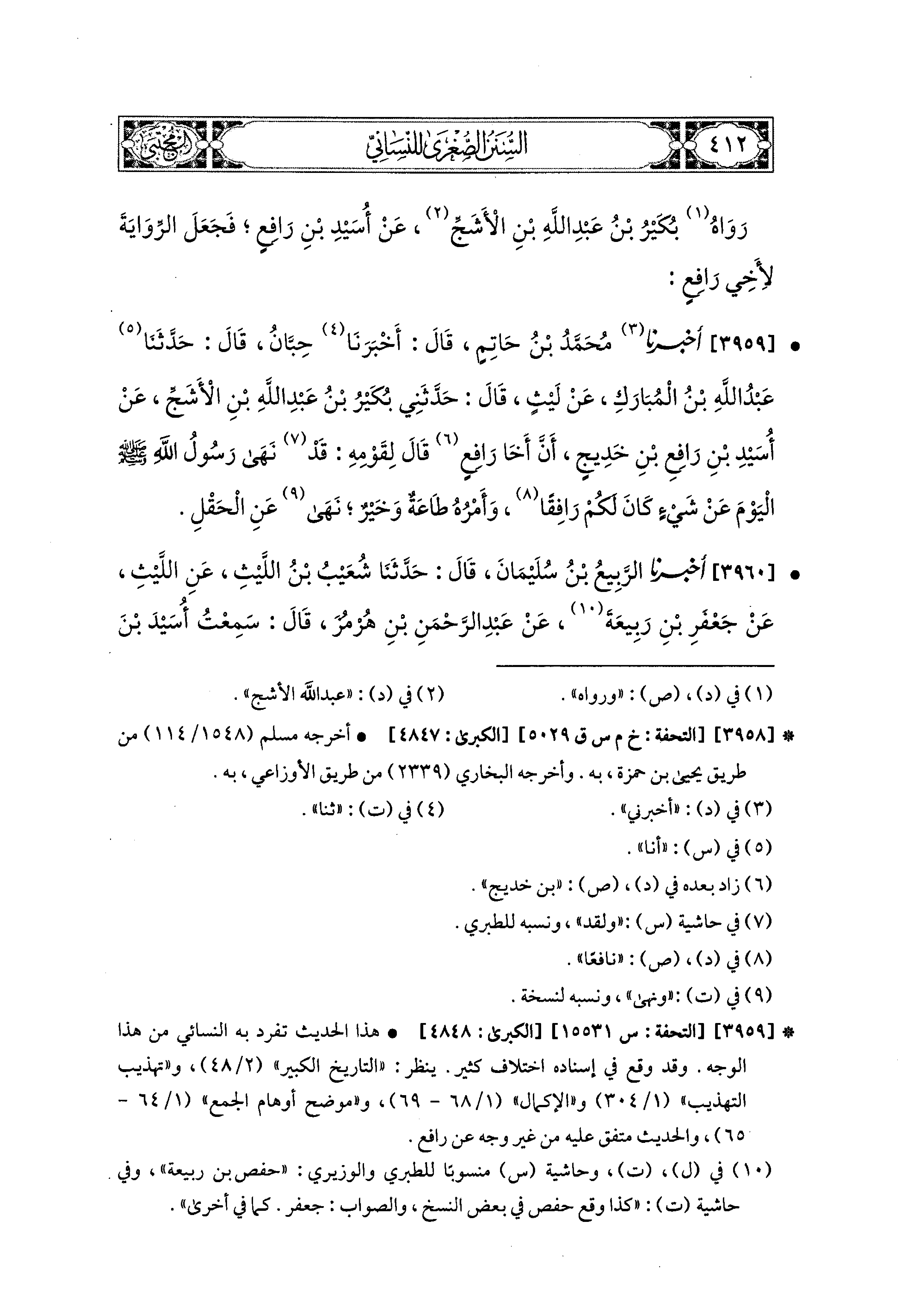 3960- أَخبَرَنا الرَّبِيعُ بْنُ سُلَيمَانَ، قال: حَدثنا شُعَيبُ بْنُ اللَّيْثِ، عَنِ اللَّيْثِ، عَن جَعْفَرِ بْنِ رَبِيعَةَ، عَن عَبدِ الرَّحمَنِ بْنِ هُرْمُزَ، قَالَ: سَمِعْتُ أُسَيْدَ بْنَ رَافِعِ بْنِ خَدِيجٍ الأَنصَارِيَّ يَذْكُرُ أَنَّهُمْ مَنَعُوا المُحَاقَلَةَ، وَهِيَ أَرْضٌ تُزْرَعُ عَلَى بَعْضِ مَا فِيهَا.