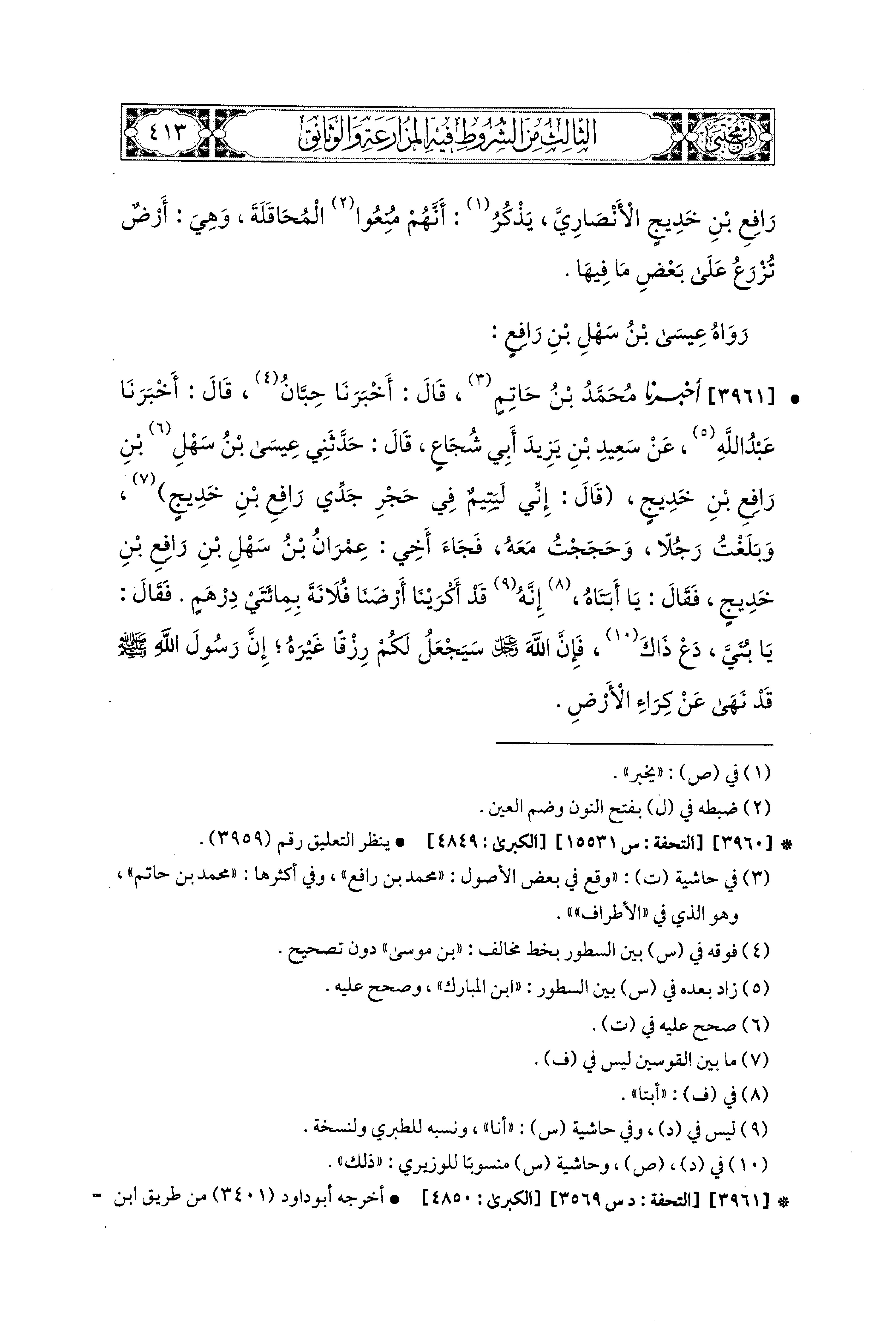 3961- أَخبَرَنا مُحَمد بْنُ حَاتِمٍ، قَالَ: أَخبَرنا حَبَّانُ، قَالَ: أَخبَرنا عَبدُ اللهِ، عَن سَعيدِ بْنِ يَزِيدَ أَبِي شُجَاعٍ، قَالَ: حَدَّثَني عِيسَى بْنُ سَهْلِ بْنِ رَافِعِ بْنِ خَدِيجٍ، قَالَ: إِنِّي لَيَتِيمٌ فِي حَجْرِ جَدِّي رَافِعِ بْنِ خَدِيجٍ، وَبَلَغْتُ رَجُلاً، وَحَجَجْتُ مَعَهُ، فَجَاءَ أَخِي عِمْرَانُ بْنُ سَهْلِ بْنِ رَافِعِ بْنِ خَدِيجٍ فَقَالَ: يَا أَبَتَاهُ، إِنَّهُ قَدْ أَكْرَيْنَا أَرْضَنَا فُلاَنَةَ بِمِائَتَيْ دِرْهَمٍ، فَقَالَ: يَا بُنَيَّ، دَعْ ذَاكَ، فَإِنَّ اللهَ عَزَّ وَجَلَّ سَيَجْعَلُ لَكُمْ رِزْقًا غَيْرَهُ، إِنَّ رَسُولَ اللهِ صَلى الله عَليه وسَلم قَدْ نَهَى عَن كِرَاءِ الأَرضِ.