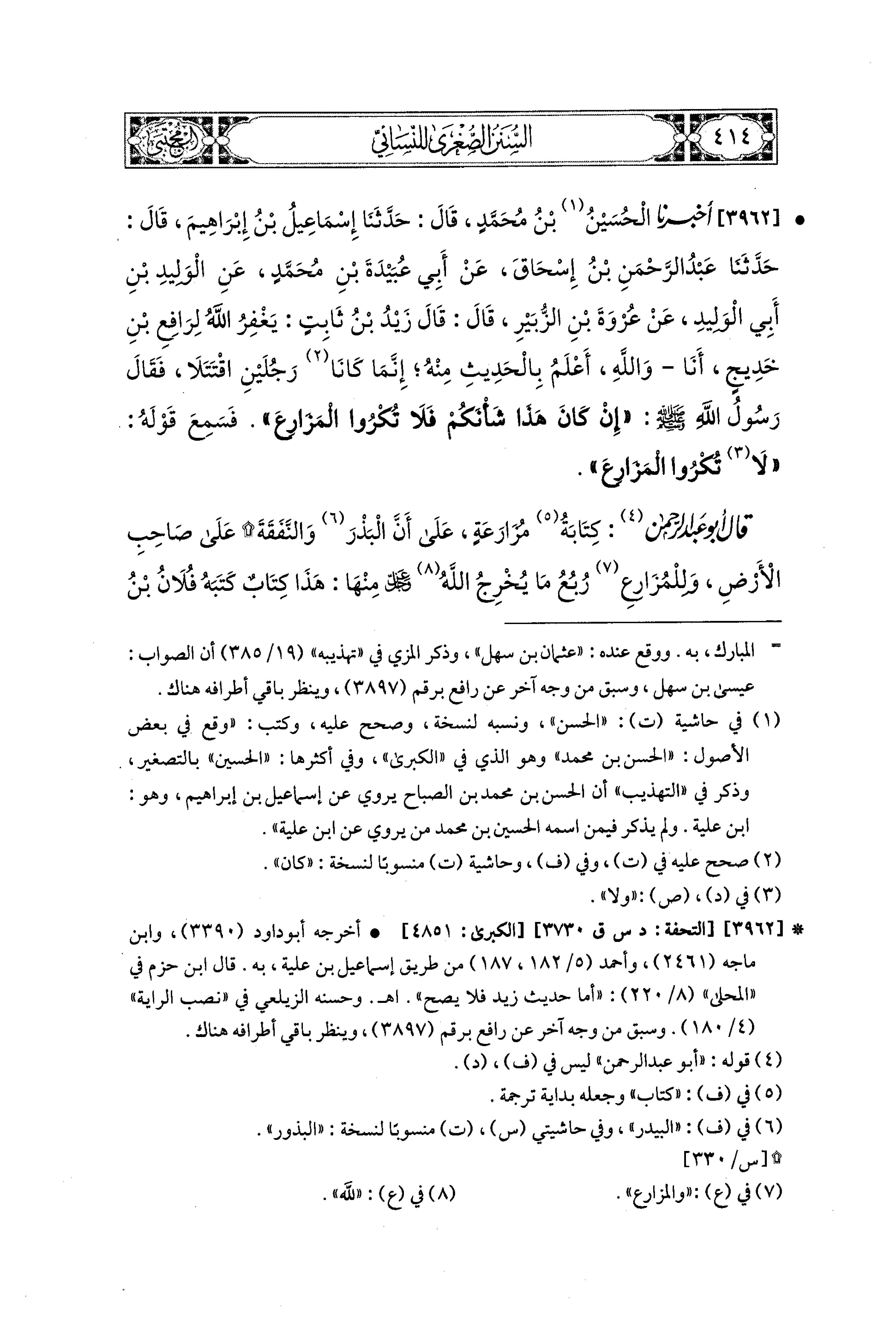 3962- أَخبَرَنا الحُسَيْنُ بْنُ مُحَمدٍ، قال: حَدثنا إِسماعِيلُ بْنُ إِبراهِيمَ، قال: حَدثنا عَبدُ الرَّحمَنِ بْنُ إِسحَاقَ، عَن أَبِي عُبَيدَةَ بْنِ مُحَمدٍ، عَنِ الوَلِيدِ بْنِ أَبِي الوَلِيدِ، عَن عُرْوَةَ بْنِ الزُّبَيْرِ قَالَ: قَالَ زَيْدُ بْنُ ثَابِتٍ: يَغْفِرُ اللهُ لِرَافِعِ بْنِ خَدِيجٍ أَنَا وَالله أَعْلَمُ بِالحَدِيثِ مِنْهُ، إِنَّمَا كَانَا رَجُلَيْنِ اقْتَتَلاَ، فَقَالَ رَسُولُ اللهِ صَلى الله عَليه وسَلم: إِنْ كَانَ هَذَا شَأْنُكُمْ فَلاَ تُكْرُوا المَزَارِعَ، فَسَمِعَ قَوْلَهُ: لاَ تُكْرُوا المَزَارِعَ.