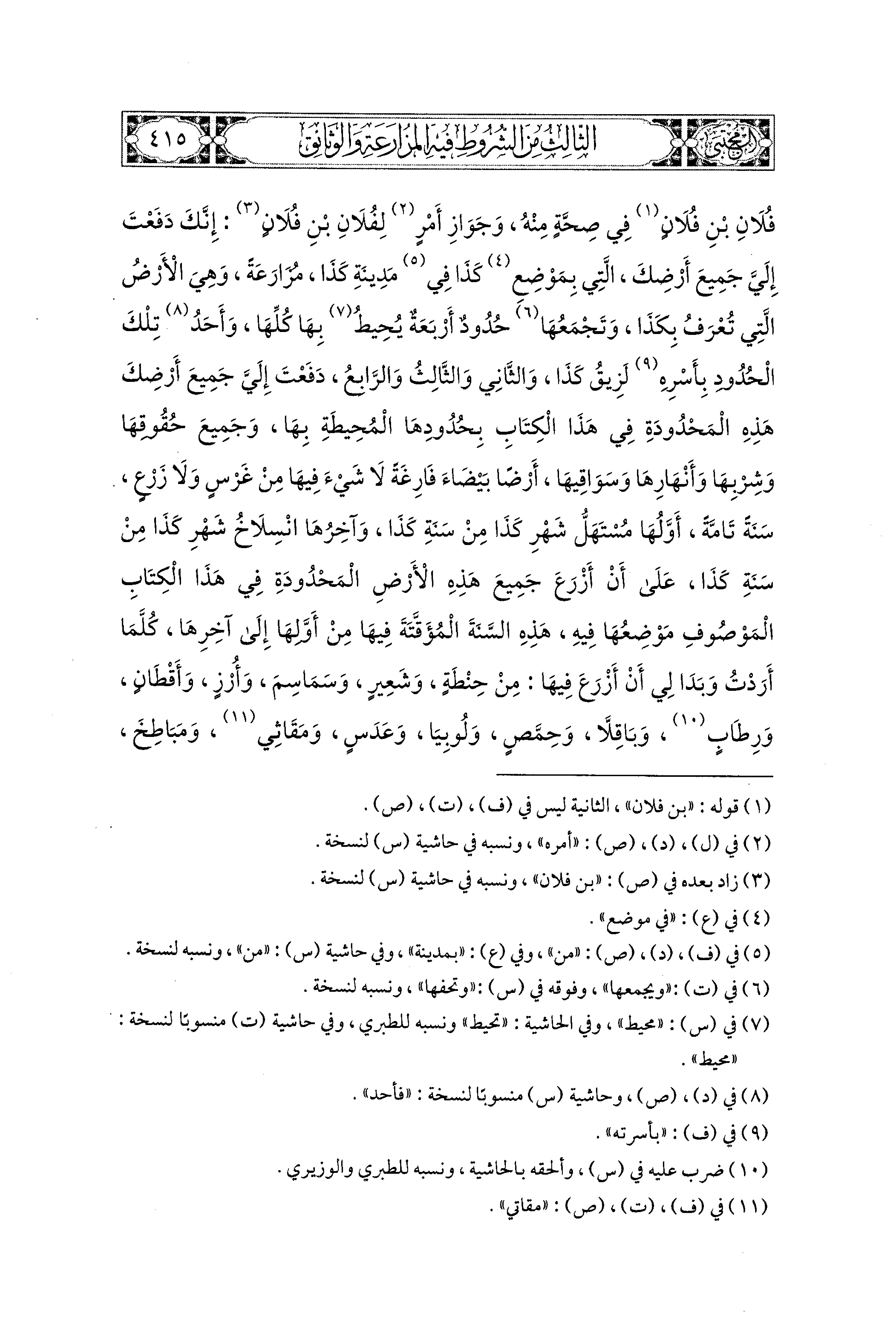 أَرْضًا بَيْضَاءَ فَارِغَةً لاَ شَيْءَ فِيهَا مِنْ غَرْسٍ، وَلاَ زَرْعٍ، سَنَةً تَامَّةً، أَوَّلُهَا مُسْتَهَلَّ شَهْرِ كَذَا، مِنْ سَنَةِ كَذَا، وَآخِرُهَا انْسِلاَخُ شَهْرِ كَذَا، مِنْ سَنَةِ كَذَا، عَلَى أَنْ أَزْرَعَ جَميعَ هَذِهِ الأَرضِ المَحْدُودَةِ فِي هَذَا الكِتَابِ المَوْصُوفُ مَوْضِعُهَا فِيهِ هَذِهِ السَّنَةَ المُؤَقَّتَةَ فِيهَا مِنْ أَوَّلِهَا إِلَى آخِرِهَا كُلَّ مَا أَرَدْتُ وَبَدَا لِي أَنْ أَزْرَعَ فِيهَا مِنْ حِنْطَةٍ، وَشَعِيرٍ، وَسَمَاسِمَ، وَأُرْزٍ، وَأَقْطَانٍ، وَرِطَابٍ، وَبَاقِلاَّ، وَحِمَّصٍ، وَلُوبْيَا، وَعَدَسٍ، وَمَقَاثِي، وَمَبَاطِخَ، وَجَزَرٍ، وَشَلْجَمٍ، وَفِجْلٍ، وَبَصَلٍ، وَثُومٍ، وَبُقُولٍ، وَرَيَاحِينَ، وَغَيْرِ ذَلِكَ مِنْ جَميعِ الغَلاَّتِ شِتَاءً وَصَيْفًا بِبُزُورِكَ، وَبَذْرِكَ، وَجَميعُهُ عَلَيْكَ دُوني عَلَى أَنْ أَتَوَلَّى بِيَدِي، وَبِمَنْ أَرَدْتُ مِنْ أَعْوَاني، وَأُجَرَائِي، وَبَقَرِي، وَأَدَوَاتِي، وَإِلَى زِرَاعَةِ ذَلِكَ، وَعِمَارَتِهِ، وَالعَمَلِ بِمَا فِيهِ نَمَاؤُهُ، وَمَصْلَحَتُهُ، وَكِرَابُ أَرْضِهِ، وَتَنْقِيَةُ حَشِيشِهَا، وَسَقْيِ مَا يُحْتَاجُ إِلَى سَقْيِهِ مِمَّا زُرِعَ، وَتَسْميدِ مَا يُحْتَاجُ إِلَى تَسْميدِهِ، وَحَفْرِ سَوَاقِيهِ، وَأَنْهَارِهِ وَاجْتِنَاءِ مَا يُجْتَنَى مِنْهُ، وَالقِيَامِ بِحَصَادِ مَا يُحْصَدُ مِنْهُ،