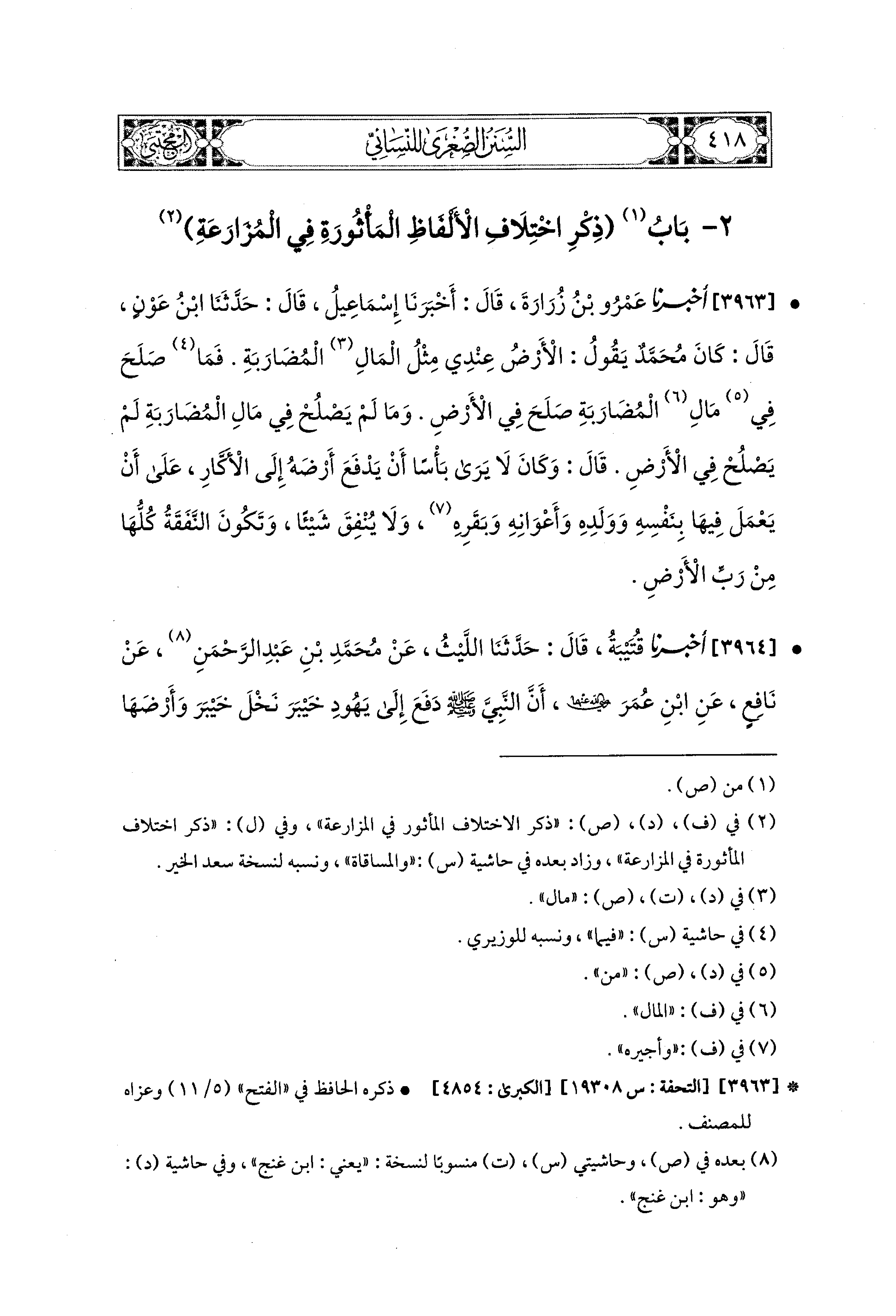 3964- أَخبَرَنا قُتَيبَةُ، قال: حَدثنا اللَّيْثُ، عَن مُحَمدِ بْنِ عَبدِ الرَّحمَنِ، عَن نَافِعٍ، عَنِ ابنِ عُمَرَ رَضِيَ اللهُ عَنْهُمَا، أَنَّ النَّبيَّ صَلى الله عَليه وسَلم دَفَعَ إِلَى يَهُودِ خَيْبَرَ نَخْلَ خَيْبَرَ، وَأَرْضَهَا، عَلَى أَنْ يَعْمَلُوهَا مِنْ أَمْوَالِهِمْ، وَأَنَّ لِرَسُولِ اللهِ صَلى الله عَليه وسَلم شَطْرَ مَا يَخْرُجُ مِنْهَا.